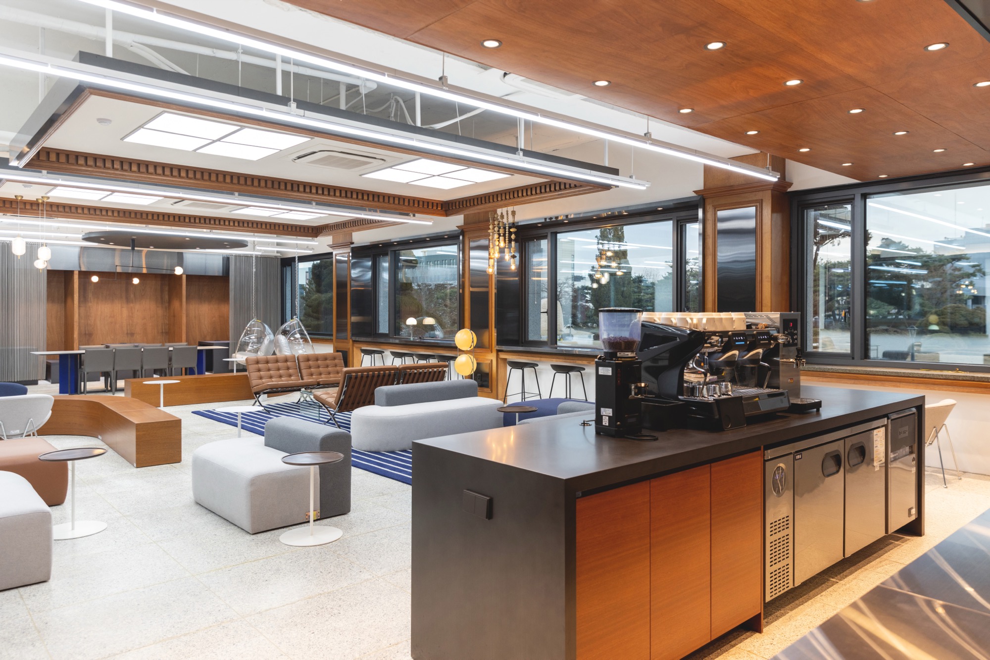 카페 라운지는 장애인 바리스타가 상주하는 개방형 카페로, 아일랜드 테이블과 주방가구로 카페 공간을 구성했다. 카페라운지는 천정 구조물을 설치하고 색상을 달리하여 분리된 느낌을 줬다. 영역이 분리되어 보이지만 벽으로 공간이 나눈 것이 아니기에 답답하지 않다.