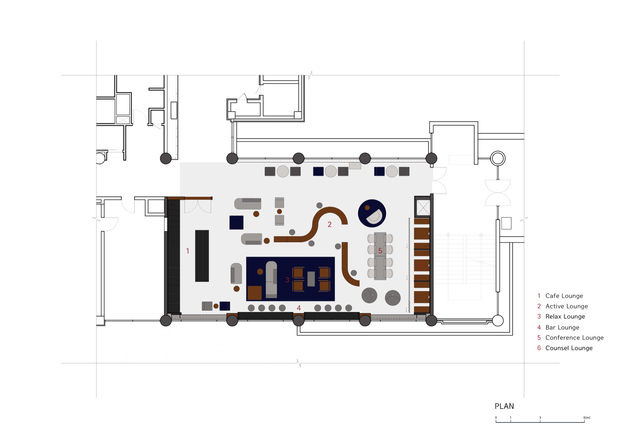 릴랙스 라운지에는 액티브 라운지보다는 좀 더 정적인 공간으로 소파와 4인 테이블, 2인 테이블, 러그 등을 두어 편안하게 담소를 나눌 수 있는 공간으로 계획했다. 한 공간 안에 다양한 성격의 휴식공간을 구성하여 다채로운 커뮤니티가 일어날 수 있도록 구성했다.