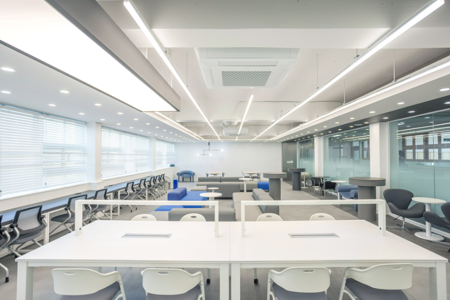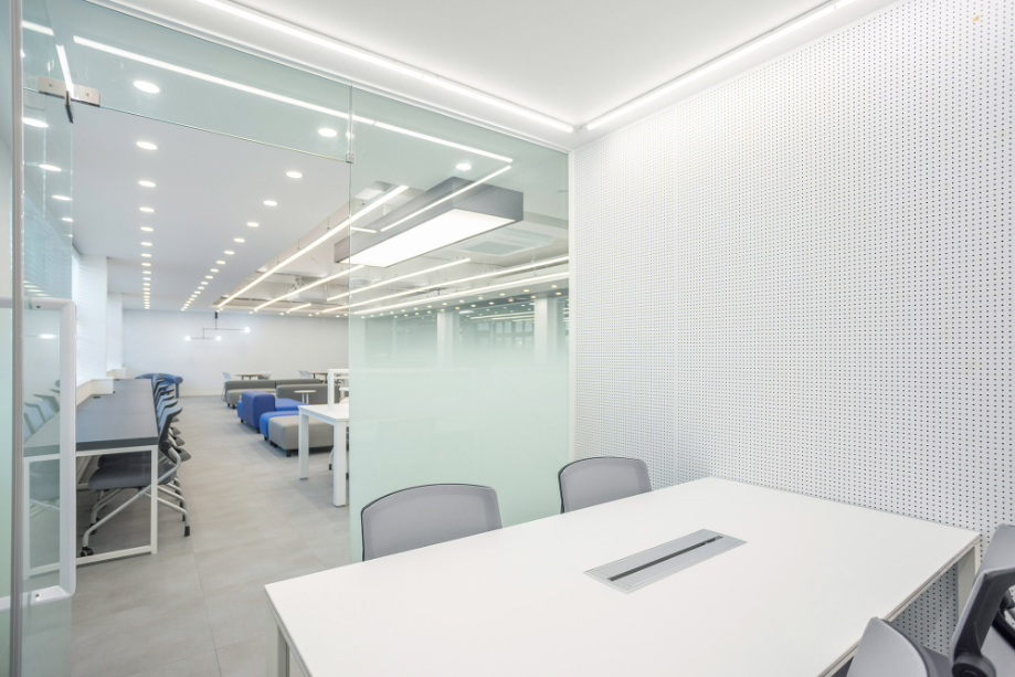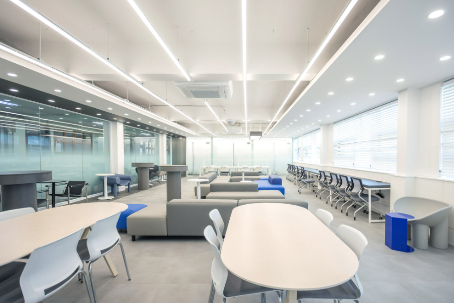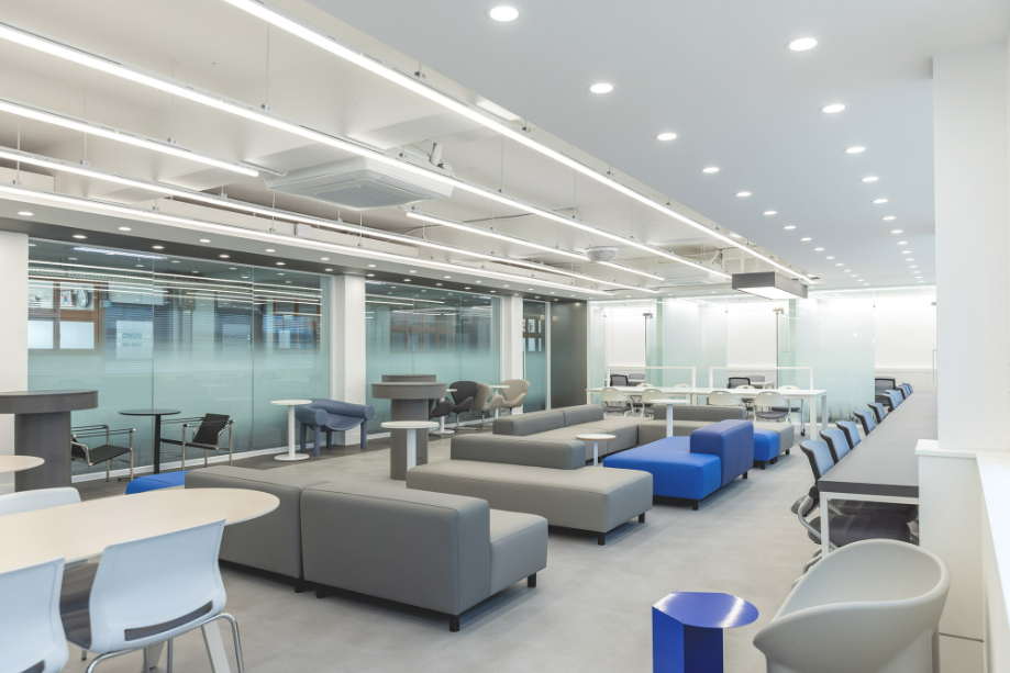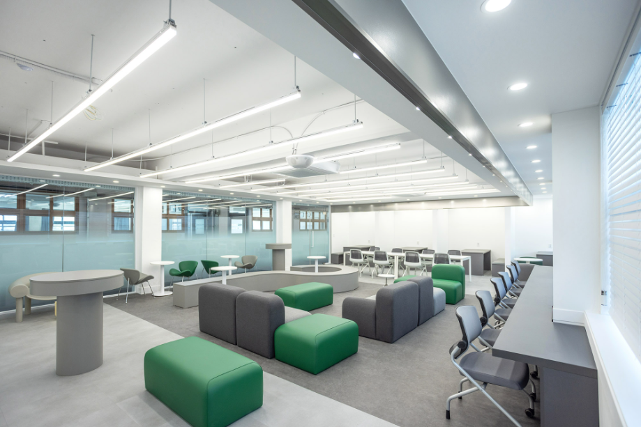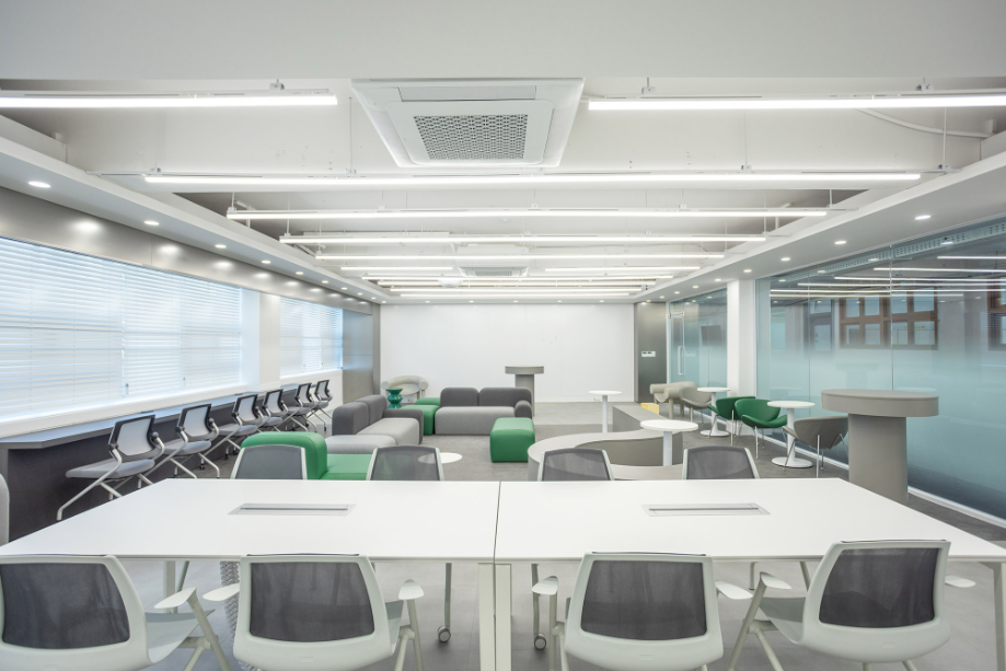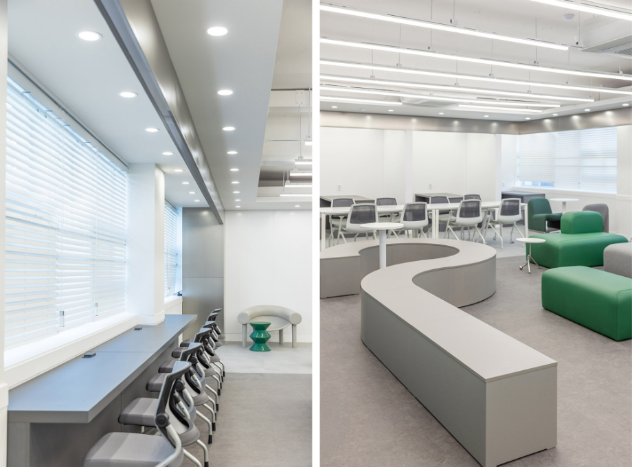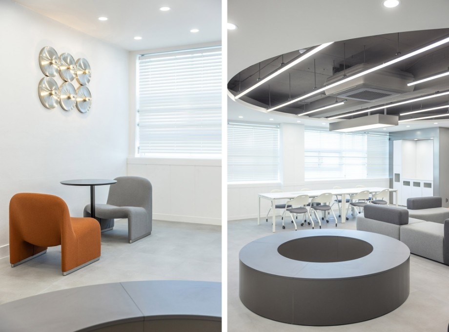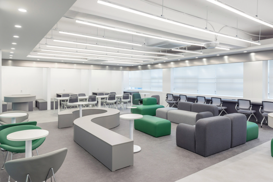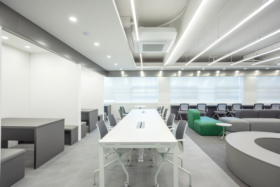 개인 학습공간 벽에서 시작한 구조물은 바 테이블 위를 지나가며 공간을 연결하며 초록색의 가구들과 구조물을 통해 공간의 통일감을 주고자 했다. 바 테이블에서부터 바닥 그리고 복도까지 이어지는 면은 진회색의 P-Tile을 사용하여 공간의 연속성을 강조하고자 했다. 그리고 복도 측 벽체를 철거하고, 유리를 설치하여 개방감을 확보하려 했다.
