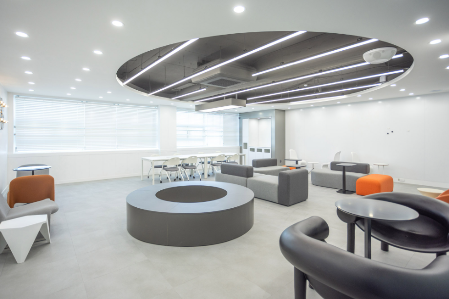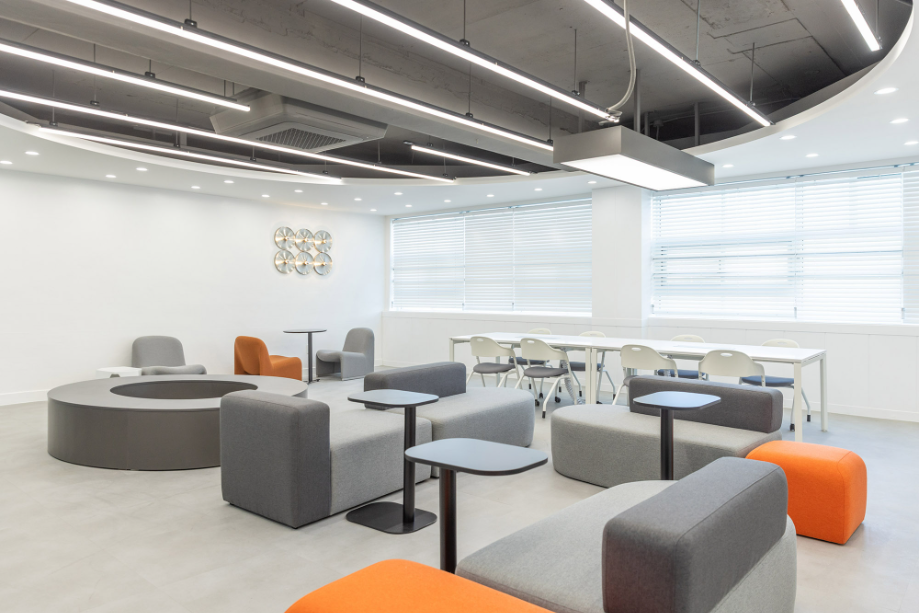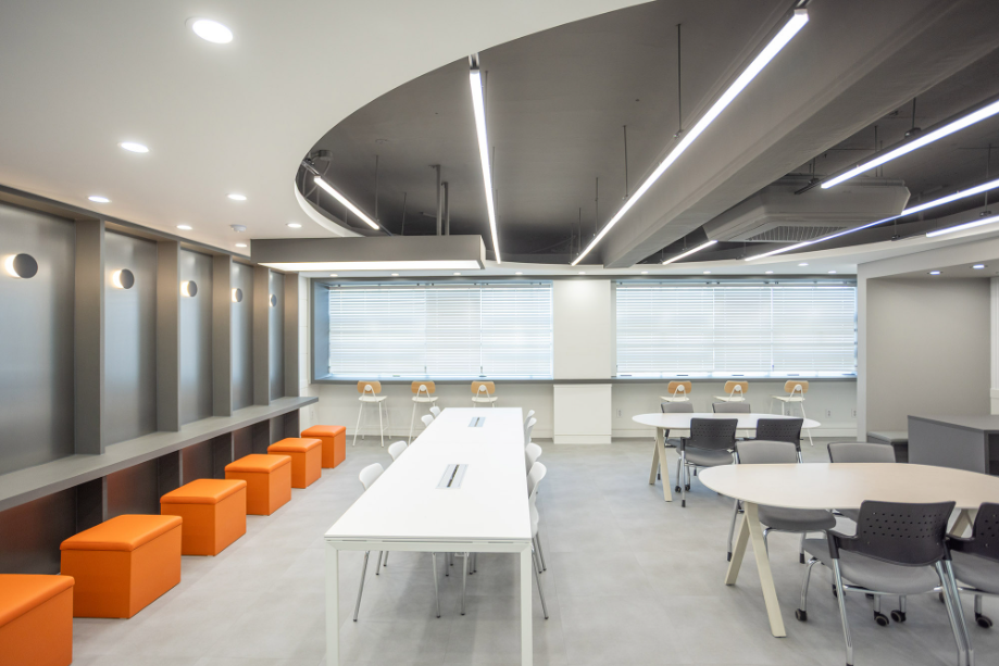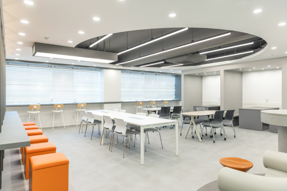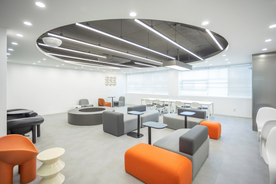 학습 컨셉의 홈베이스는 개방형 학습 공간으로 다양한 공부 환경으로 설계했다. 얕은 칸막이로 나누어져 있는 개인 학습공간과, 벽으로 구분되는 부스 타입의 공부 또는 상담 공간, 바 테이블, 스텐딩 테이블 등 다양한 학습 환경을 제공하고자 했다. 그리고 원형 천장구조물과 원형 바닥 패턴, 오렌지색으로 포인트 가구를 두어 공부만 하는 공간이라고 딱딱하게 느껴지지 않도록 했다.◼︎