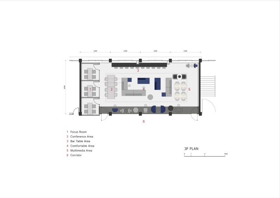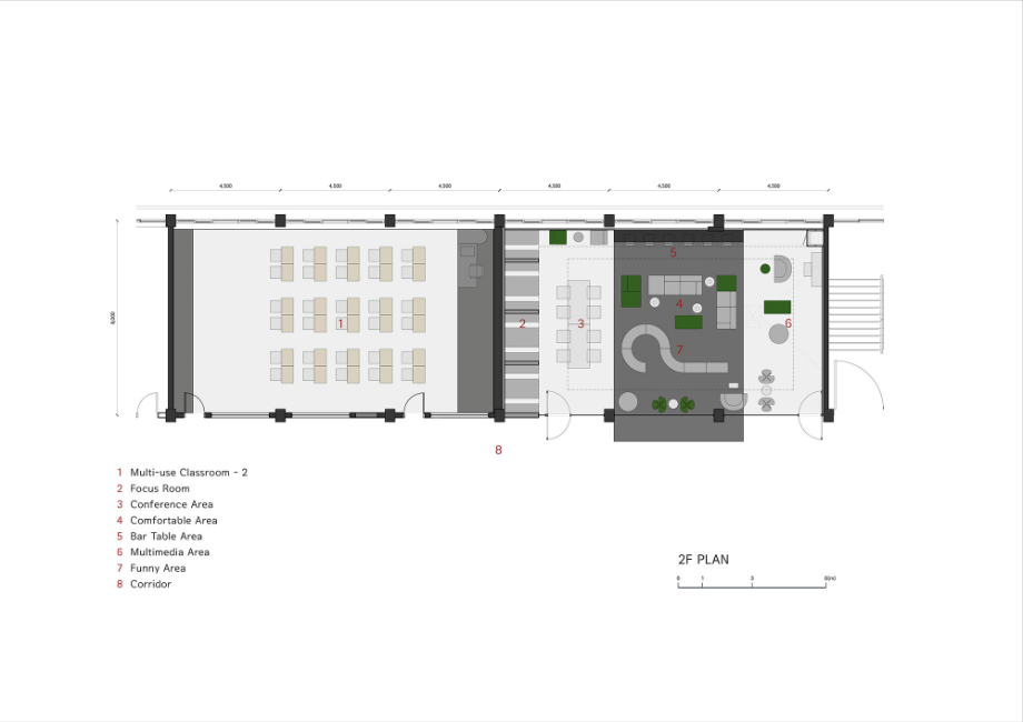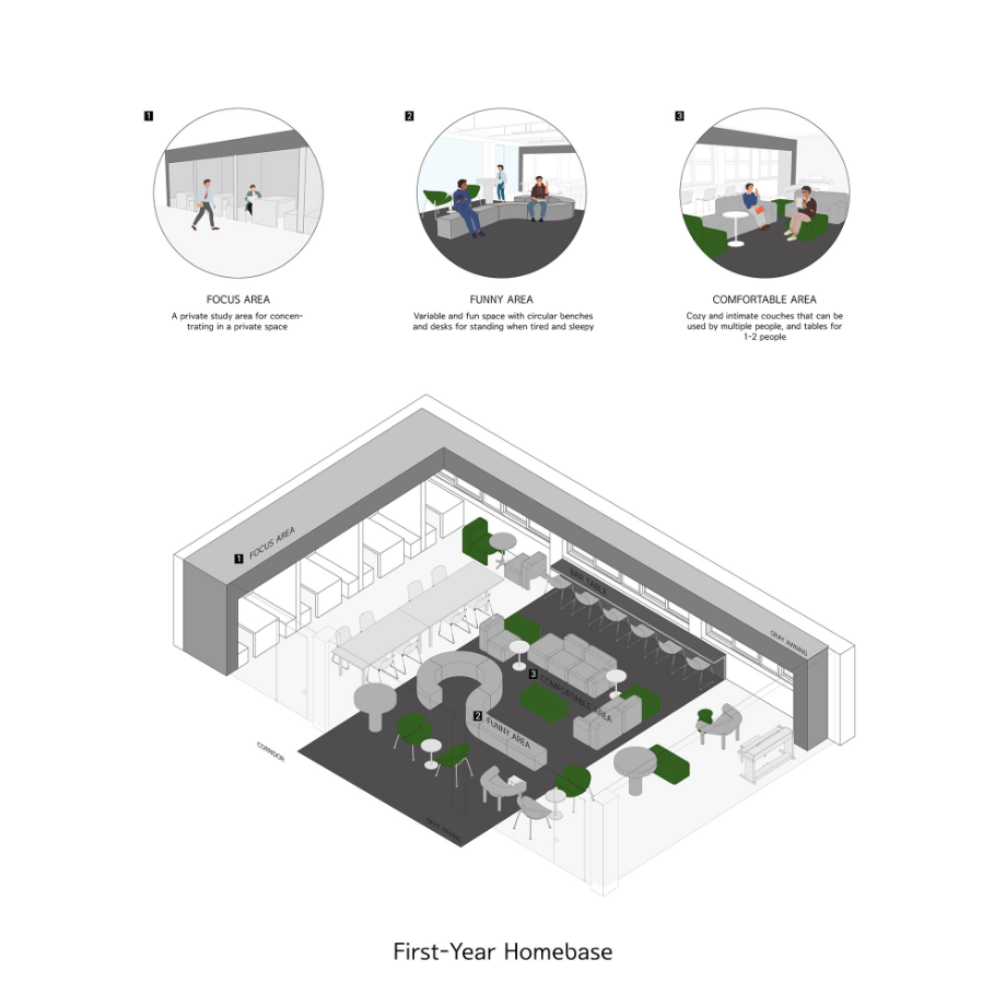 송곡고등학교는 고교학점제 도입으로 학생들의 이동 수업에 대비하여 기존에 있던 교실을 재구성하고자 했다. 각 학년에 맞춰 '홈베이스(Homebase)' 를 조성하여 학생들이 자유롭게 학습하고 휴식할 수 있는 환경을 제공하고자 했다. 2층부터 5층까지 학년 별로 수용할 수 있는 공간을 계획했고, 휴식과 공부 중 자신의 목적에 따라 자유롭게 활용할 수 있는 공간을 마련했다.