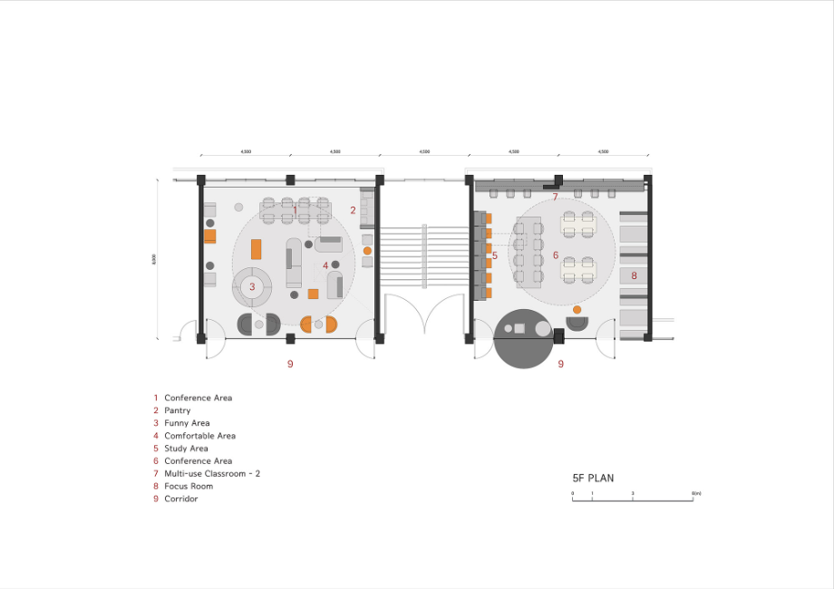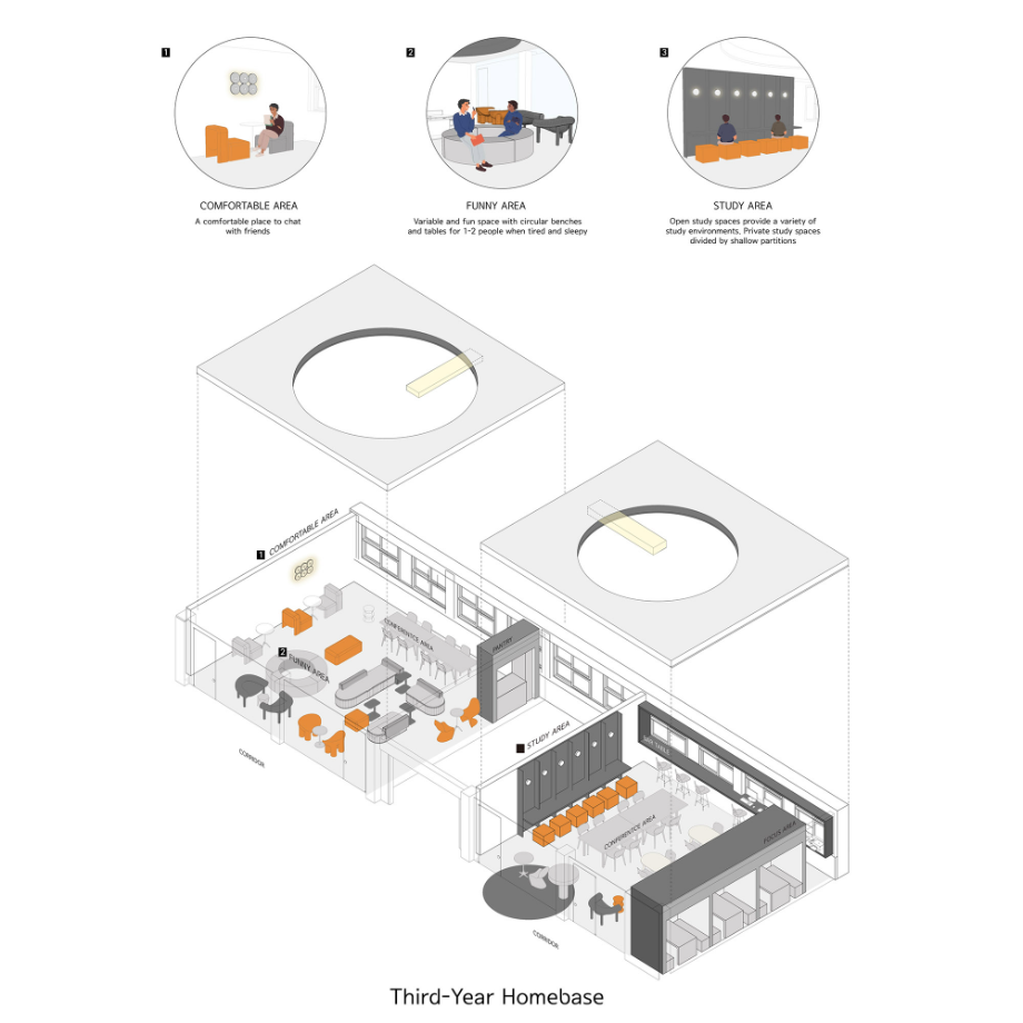 5층은 상담실과 수학교실이 있었던 공간을 두 개의 3학년 홈베이스로 나누어 사용하도록 했다. 3학년 공간은 휴식공간과 학습공간을 나누어 집중과 쉼의 공간을 분리하고자 했다. 휴식 컨셉의 홈베이스는 원형벤치, 소파, 1~2인용 테이블, 다인용 책상을 두어 편안한 분위기를 조성했으며, 원형의 천장 구조물을 설치하여 자유로운 분위기를 주고자 했다.