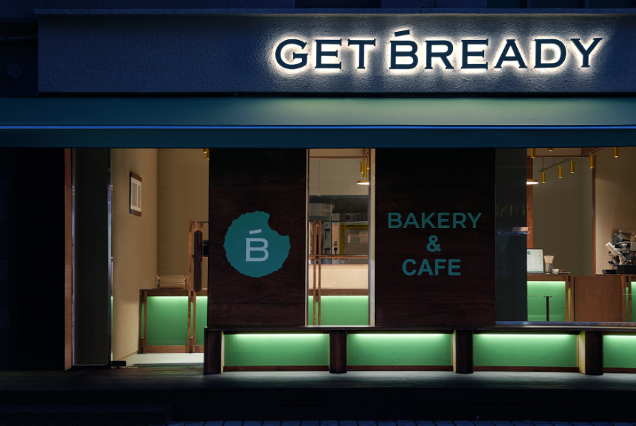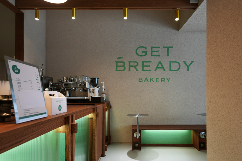 '겟브레디 베이커리'의 공간은 오픈 주방과 목구조 빵 매대를 중심으로 구성됐다. 브랜드 컬러인 민트그린·크림·다크브라운은 단순한 색채 적용을 넘어서서 재료·구조·조명으로 번역해 공간에 자연스럽게 스며들도록 했다. 크림톤 스타코 마감의 벽체는 부드러운 배경이 되고, 레드오크 원목 매대와 가구는 다크브라운의 따뜻함을 더한다. 마지막으로, 브랜드의 상징인 민트 컬러와 은은한 간접조명이 어우러져 브랜드와 공간이 하나로 조화를 이루는 장면을 완성했다.
