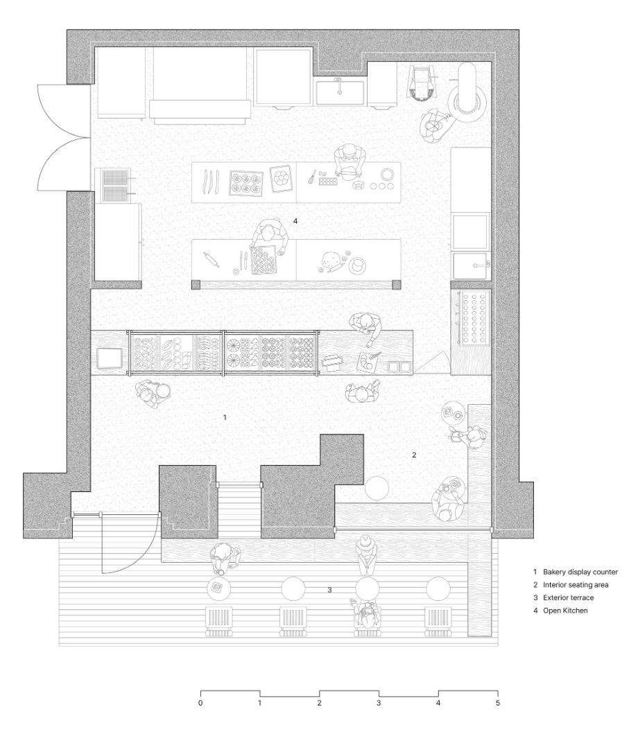 대형 오븐과 집기류가 전체 면적의 60%를 차지하는 베이커리 주방 특성상 작은 베이커리는 공간의 구성이 쉽지 않은 것이 사실이다. 우리는 작지만 넓고, 그 안에서 단순히 구매뿐만 아니라 제빵의 모든 과정을 경험할 수 있는 공간을 만들고 싶었다. 벽체 중간에 시선을 관통시키는 큰 보이드를 두어 오픈 주방을 구성했고, 하나의 작은 동선을 통해 효율적으로 빵 구매/제조체험/취식의 경험을 할 수 있도록 작지만 다채롭게 공간을 디자인 했다. 손님은 매대 앞에서 빵을 선택 하면서도 반죽–성형–굽기의 과정을 자연스럽게 보게 되며 결과물의 단순한 ‘판매’가 아니라 제작의 과정이 공간 경험의 일부가 되도록 계획했다.