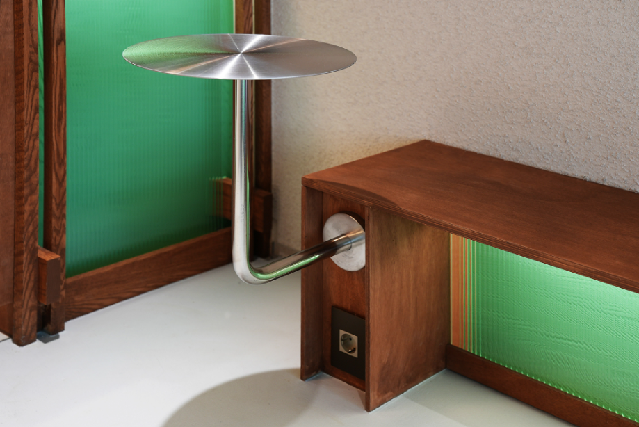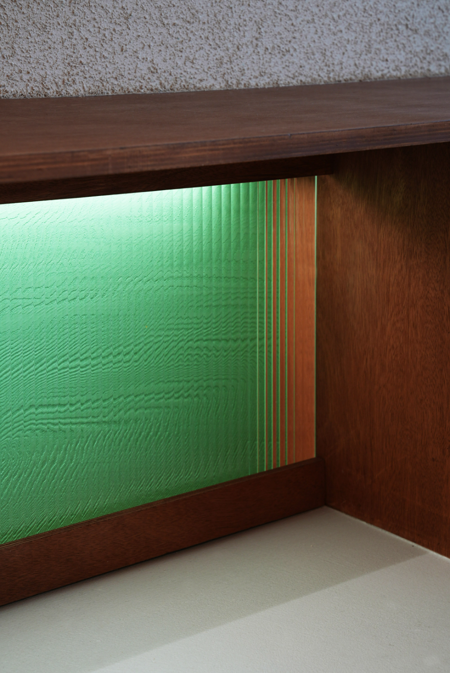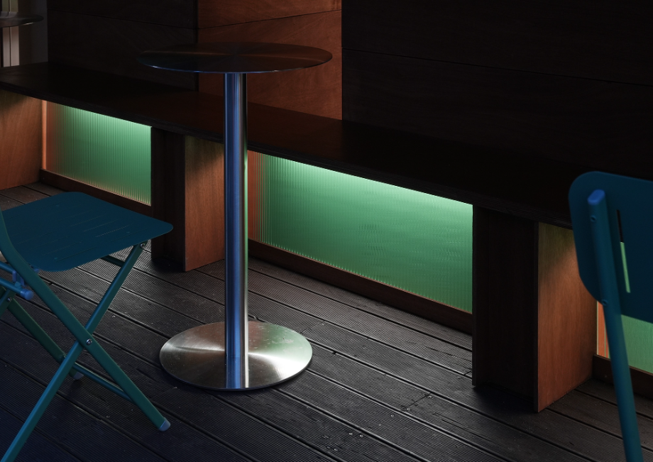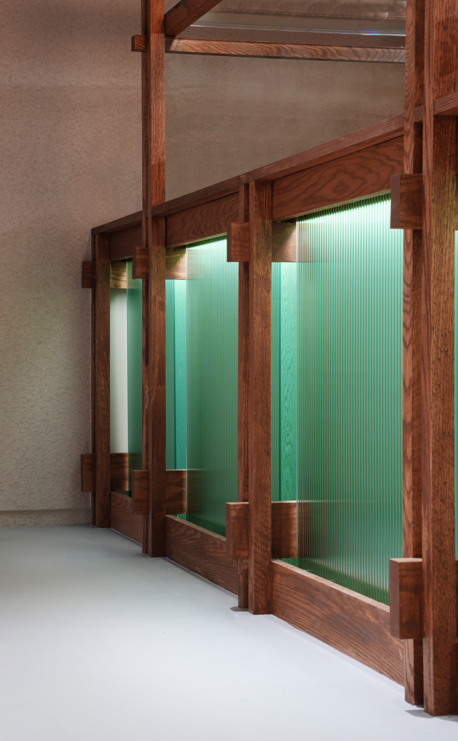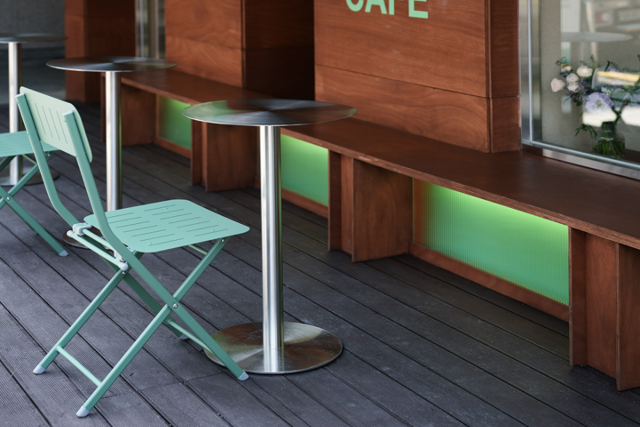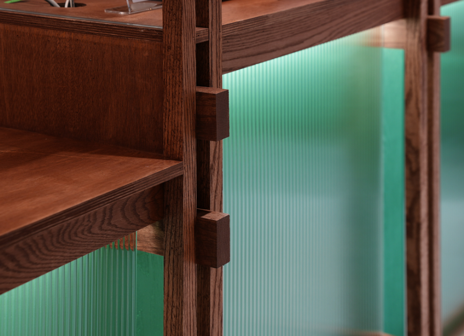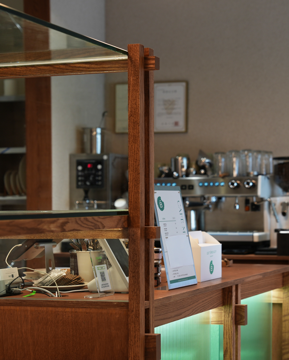 '겟브레디'의 매대는 단순 진열가구가 아니라 작은 구조체다. 목조건축에서 착안한 레드오크 구조 프레임 위에 투명 유리를 얹어, 목구조의 아름다움을 드러내는 한편 진열된 빵이 시각적으로 가볍고 선명하게 보이도록 디자인 했다. 특히 매대 하부의 목조 프레임 사이에는 민트색 낙엽송–간접조명–모루유리가 레이어를 만들며 은은하고 독특한 민트색 공간감을 만들어 낸다.