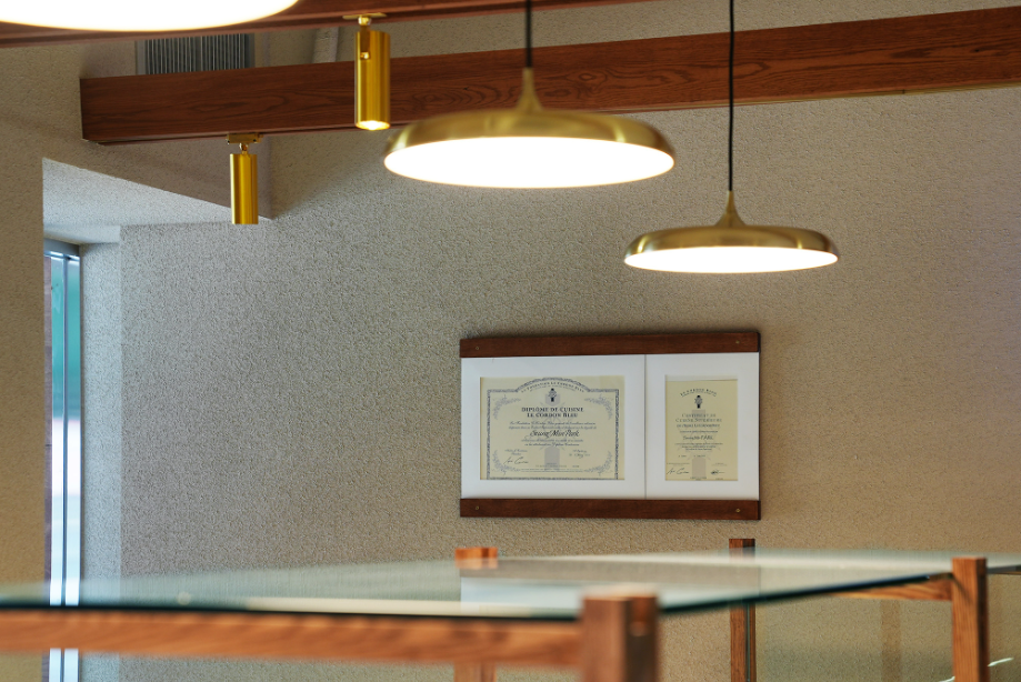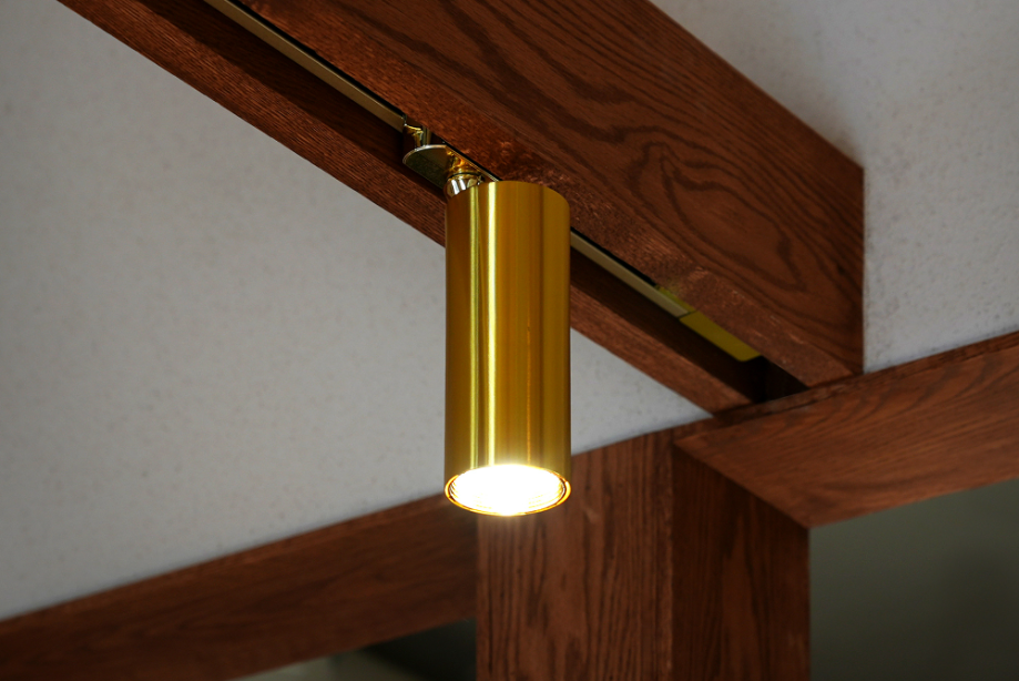 낙엽송은 무늬가 양각으로 돌출되어 있고 모루유리 역시 물결무늬 요철이 있어 두 패턴이 민트색과 간접조명을 만나면서 오묘한 패턴과 색감을 내뿜으며 공간과 브랜드의 정체성을 보여준다. 추가적으로 공간 상부엔 목구조 보를 천장에 노출해 구조미를 더하고, 보를 따라 브라스 컬러의 레일과 골드 조명을 매칭하여 우아한 공간감을 만들었다.