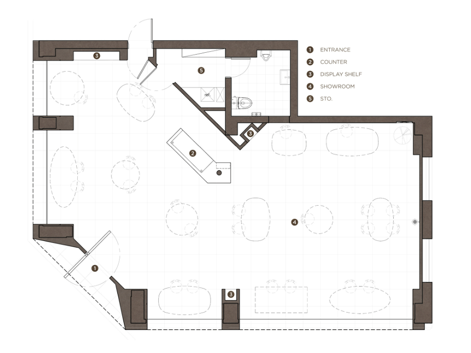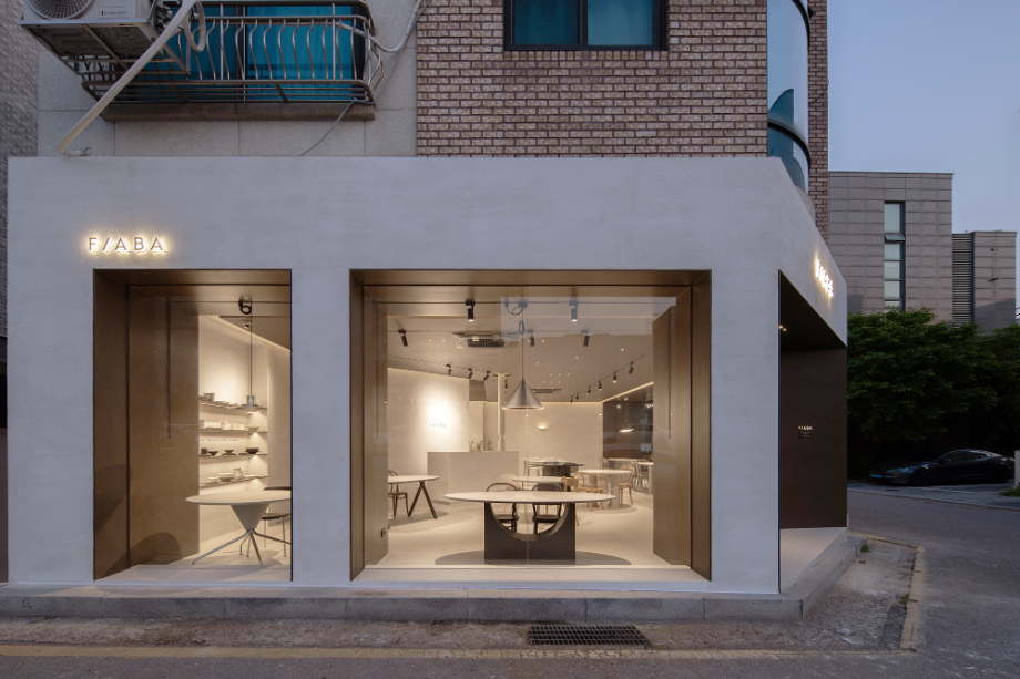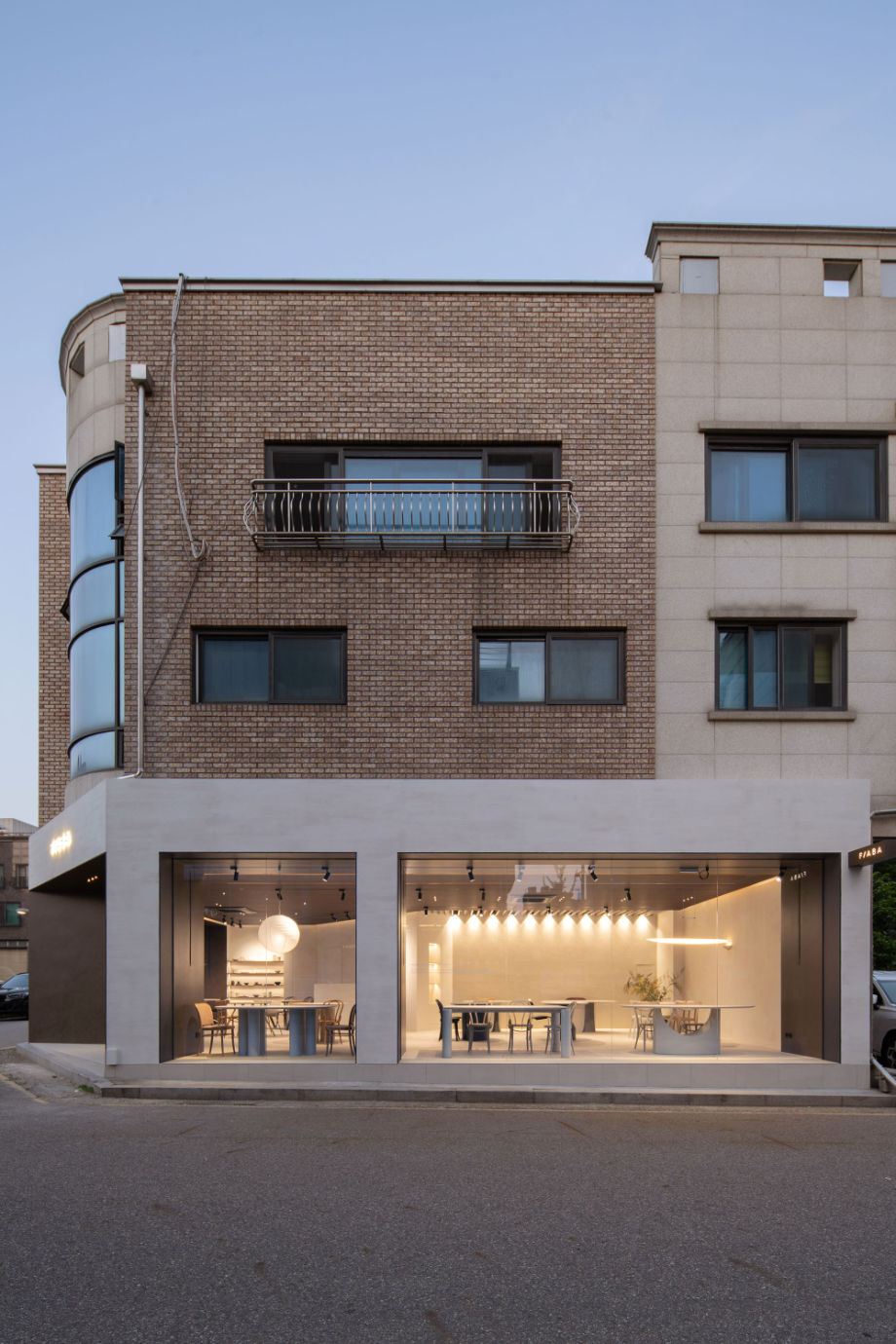 30평 정도의 작은 쇼룸이지만, 설계팀은 한정된 공간 안에서 강렬한 첫인상을 주고자 3M의 도어를 설치하며 깊이있는 컬러와 질감을 더하여 입구를 하나의 매스로 인식시키고자 했다. 측면 창들의 프레임은 건물의 기존 기둥과 연계하여 하나의 조형적 화면을 완성하였다. 파사드의 넓은 쇼윈도를 통해 낮에는 자연광을 끌어들이고, 밤에는 쇼룸 내부의 빛을 확산하여 내외부, 주야간에 관계없이 가구가 돋보일 수 있게 계획했으며 이를통해 브랜드의 존재감을 드러내고자 했다.