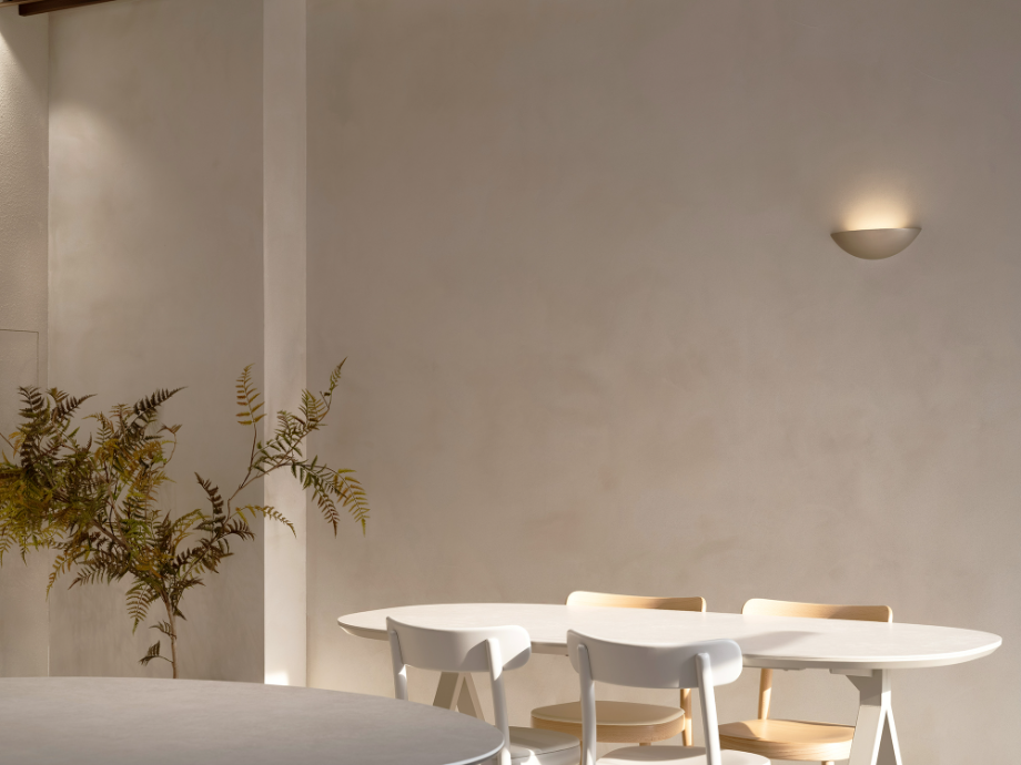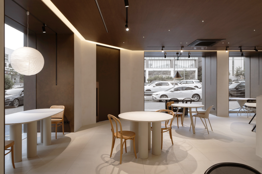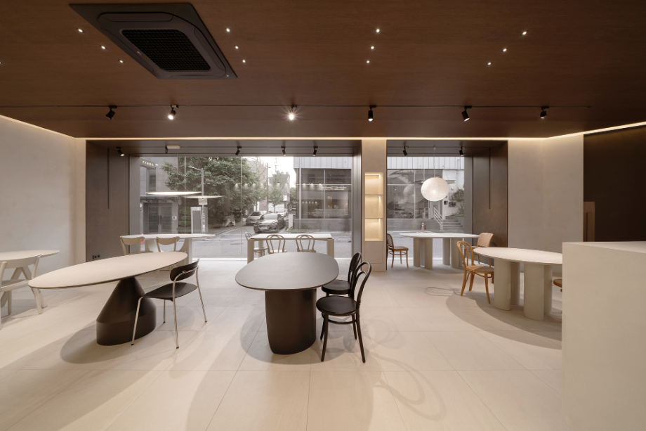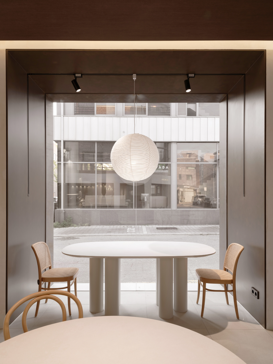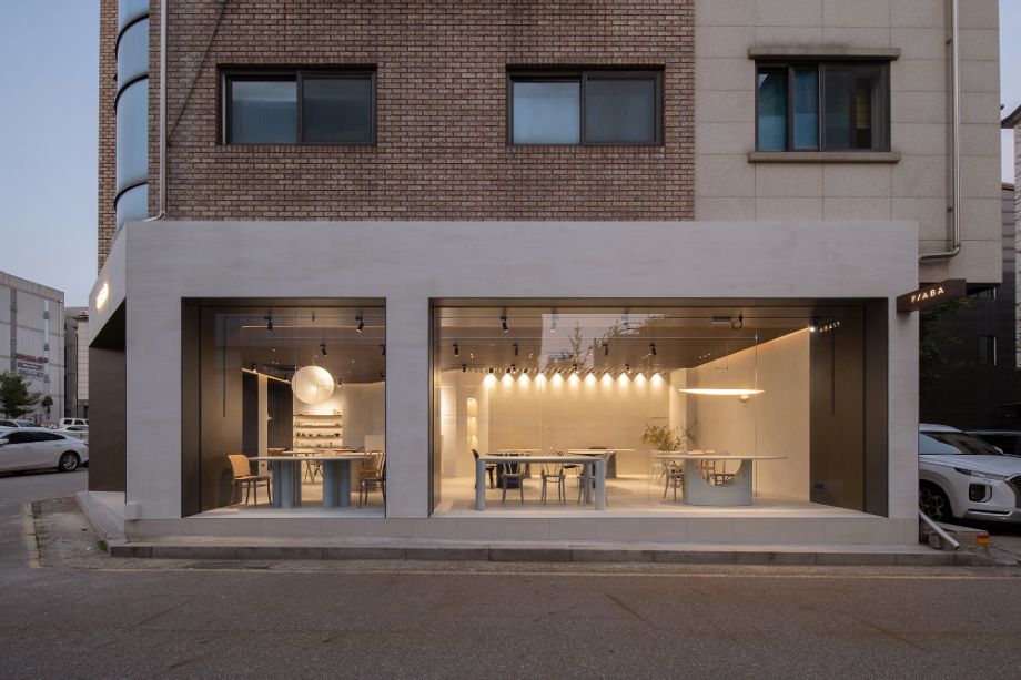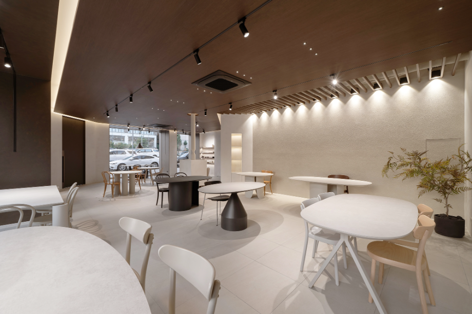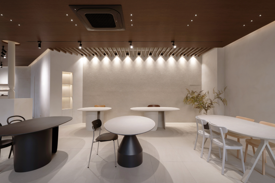 내부는 사선으로 기울어진 파사드 라인과 평행을 이루도록 카운터를 배치하여 쇼룸을 방문하는 고객이 들어서는 순간 가장 먼저 마주하는 공간의 중심이 되도록 설계했다. 또한, 피아바 가구의 정교한 디테일을 기둥 디자인에 반영하여 브랜드의 정체성을 담아냈다. 쇼윈도 창과 전면으로 마주하는 벽면은 빛과 질감의 대비를 통해 깊이감을 더하고 천장의 우드 루버를 통해 확산된 빛은 거친 스타코 벽면에 스며들어, 내외부의 시각적 경계를 완화했다. 우드 인테리어 필름으로 마감한 천장에는 간접조명을 조성하여 따뜻하고 포근한 분위기를 연출하며, 낮은 천장고를 시각적으로 확장시키는 역할을 한다.