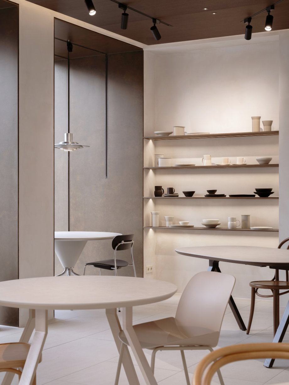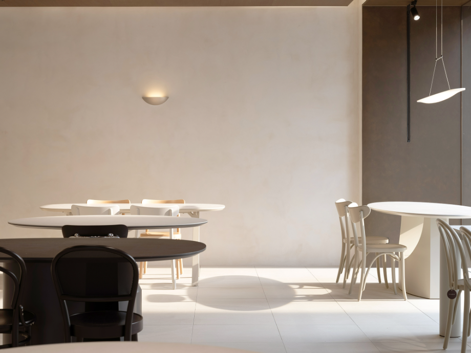 쇼룸에 배치된 가구들은 마치 독립된 아트피스처럼 배치되어있지만, 서로간의 시선이 부드럽게 이어지도록 공간의 축과 마감재의 흐름을 세심하게 조율하고자 했다.◼︎
