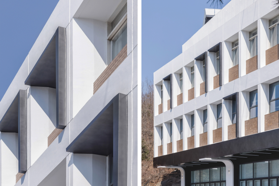 기존 입면은 시간의 흔적이 고스란히 드러나는 노후 상태로, 외부와의 단절을 심화시키고 있었다. 이를 개선하기 위해 창호를 감싸는 'ㄱ'자 형태의 프레임을 입면 전반에 적용하여, 입체감 있는 표면을 형성하고 시각적 리듬을 부여했다. 프레임은 단순한 장식이 아닌, 건물 전면에 시선을 유도하는 장치이자 외부 테라스 및 내부 공간과의 시각적 연계를 가능하게 한다.