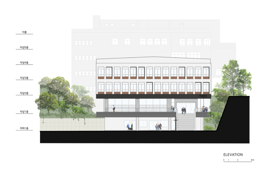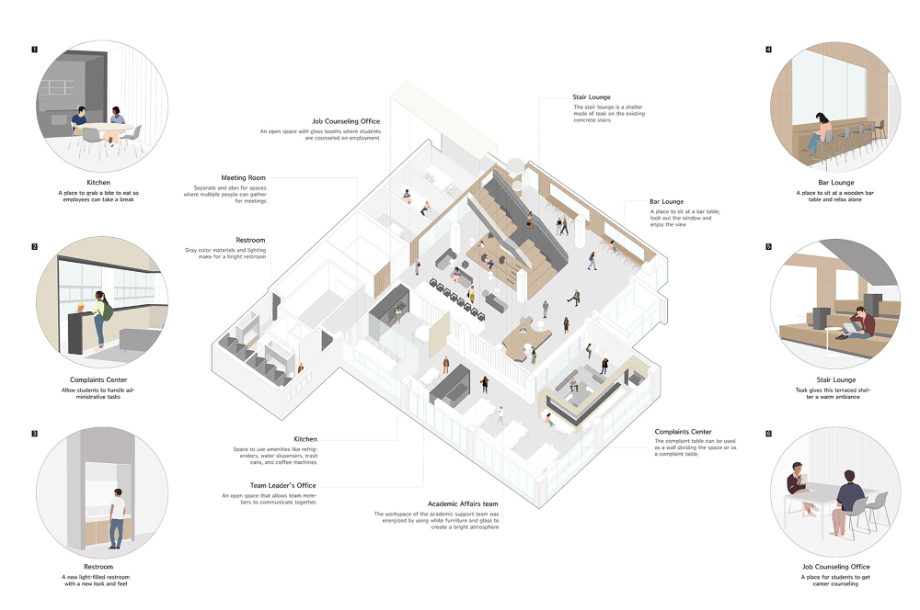 기존 학생회관은 외부와 단절되어 있고, 내부 역시 기능별 구획에 따른 폐쇄적인 공간 구성이었다. 외부 광장과의 시각·물리적 연계를 통해 외부 공간의 실내 유입되도록 확장하고 단순한 통로 공간이 아닌, 다양한 방식으로 체류 가능한 구조적 장치 삽입하여 학생들이 머무르도록 하고 내부 벽체를 제거하여 개방형 공간으로 전환, 프로그램 간 유기적 연결했다.