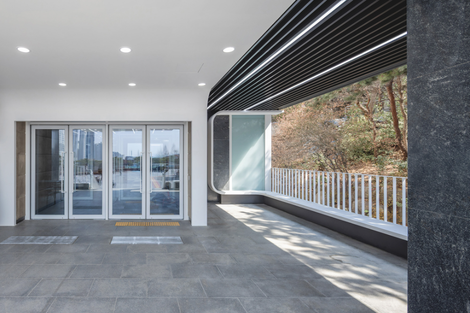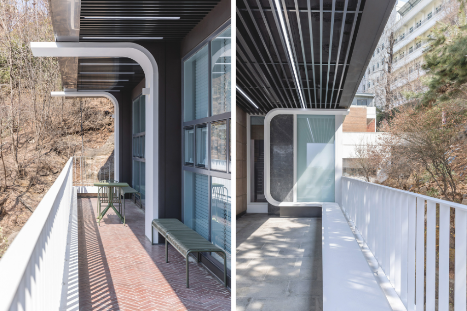 건물 전면부에는 천장에서 벽, 벤치, 바닥으로 연속되는 곡선형 구조물을 설치하여, 단절된 수직적 벽면을 하나의 흐름 있는 매스로 전환했다. 이 구조는 학생들의 동선을 유도하면서도 머무를 수 있는 공간적 여유를 제공하며, 외부 공간에서 내부 공간으로의 진입을 자연스럽게 이끈다. 기둥에서 천장으로 이어지는 곡면 마감 또한 전체 입면의 부드러운 인상을 강화한다. 또한 기존 광장 앞 테라스는 어둡고 기능 없는 공간이었다. 금속 루버와 라인 조명을 도입해 빛이 자연스럽게 확산되도록 하고, 초록색 야외 가구를 배치함으로써 밝고 쾌적한 외부 휴게 공간으로 재구성했다. 이 공간은 학생회관의 확장된 전면부이자, 캠퍼스 외부 공간의 중요한 중간 매개체 역할을 수행한다.