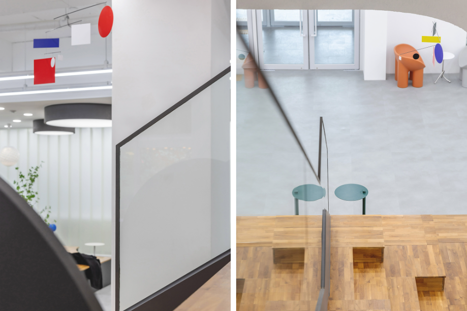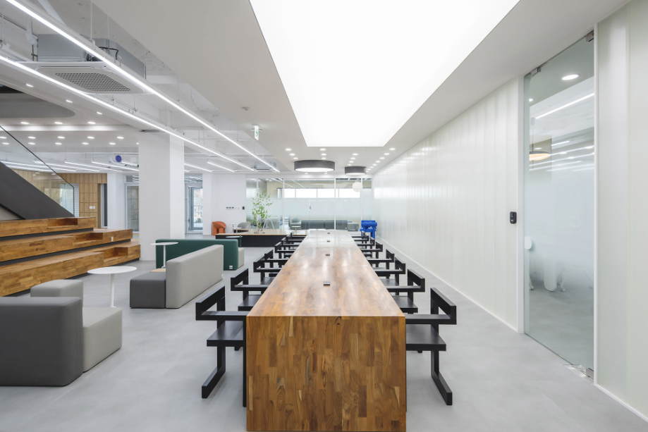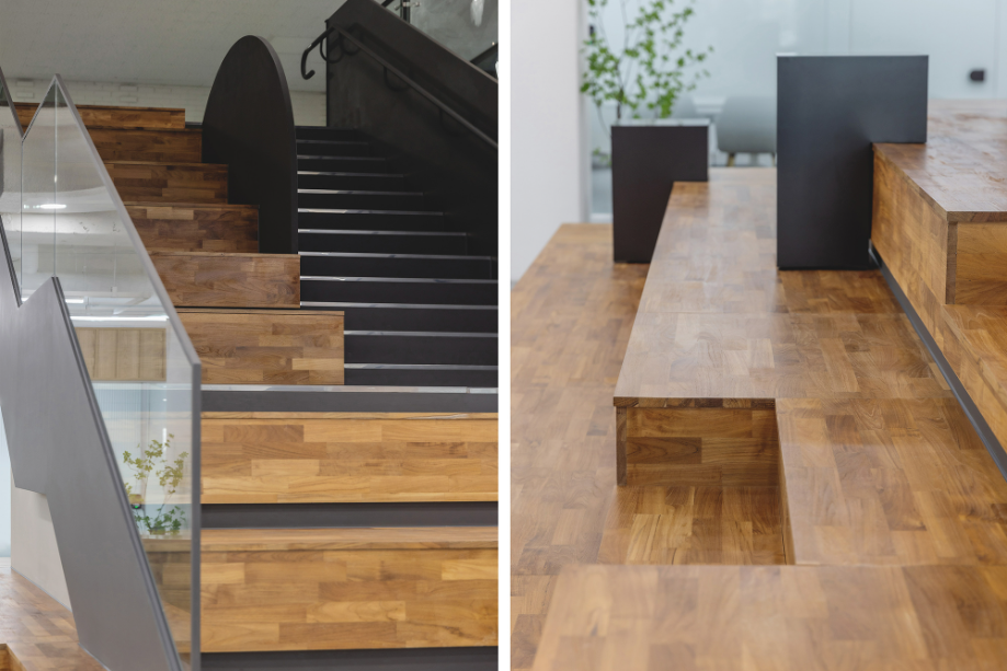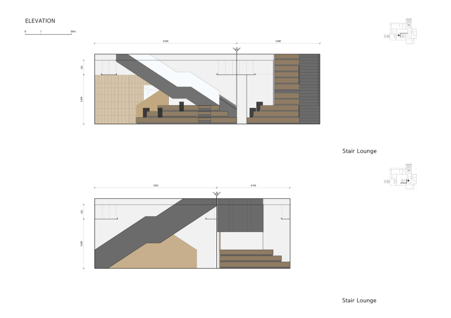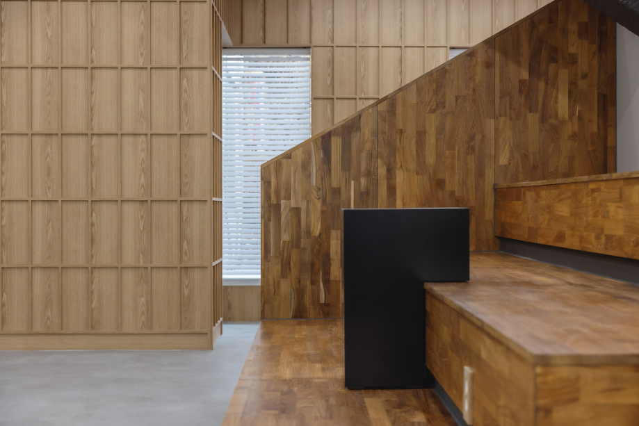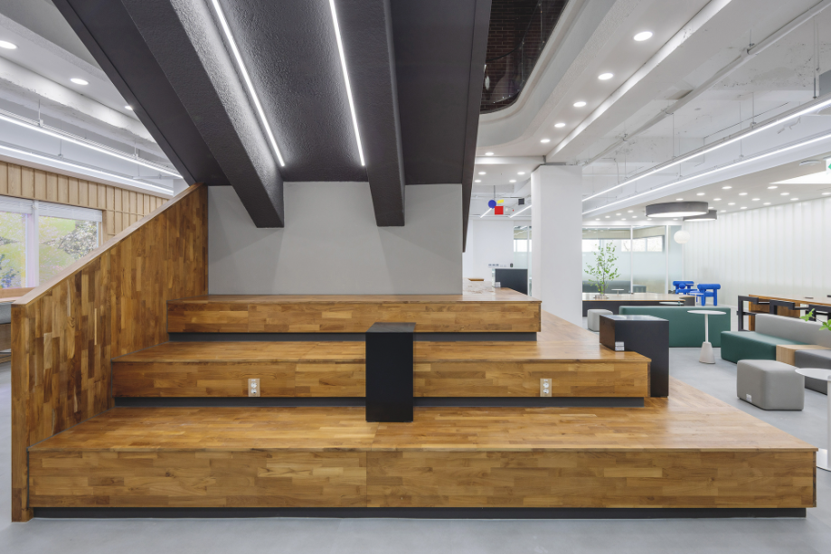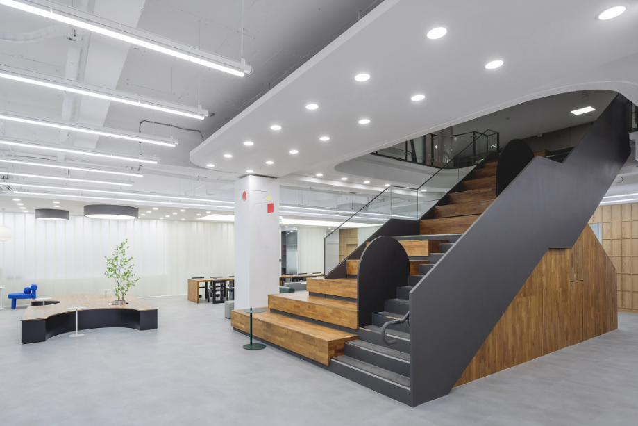 2. Stair 라운지 : 의 콘크리트 계단에 티크 마감을 더하고, 그 옆면에 단차를 맞춘 계단식 쉼터를 조성하여, 단순한 이동 수단이었던 계단을 머무름의 공간으로 전환했다. 계단은 기능적 요소를 넘어, 구조적 쉼터이자 공간을 수직적으로 확장하는 주요 구성요소로 재해석됐다.