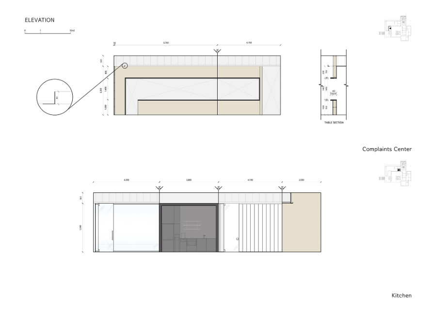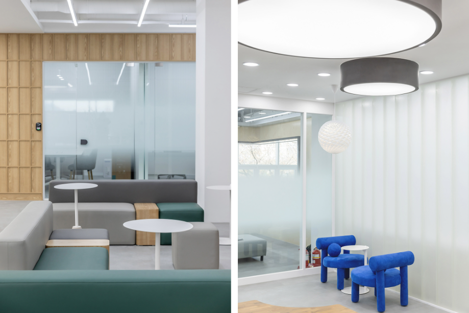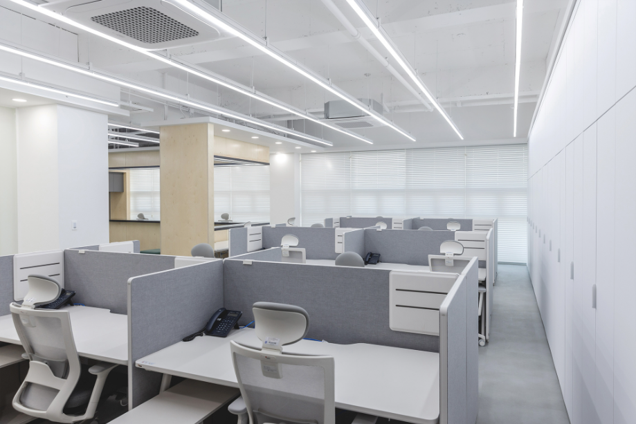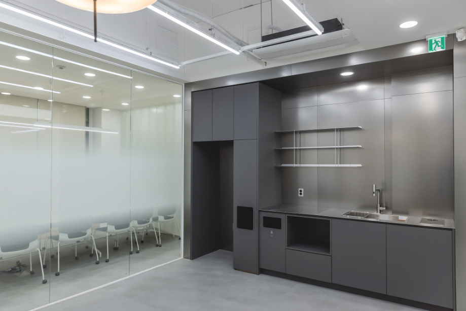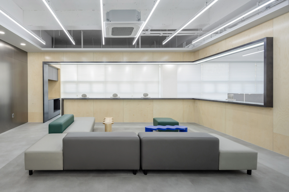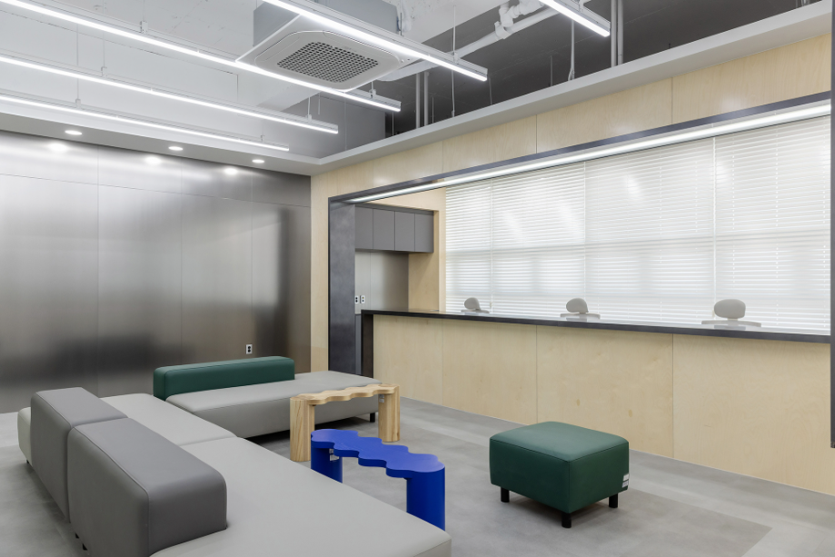 행정 기능 공간인 민원실은 기존의 경직된 관공서 이미지를 탈피하기 위해 자작합판과 스틸로 제작된 유기적 형태의 민원대를 배치했다. 이 민원대는 구조물이자 가구로서 공간을 나누고, 사용자의 위치에 따라 다양한 방식으로 활용된다. 내부 업무 공간은 화이트톤과 유글라스를 사용해 밝고 단정한 분위기를 조성하고, 팀장실, 회의실, 탕비실 등도 일관된 디자인 언어로 구성됐다.