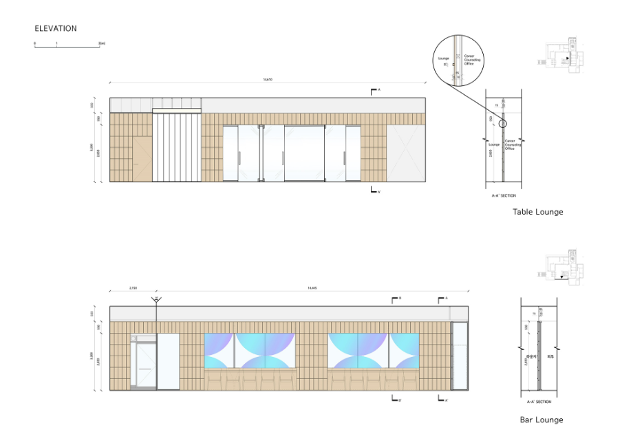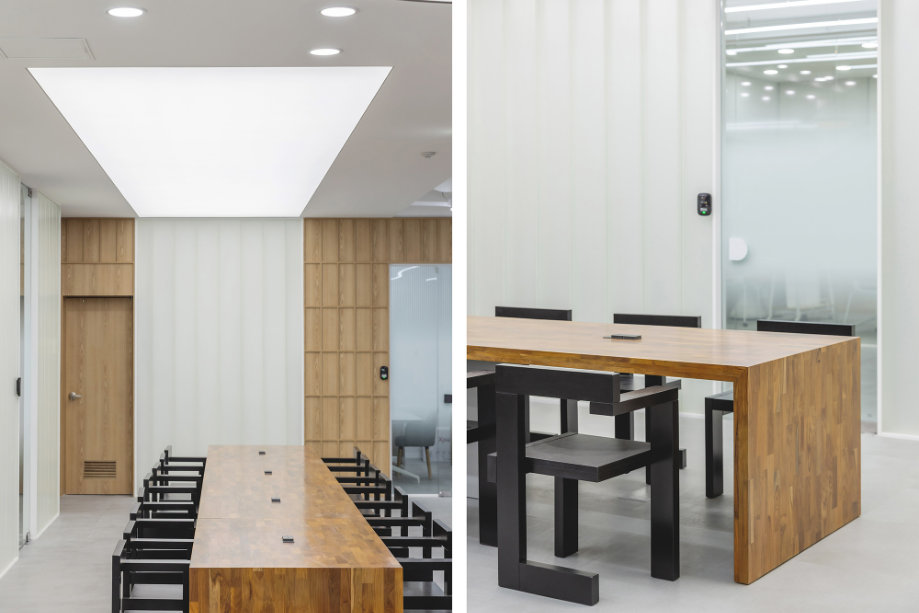 라운지 공간 끝자락에는 취업 상담실이 위치한다. 유리 부스 형태로 설계하되, 반투명한 그라데이션 시트를 부착해 개방감과 프라이버시를 동시에 확보했다. 내부에는 흰색 흡음 패널을 설치하여 상담 중 소음 문제를 최소화했고, 상담실 바깥을 감싸는 우드 프레임은 인접 공간과의 시각적 연결을 유지한다.