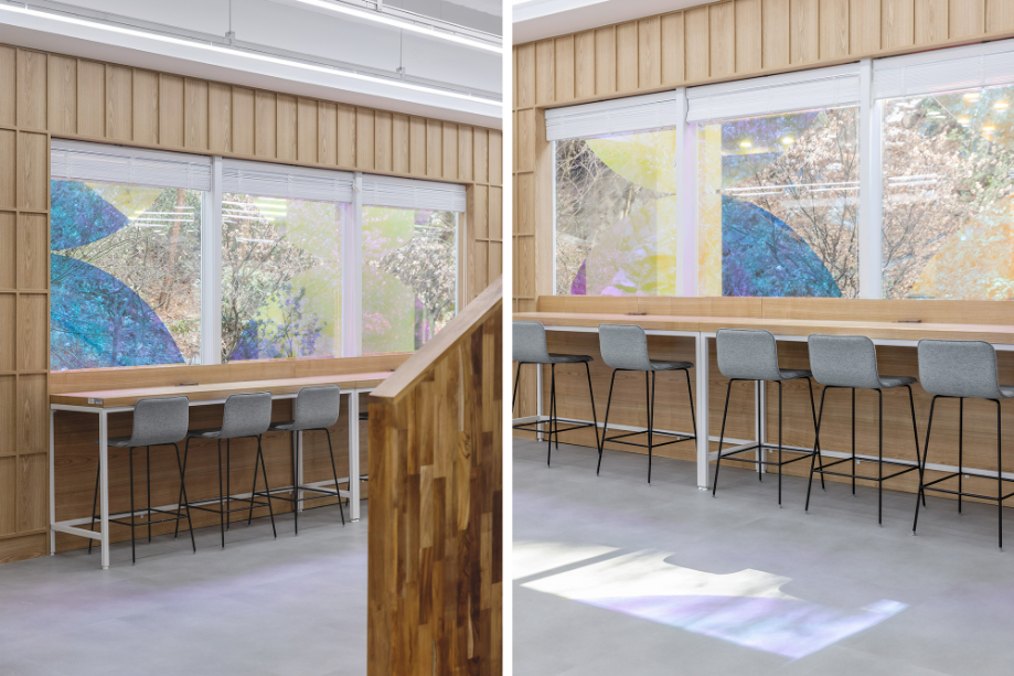 3. Bar 라운지 : 톤 바 테이블을 중심으로 혼자 쉴 수 있는 공간. 창 주변은 격자 우드 프레임과 다이크로익 필름으로 마감해 따뜻하고 다채로운 분위기를 연출했다.
