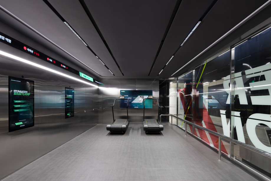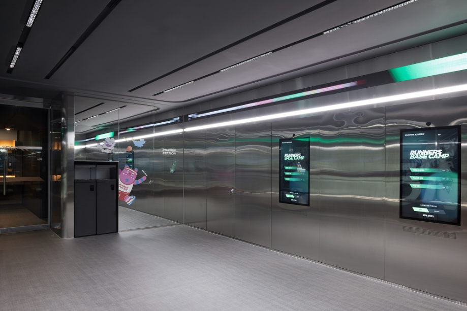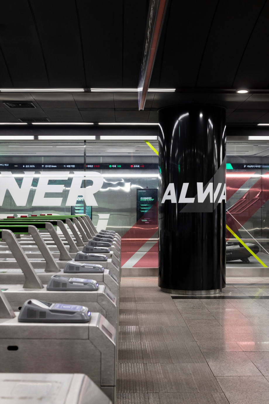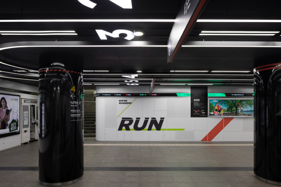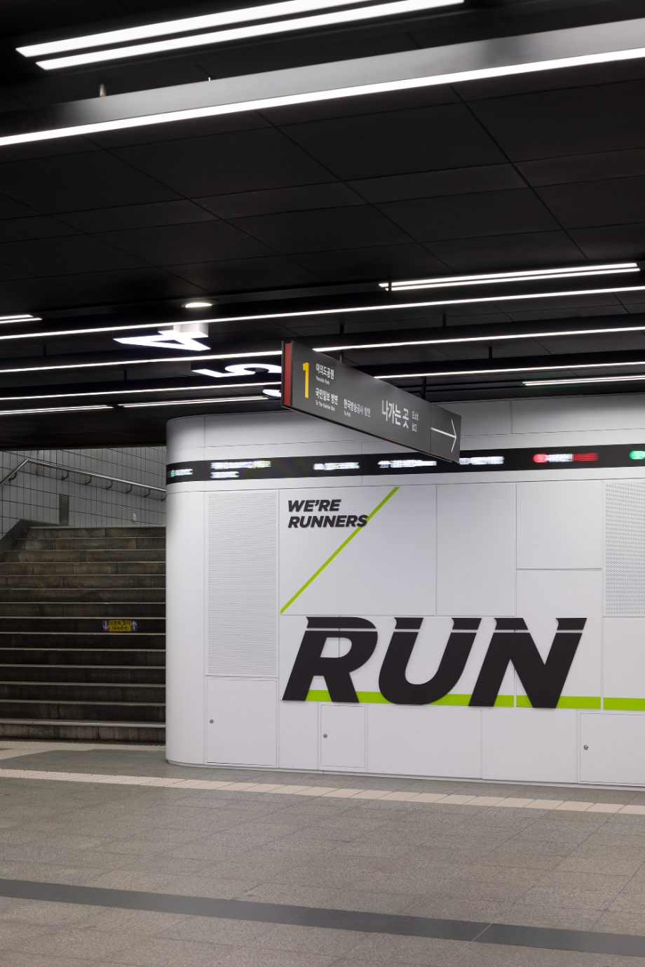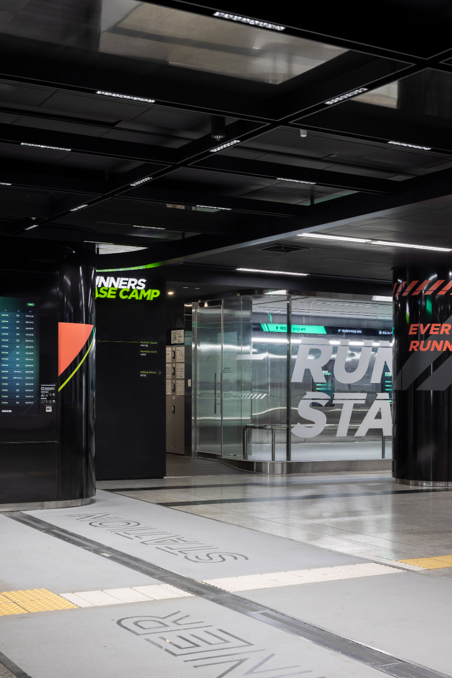 우리는 공간의 사용자중 한 집단인 러너에게는 외면 받지 않는 공간이 되어 지속적인 이용의 선순환을 이루어내서 자생할 수 있는 것, 또 한 집단인 역 이용자들에게는 일상에서의 공기의 향기처럼 시각적 풍요로움을 위한 작은 계기를 만드는 것에 집중했다. 러너들을 위한 다양한 컨텐츠와 기능들에 대한 이야기와 아이디어가 오고 갔지만 결국 그들에게 가장 필요한 기본 기능을 충실히 구현하여 러너들의 안전하고 쾌적한 러닝라이프를 돕는 곳을 지향했다. 그리고 역 이용자들에게는 지하철역이라는 특수한 공간이기 때문에 매우 제한적인 가용 재료를 이용하여 기존 역의 톤앤매너를 살짝 비틀어 이용자들의 정서를 잠시 환기 시키는데 목적을 두고 디자인을 진행했다.