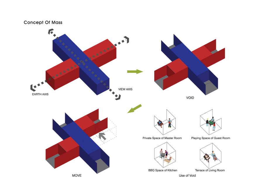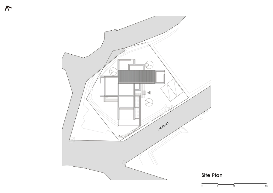 대지의 축은 서향이지만 건축물의 축을 남향으로 비틀어 3개의 외부 마당 앞, 뒤 그리고 주방 마당을 만들었다. 건축물의 주 방향은 남향으로 거실에서 위촌천이 흘러 들어오는 향을 선택했다.