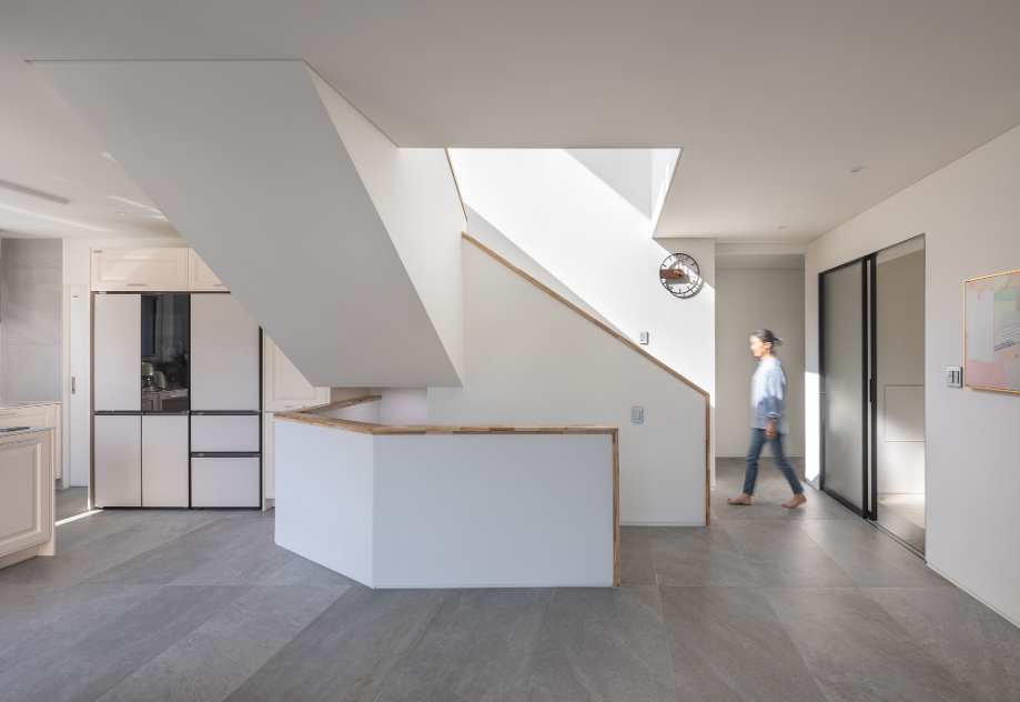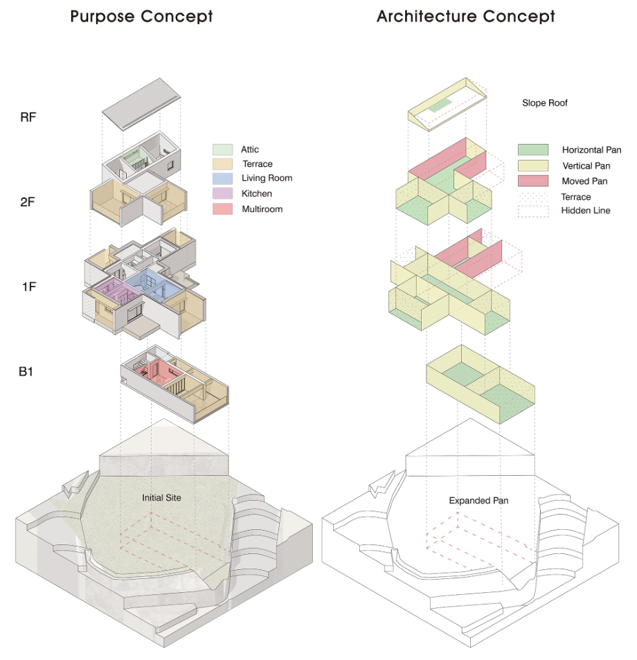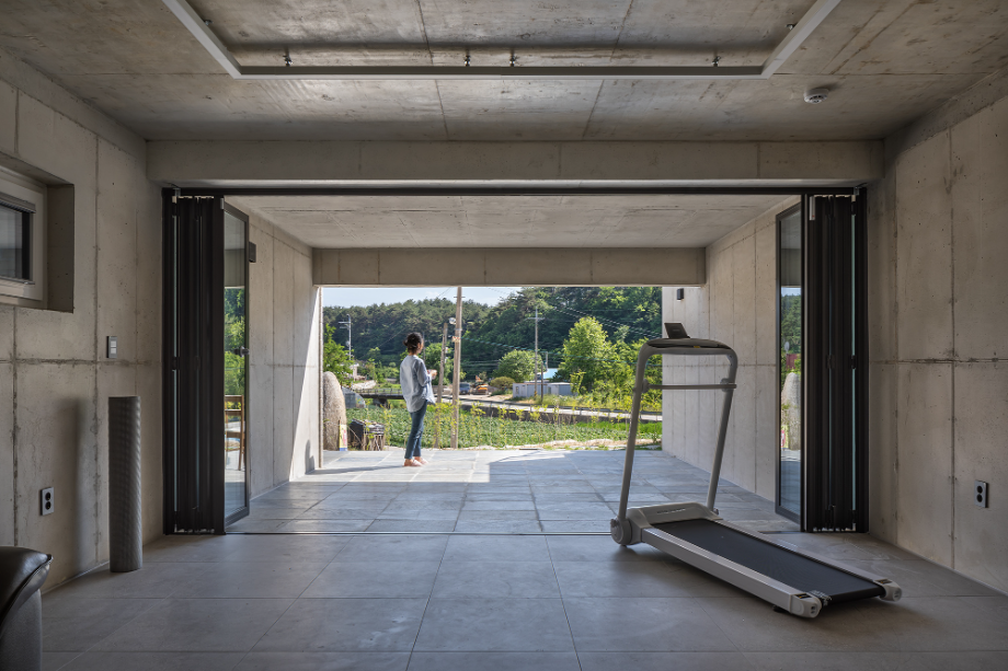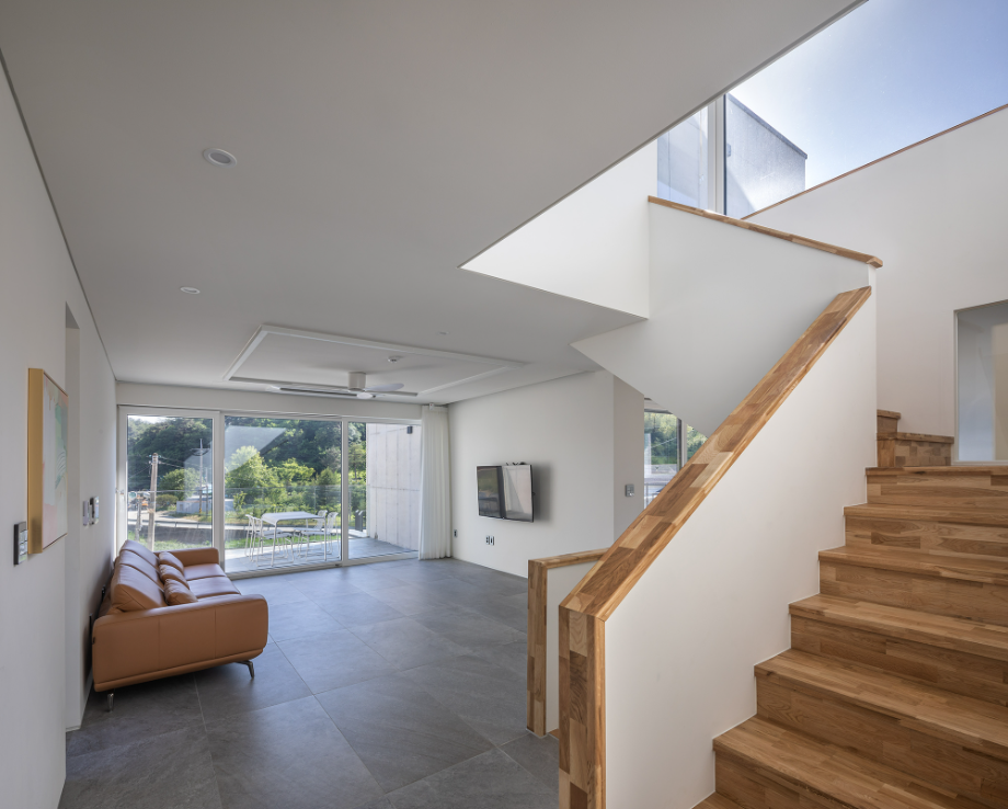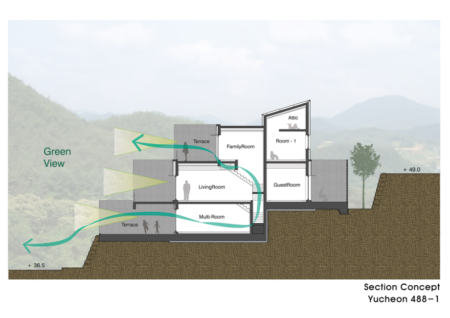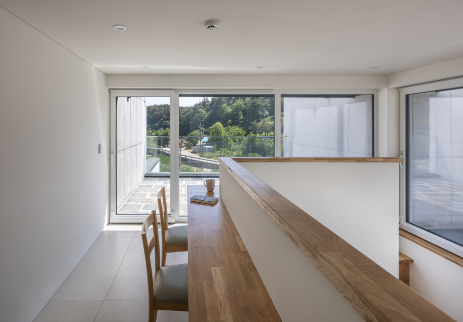 1층은 거실과 주방 등의 가족들이 사용빈도가 높은 공간으로 2층은 아이 둘을 위한 공간으로 배치했다. 획일화되고 건폐율이 낮은 자연녹지여서 부속시설 등의 여분의 공간을 마련하기에는 너무 협소하여 남쪽 석축 한 면을 제거하여 지하층이지만 외기와 한 면이 접하고 위촌천을 바라볼 수 있게 판을 아래로 내려 다용도 작업 공간을 확보했다.