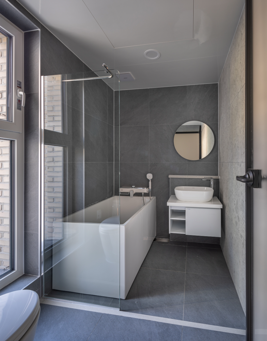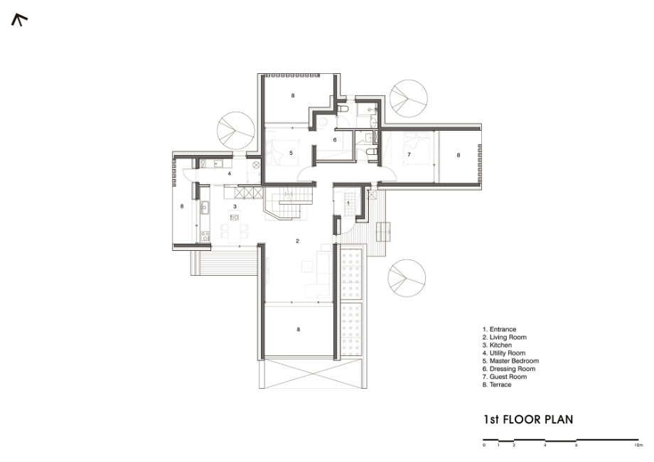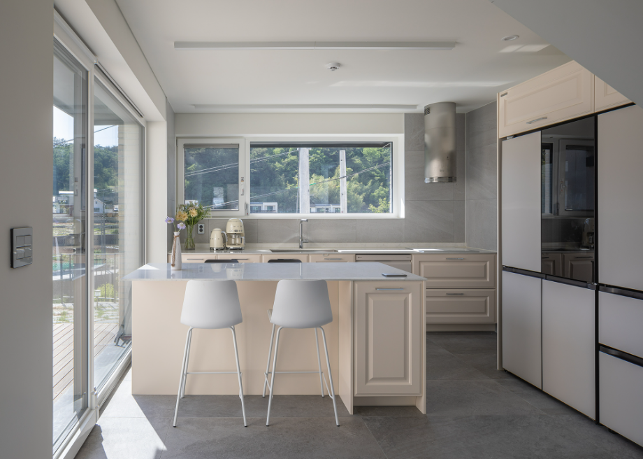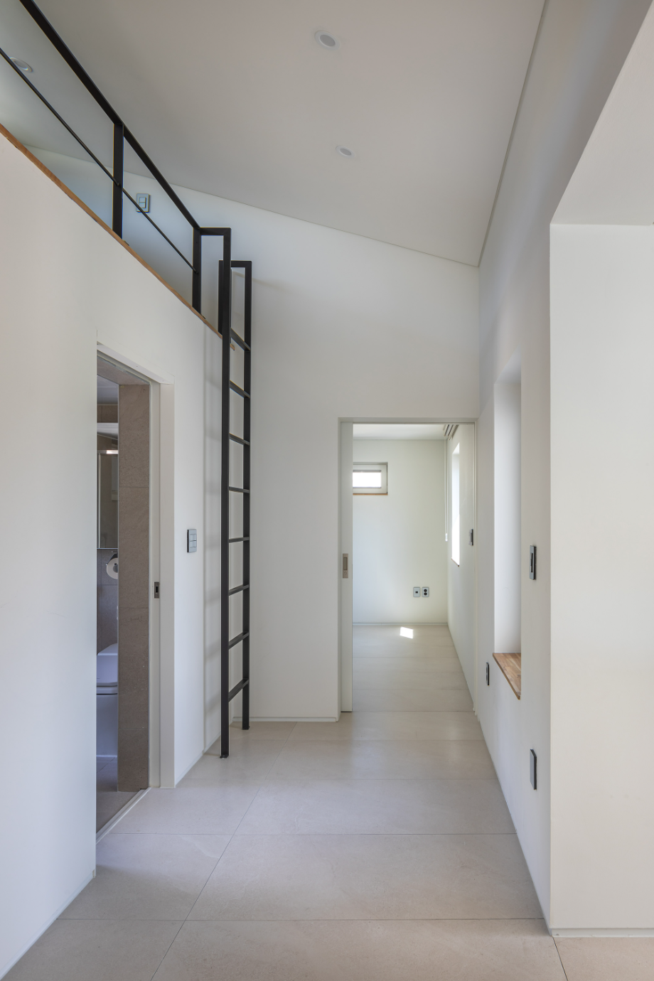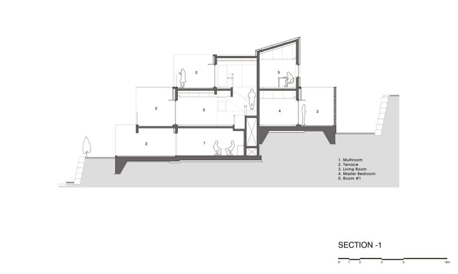 1층은 거실과 주방 등의 가족들이 사용빈도가 높은 공간으로 2층은 아이 둘을 위한 공간으로 배치했다. 획일화되고 건폐율이 낮은 자연녹지여서 부속시설 등의 여분의 공간을 마련하기에는 너무 협소하여 남쪽 석축 한 면을 제거하여 지하층이지만 외기와 한 면이 접하고 위촌천을 바라볼 수 있게 판을 아래로 내려 다용도 작업 공간을 확보했다.