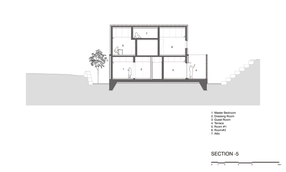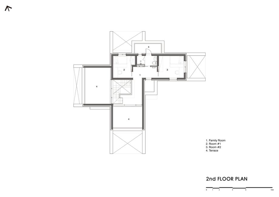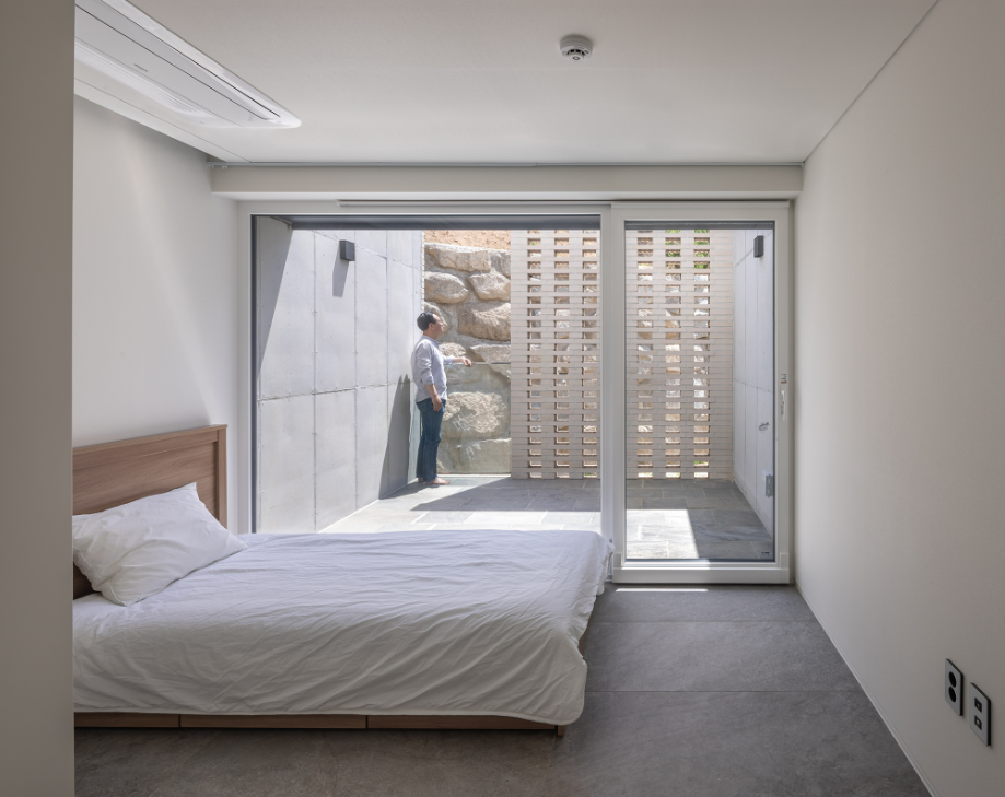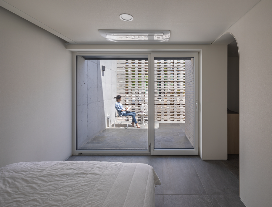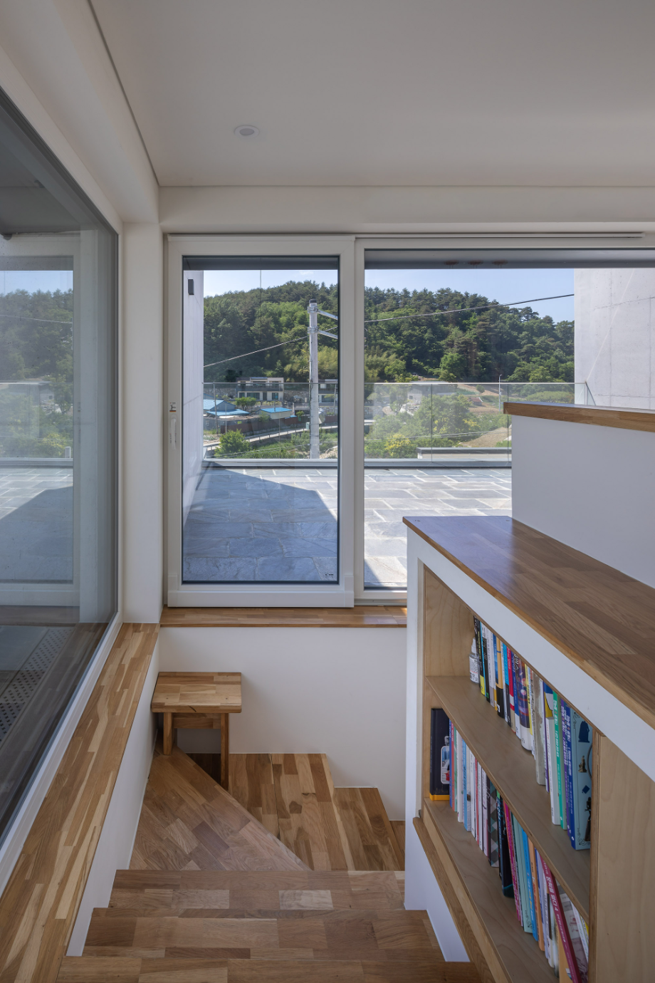 외부 마당과 각층의 발코니 마당이 아이들의 놀이터로 주변 이웃들과의 완충공간으로 작용하도록 하였으며 중앙의 계단을 통해서 사면으로 연결되고 확장되는 내부 구조가 외부에서도 수직판으로 보이고 닫힌 듯 열린 공간을 만들었다.