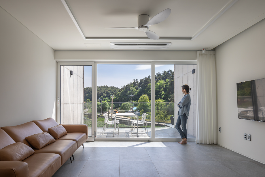 유천동 판판집은 자연지형이 사라지고 단으로 만들어진 대지에 치유의 수평과 수직판을 사용 적극적으로 자연지형에 대응하는 방법으로 지하층 공간을 만들고 발코니 마당을 두어 내부 공간을 확장하여 자연과의 연결 공간을 만들면서 가족의 사생활을 지킬 수 있도록 판이 작용하도록 했다.◼︎