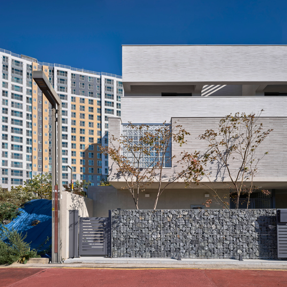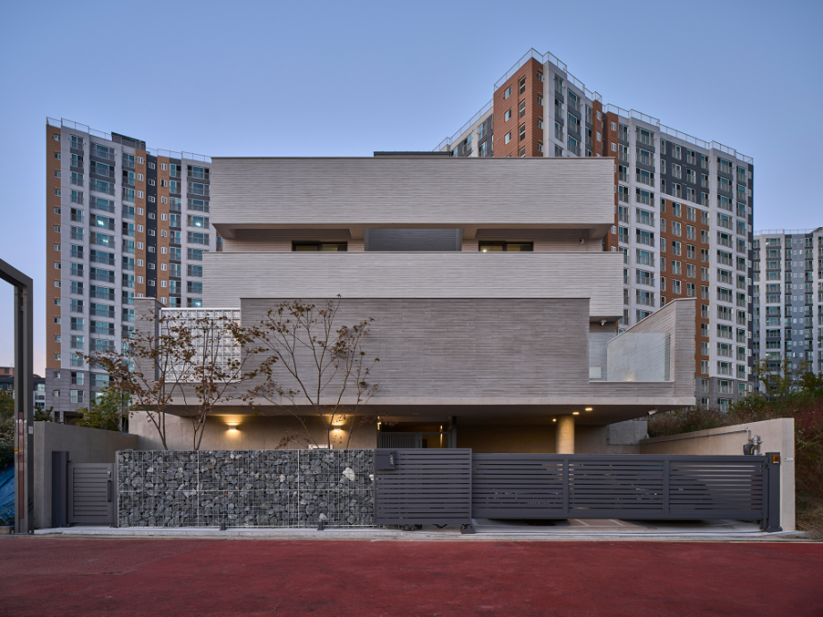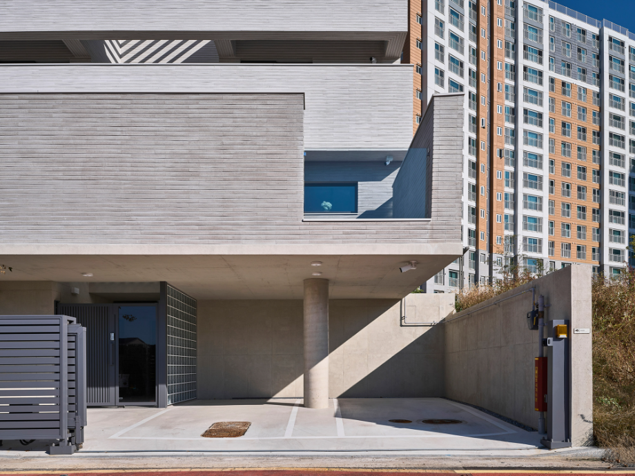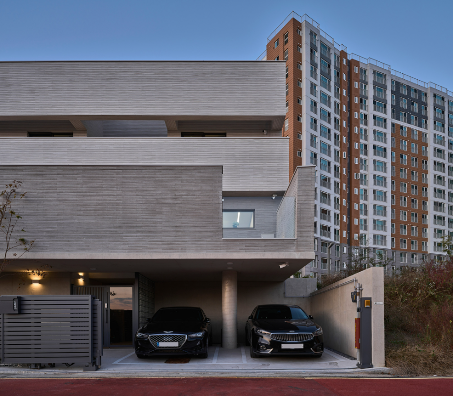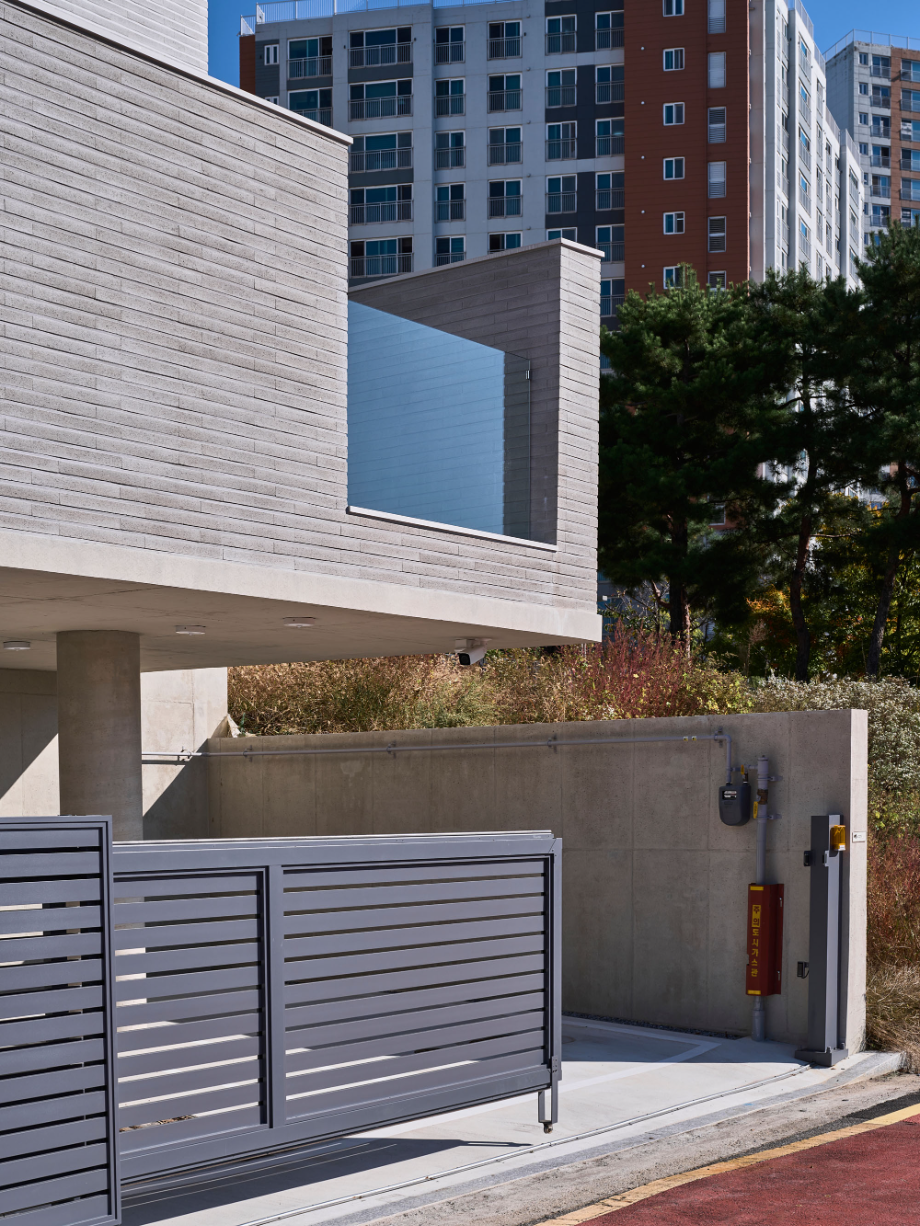 높은 벽은 수직이고 낮은 담은 수평이다. 대지 주변의 지배적 풍경인 대단지 아파트의 이미지는 수직적이다. 이에 대조되는 수평적 요소를 형태, 공간으로 강조하는 집이 된다면 아파트와 주택들이 겹쳐지는 동네 풍경에서 적절한 대비의 긴장감이 집의 윤곽을 확고히 만들어줄 수 있다고 판단했다.