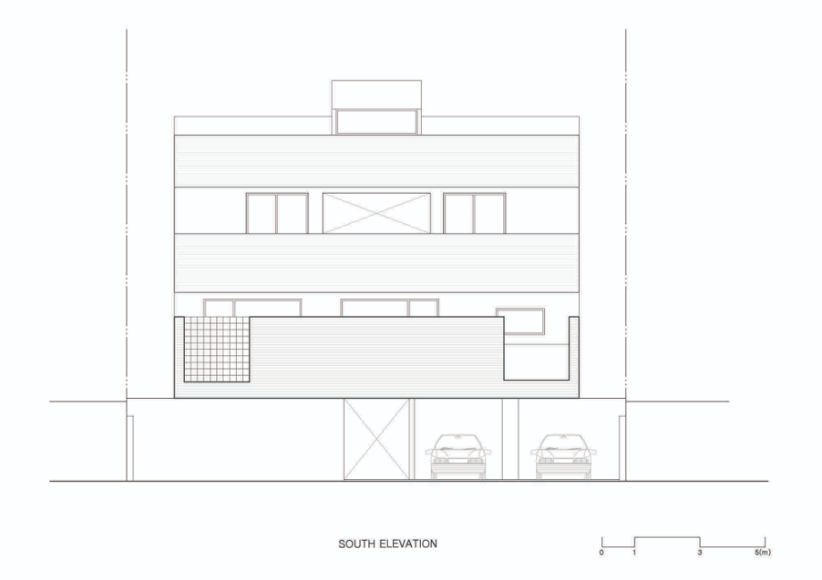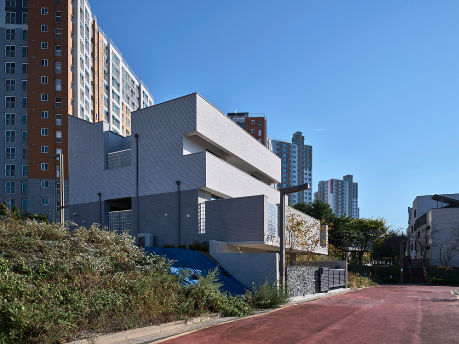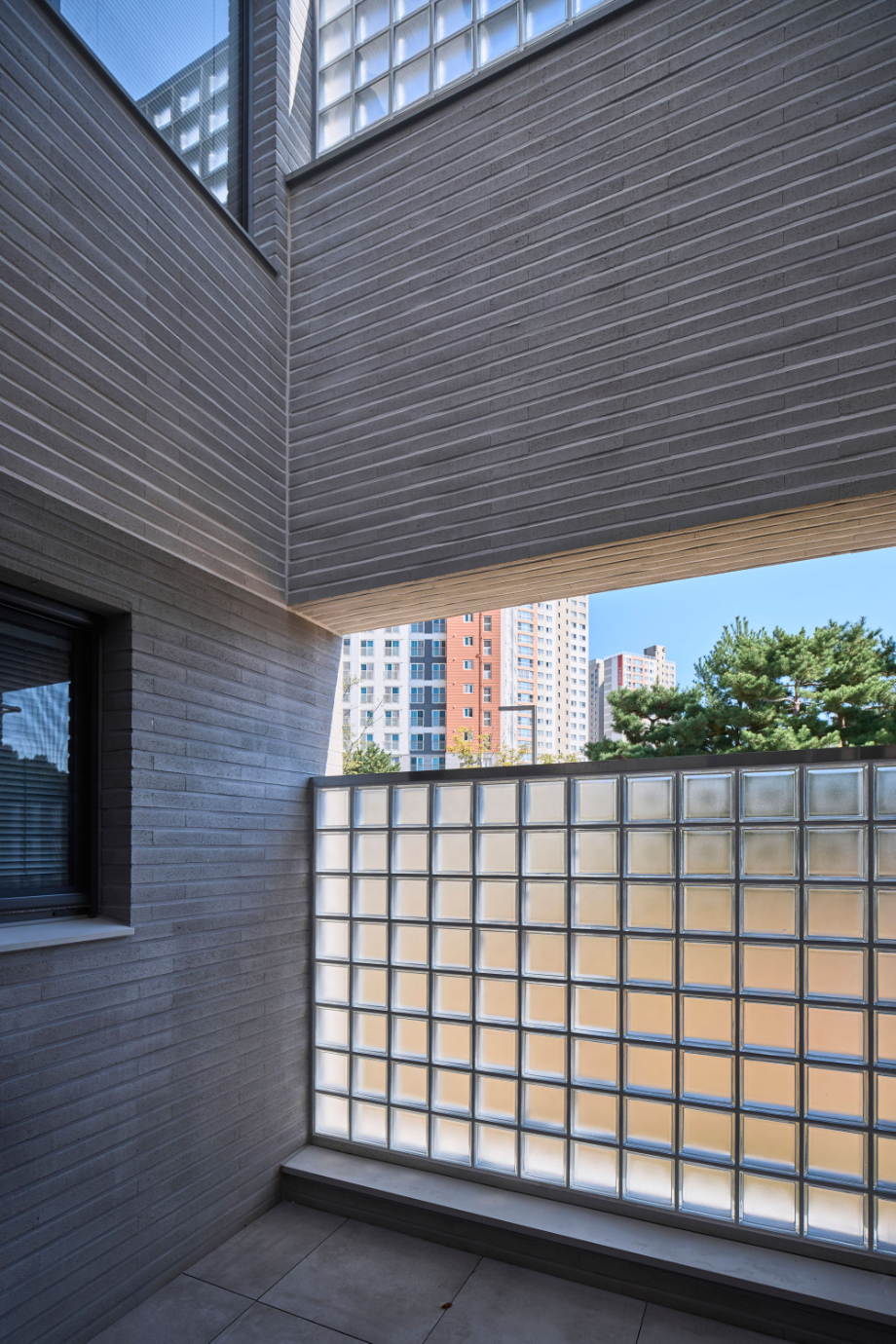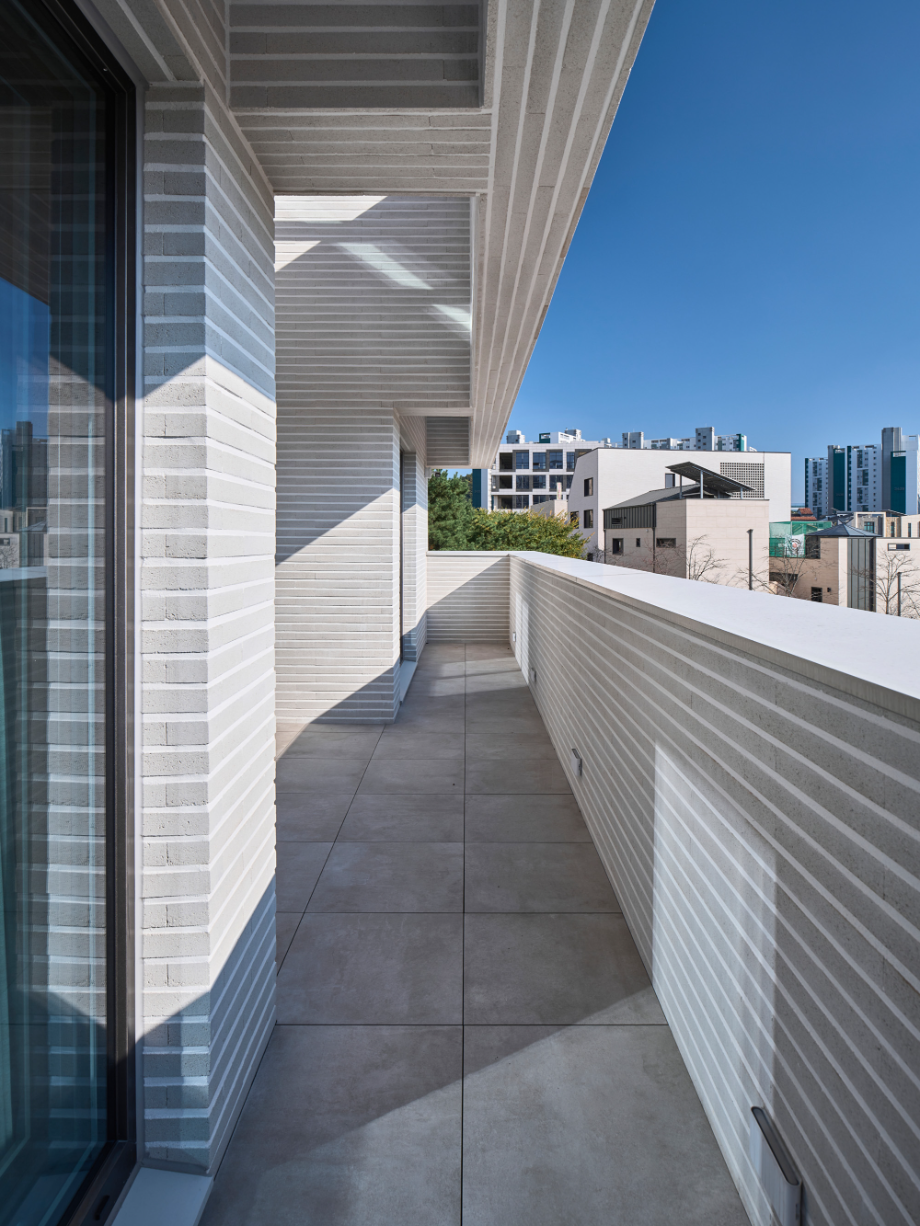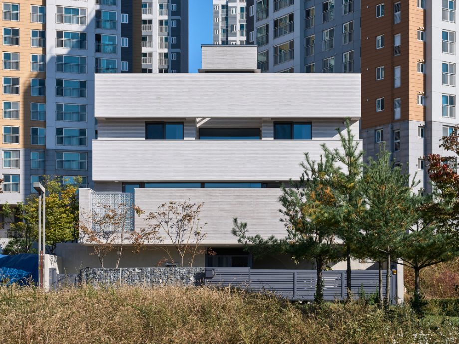 높은 벽은 수직이고 낮은 담은 수평이다. 대지 주변의 지배적 풍경인 대단지 아파트의 이미지는 수직적이다. 이에 대조되는 수평적 요소를 형태, 공간으로 강조하는 집이 된다면 아파트와 주택들이 겹쳐지는 동네 풍경에서 적절한 대비의 긴장감이 집의 윤곽을 확고히 만들어줄 수 있다고 판단했다.