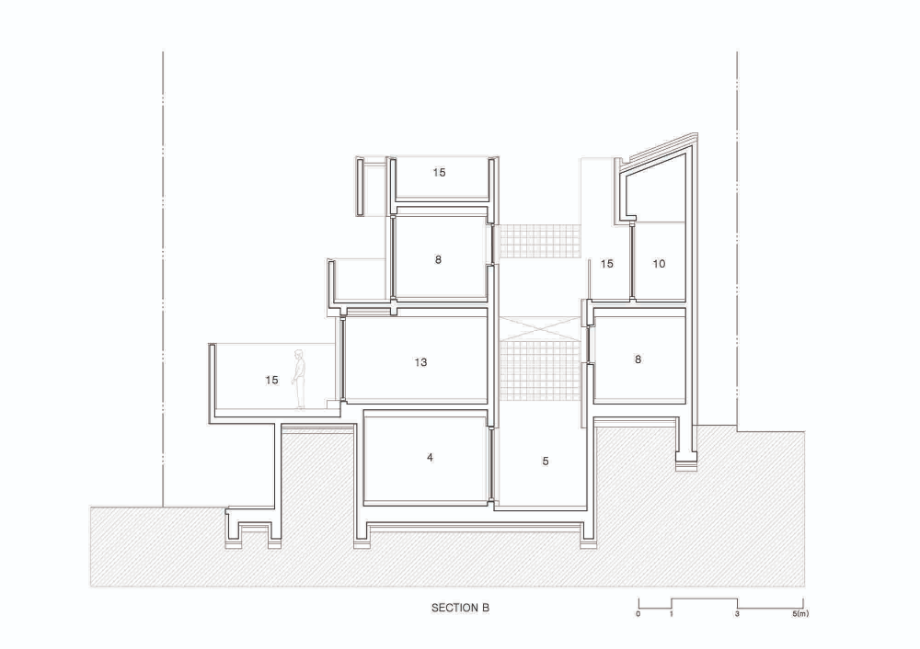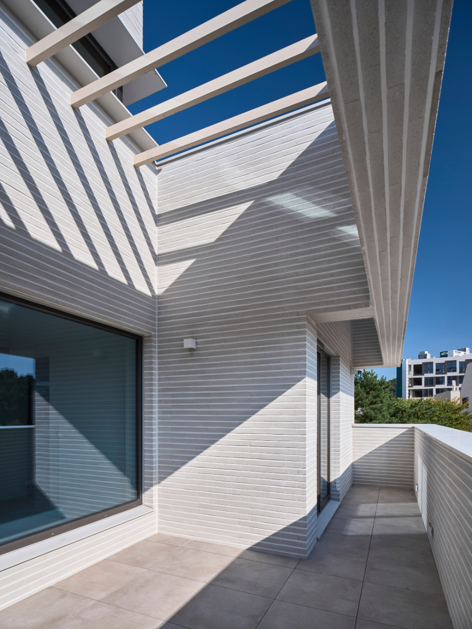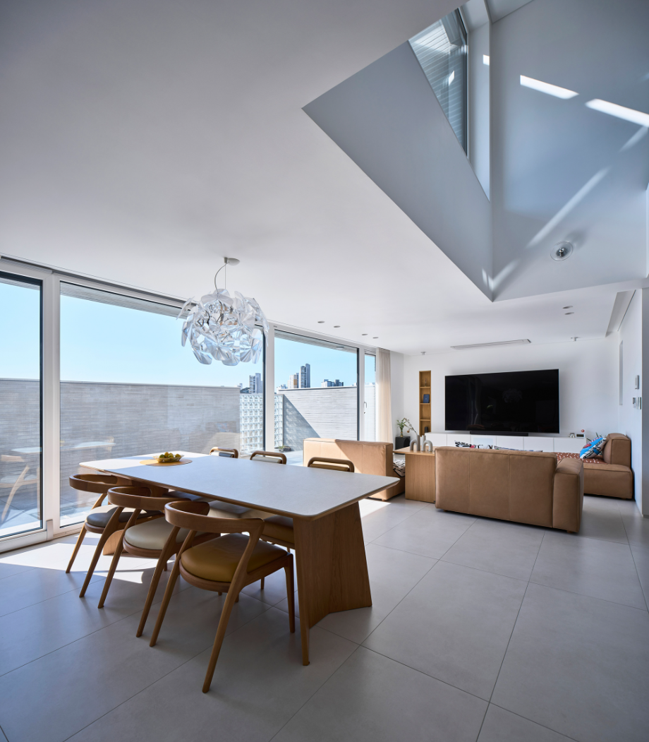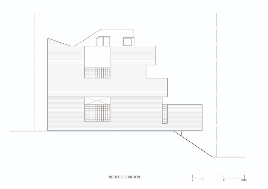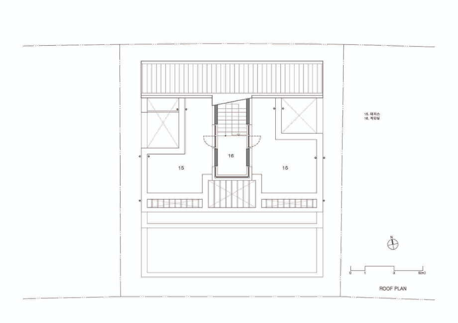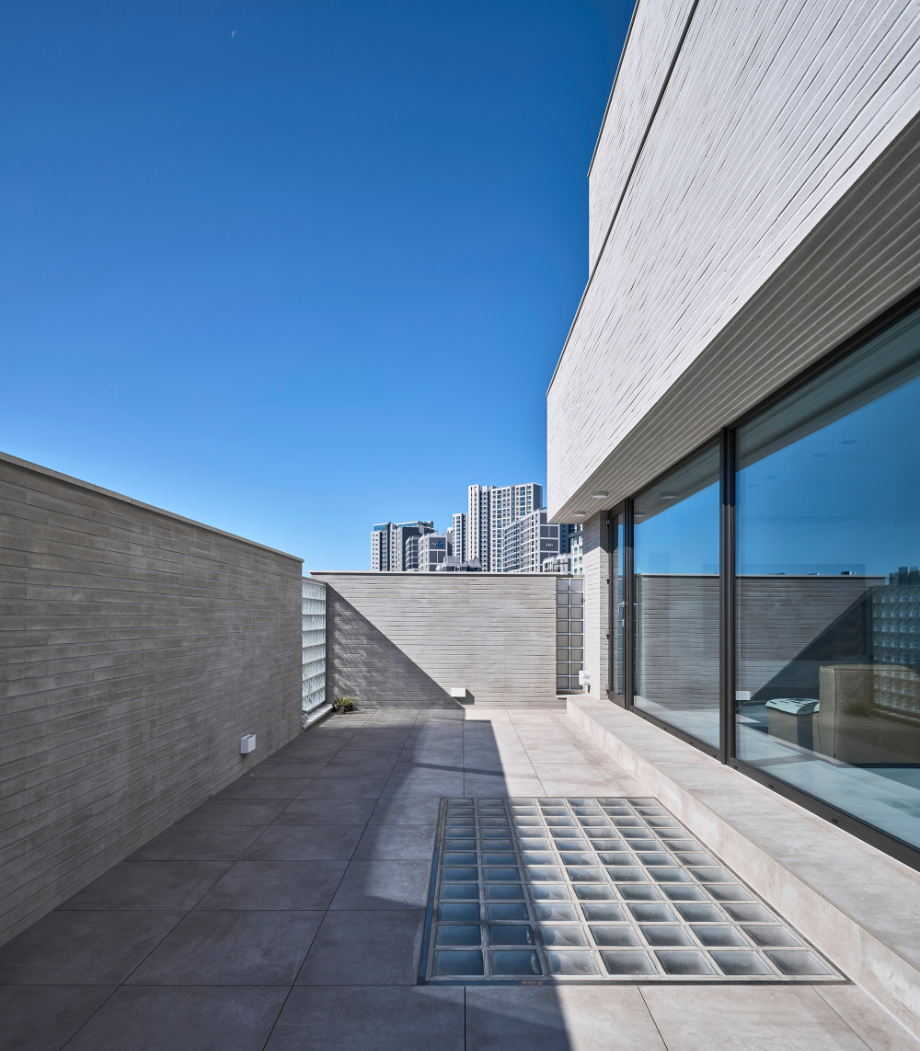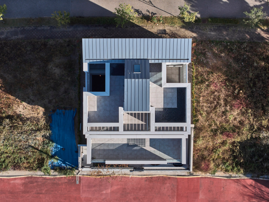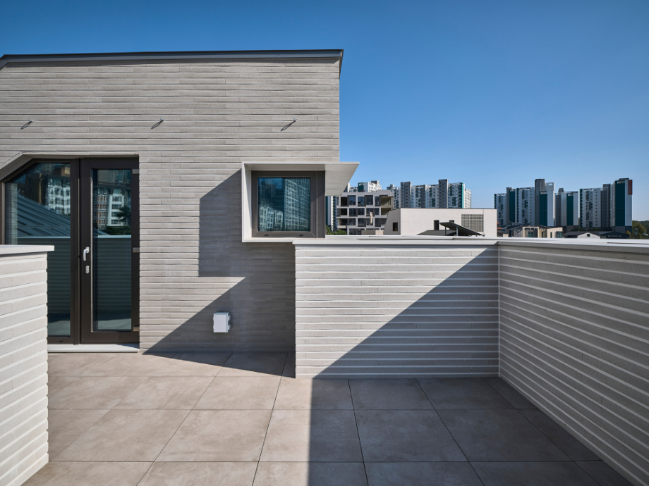 건물은 전체적으로 계단식이다. 2층은 1층보다 뒤로 물러서 테라스를 만들고, 그 위 옥상테라스도 셋백 되어 넉넉한 옥상을 만들었다. 층이 오르면서 집이 뒤로 물러나면 내부 공간의 시선은 더 열리고 외부시선 차단엔 용이해진다. 남쪽으로 충분한 일조와 조망을 확보하고 프라이버시는 효율적으로 해결해준다.