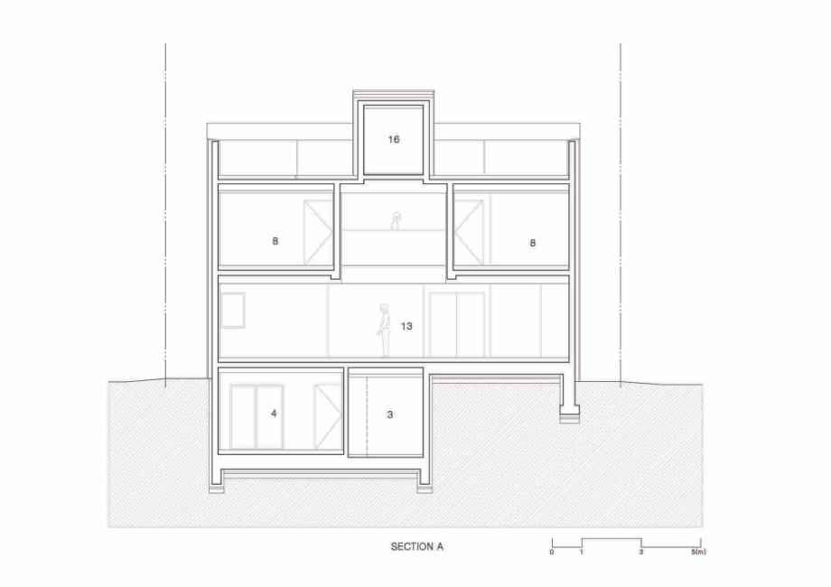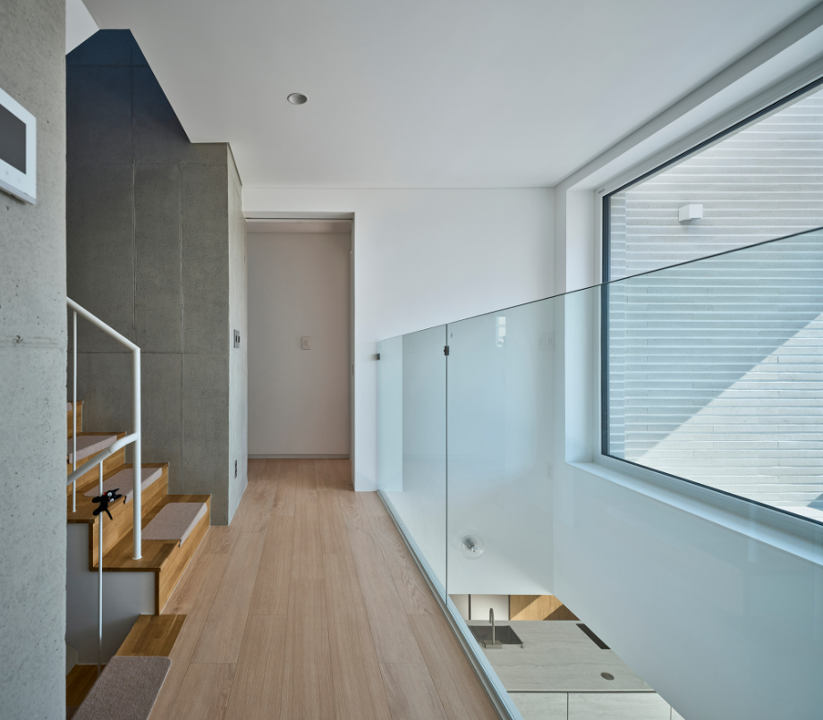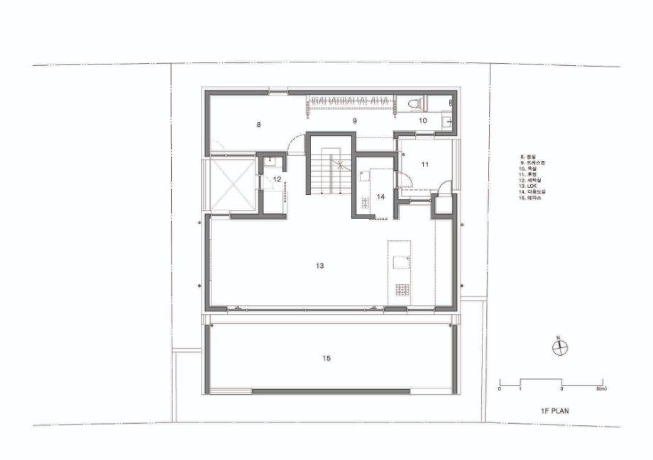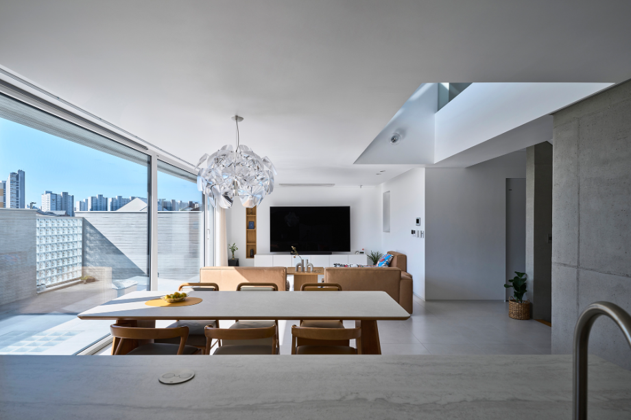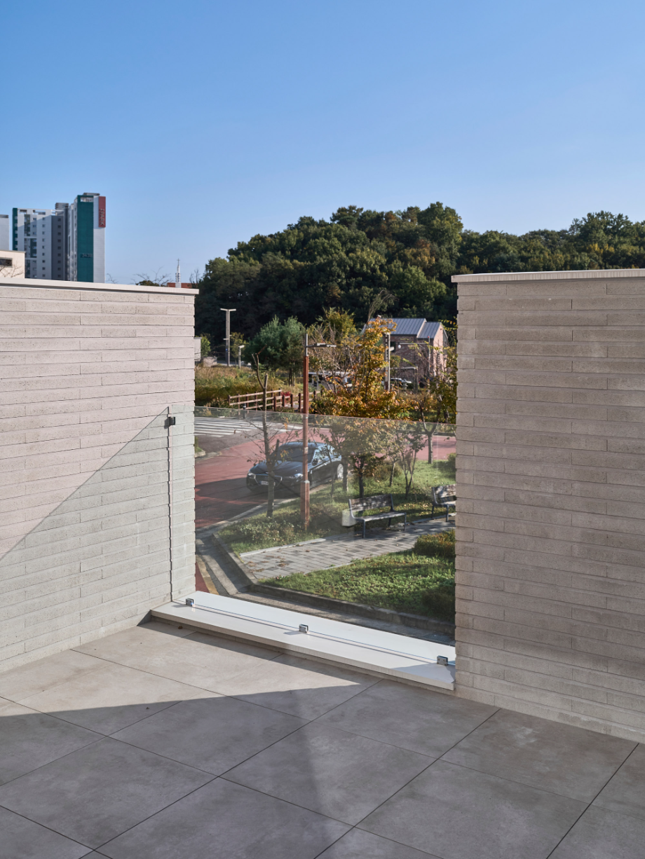 대지는 한층 높이이상 들어 올려진 성토 부지였다. 남쪽은 낮은 지대로 단지내 도로와 접하며 집의 자연스러운 지하층 출입구가 형성된다. 지하층은 취미실과 창고, 선큰, 현관이 있다. 계단을 통해 한층 오르면 갑자기 확 트여진 거실과 주방, 테라스와 그 너머의 열린 조망이 펼쳐진다. 대지 단차로 자연스럽게 만들어진 1층 테라스는 거실, 주방 공간과 면적이 동일하다. 큰 창을 통한 시각적 확장은 테라스를 실내공간의 연장처럼 느껴지게 한다. 테라스의 담과 벽은 외부 시선은 가리고, 불필요한 풍경은 트림해주는 역할이다. 거실, 주방의 넓은 실내와 테라스 그 너머의 하늘과 먼 산 능선의 풍경으로 시선이 크게 개방되도록 의도했다.
