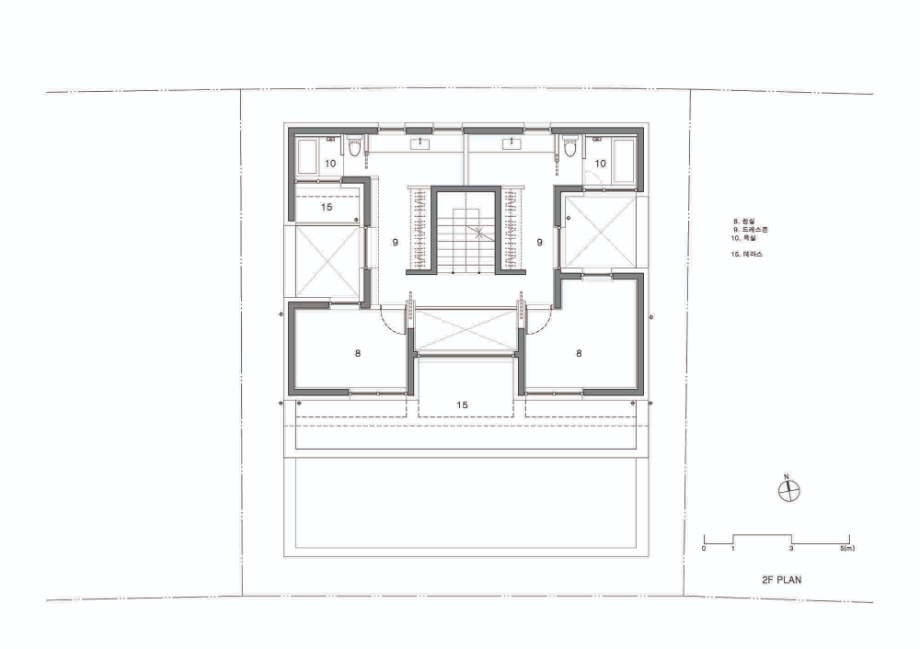 2층은 1층과 달리 오밀조밀한 벽체로 자녀 각각의 프라이버시를 최대한 보장하는 공간으로 설계했다. 각자의 침실이 좌우의 배치되는데 침실과 드레스룸, 별도의 욕실이 패키지로 묶이는 호텔 세미 스위트룸 형식을 적용했다. 성장한 자녀들이 각자의 넉넉한 개인 공간을 온전히 소유하길 바라는 부모의 의견이 반영됐다.