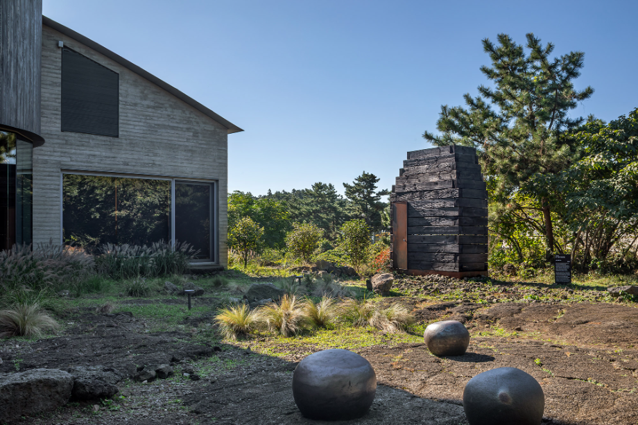 목재 사이 12mm의 틈은 단순한 건축적 조인트를 넘어, 제주의 빛과 바람을 공간 안으로 스며들게 하는 섬세한 필터 역할을 수행한다. 이 틈 사이로 흐르는 빛은 형태를 부각시키거나 공간을 해설하지 않는다. 오히려 빛은 '존재'로서 머물며, 공간 안에 미묘한 물질적 인상(material impression)을 남긴다.