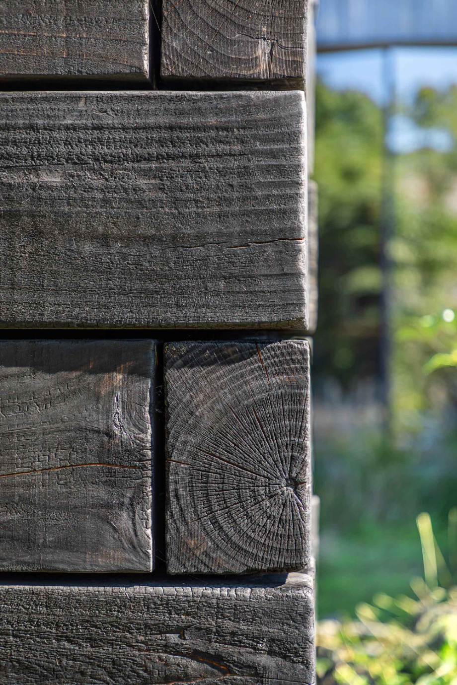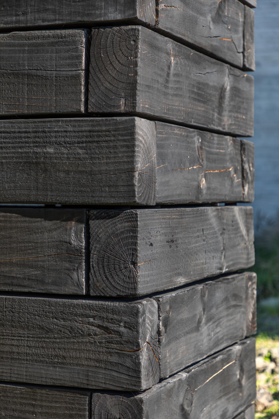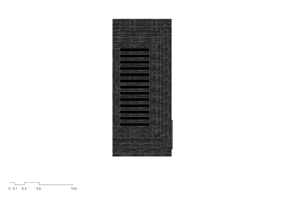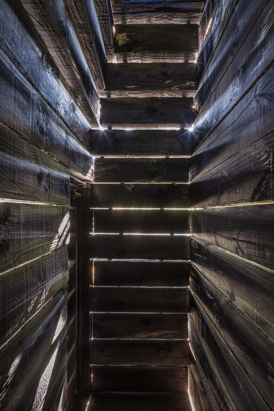 파빌리온의 검고 투박한 나무 덩어리는 닫힌 형태로 외부를 향하지만, 그 폐쇄성은 오히려 내부로의 접근을 유도한다. 외부에서의 조형적 긴장과 내부에서의 감각적 개방은 이 작은 구조물의 이중적 성격을 예고한다. 파빌리온의 구조는 240mm x 150mm 크기의 전나무 블록을 일정한 간격으로 적층하여 만들어졌다. 각 목재 블록은 동시에 구조체이자, 빛을 받아들이는 매개체로 작동한다.