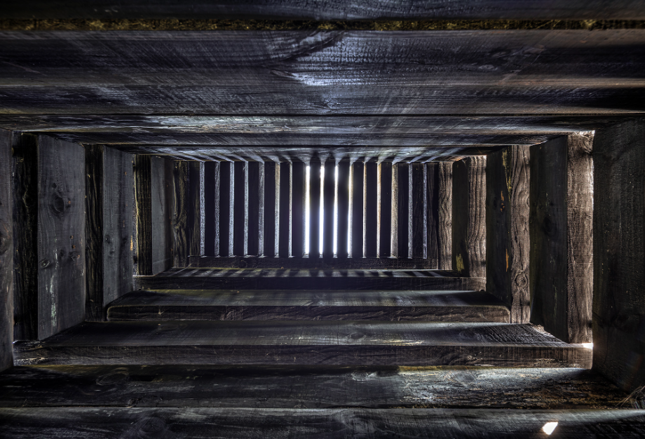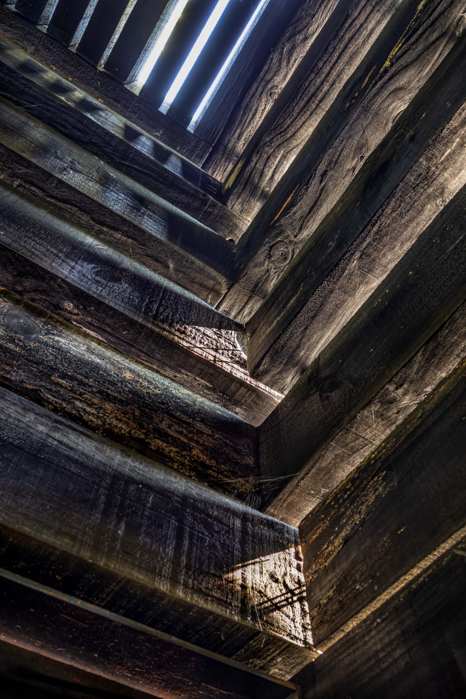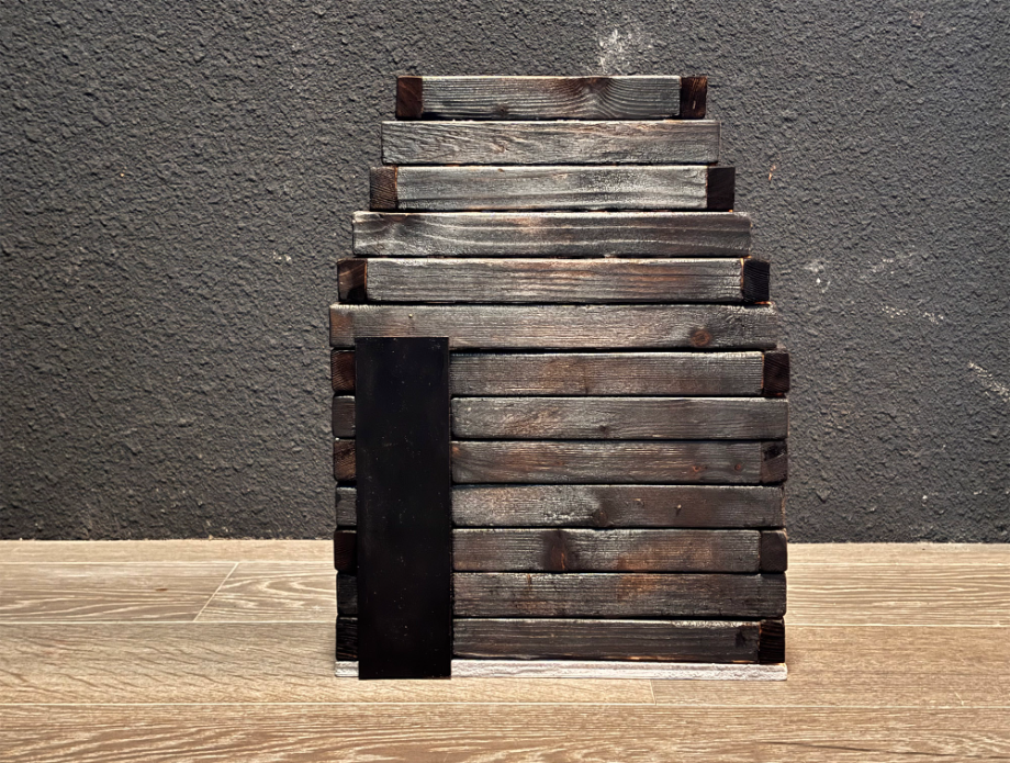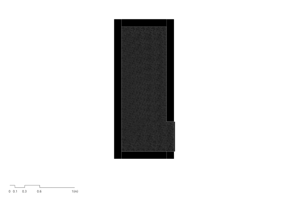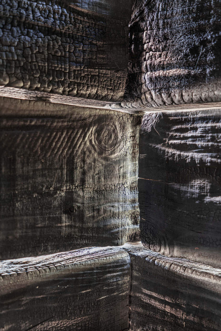 파빌리온의 검고 투박한 나무 덩어리는 닫힌 형태로 외부를 향하지만, 그 폐쇄성은 오히려 내부로의 접근을 유도한다. 외부에서의 조형적 긴장과 내부에서의 감각적 개방은 이 작은 구조물의 이중적 성격을 예고한다. 파빌리온의 구조는 240mm x 150mm 크기의 전나무 블록을 일정한 간격으로 적층하여 만들어졌다. 각 목재 블록은 동시에 구조체이자, 빛을 받아들이는 매개체로 작동한다.