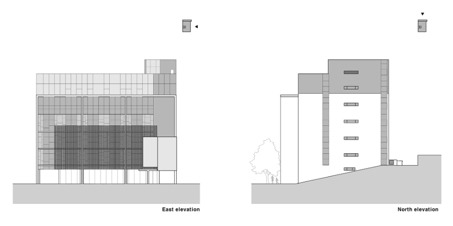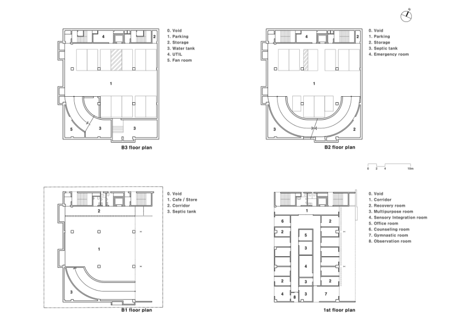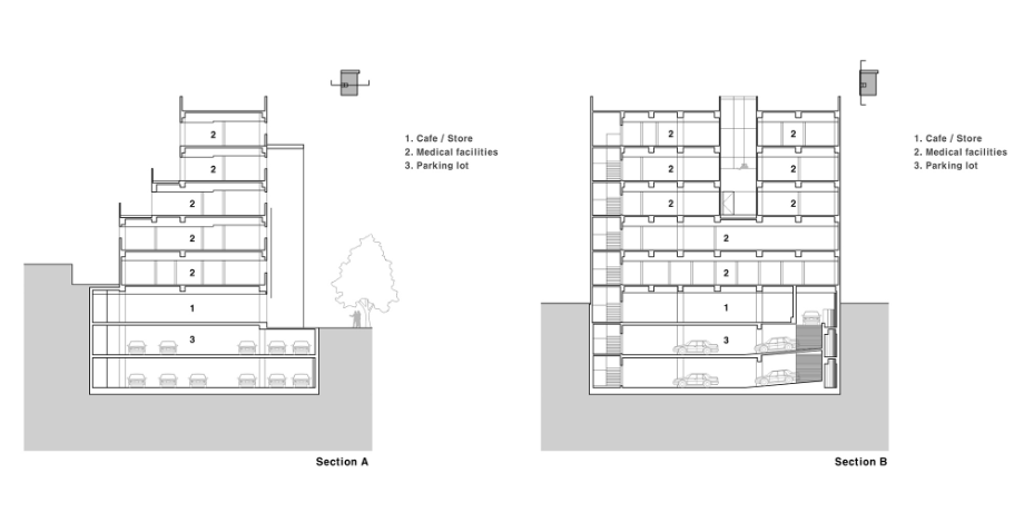 건물의 뒷면은 석축으로 지지된 급격한 경사가 있었다. 이 경사를 이용하여 건물의 지하 1층을 지상 1층과 같이 사용할 수 있는 아이디어를 생각하여 적용하였다. 남측에 계획한 3개 층 오픈 공간은 각층에 자연광을 인입하도록 고려된 장치이다.