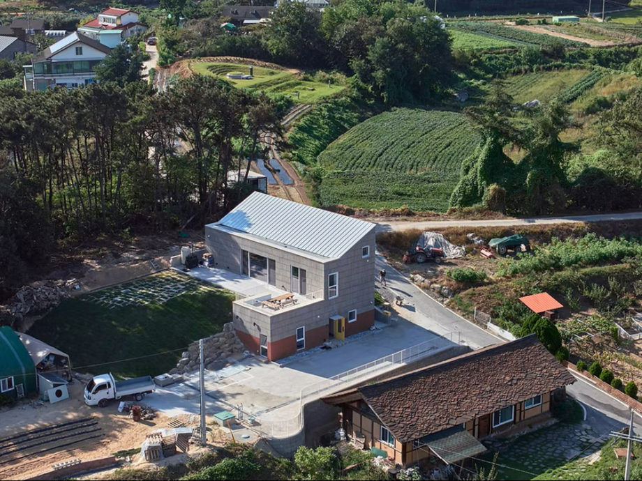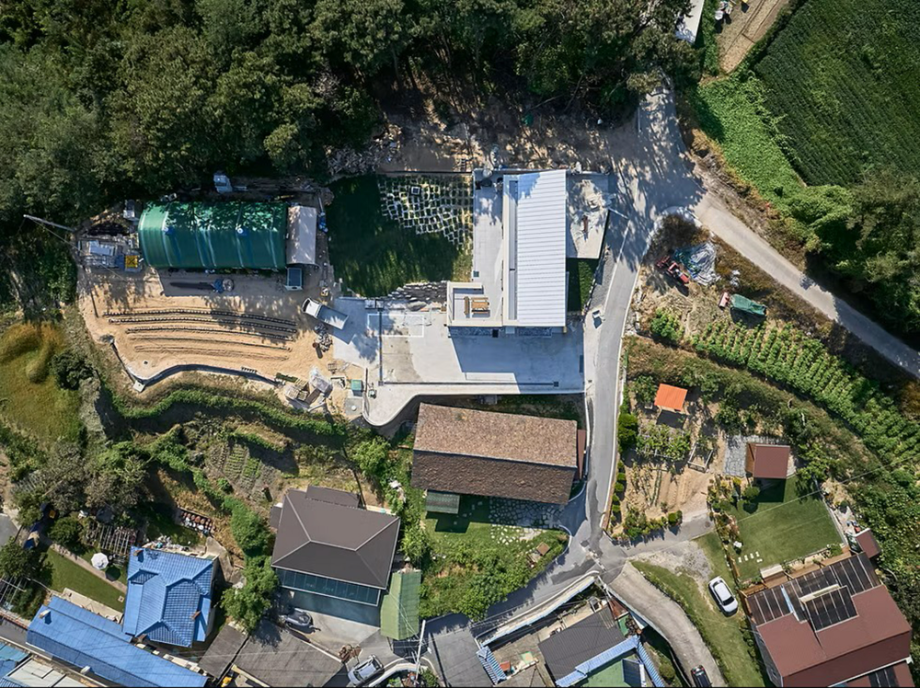 대지의 남쪽에 면한 더 큰 땅도 건축주의 땅입니다. 혹시 모를 건축에 대비해 집 앞에 사도 개설을 위한 공지를 마련해 두었습니다. 그만큼의 건폐율도 남겼고요. 지금 당장은 건축주의 은퇴 후 직업인 농사를 위한 땅입니다. 그래서 동촌댁은 귀농주택이기도 합니다. 농사도구의 보관을 위해 1층 안쪽에 창고도 만들었지만 건축주는 창고의 활용에 대해 다른 계획을 갖고 계신 듯합니다.