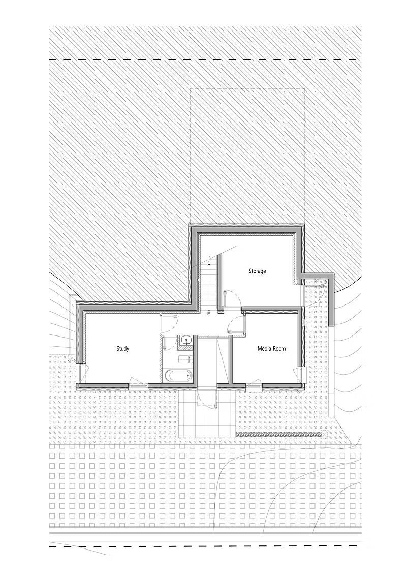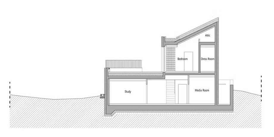 주방 건너편 안방 영역은 침실과 드레스룸과 안방화장실과 다락으로 이루어져 있습니다. 옷과 짐을 수납공간으로 치워 침실을 깨끗하게 유지하고 싶었습니다. 앞집 너와지붕 너머의 풍경을 바라보며 남쪽의 데크로 나갈 수 있습니다. 안방과 식당은 남쪽을 향해 나란히 놓였습니다. 계단을 따라 내려간 1층은 2층과 다르게 경사를 등지고 동쪽을 향해 나란히 놓입니다. 2층이 풍경을 향했다면 1층은 지형을 따른 셈입니다. 계단은 1층 현관과 직접 이어지도록 배치했습니다. 계단을 오르면 오른편의 큰 창을 통해 남쪽 마당이 보입니다. 1층 현관 양 옆에는 서재와 영상실을 배치했습니다. 안방의 일부분이었을 기능을 때어내 서재를 만들고 거실의 일부분이었을 기능을 때어내 영상실을 만들었습니다. 기능마다 별도의 방을 만들어 각자의 기능이 더욱 충실해지도록 배려했습니다. 현관에서 각 방으로 갈라지고 계단을 통해 2층으로 올라가니 동선도 각자 따로입니다. 지금은 모든 방이 주인 부부의 것이지만 나중에 방의 역할이 달라져도 이상하지 않도록 영역의 독립성도 챙겼습니다.