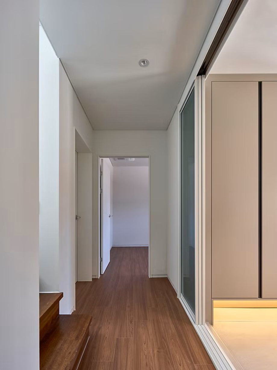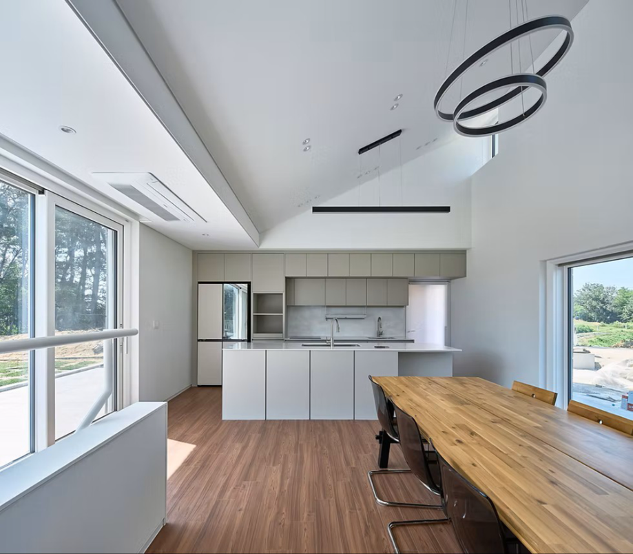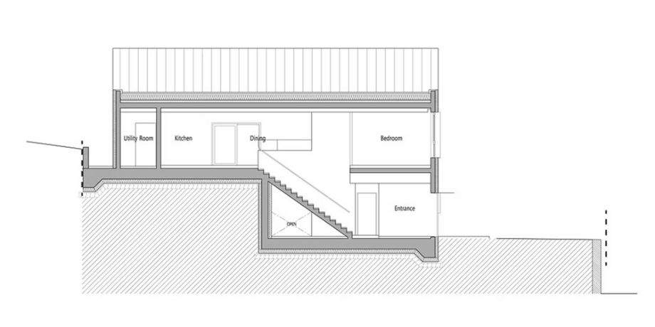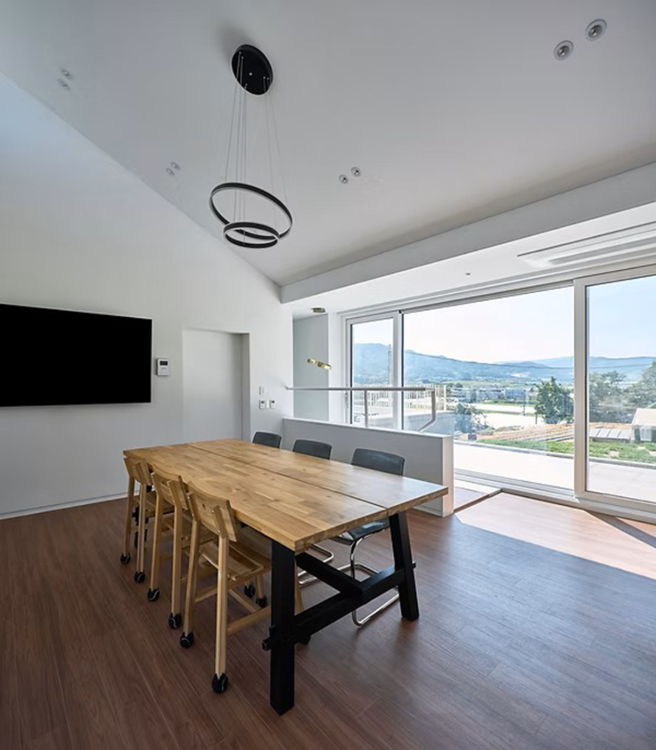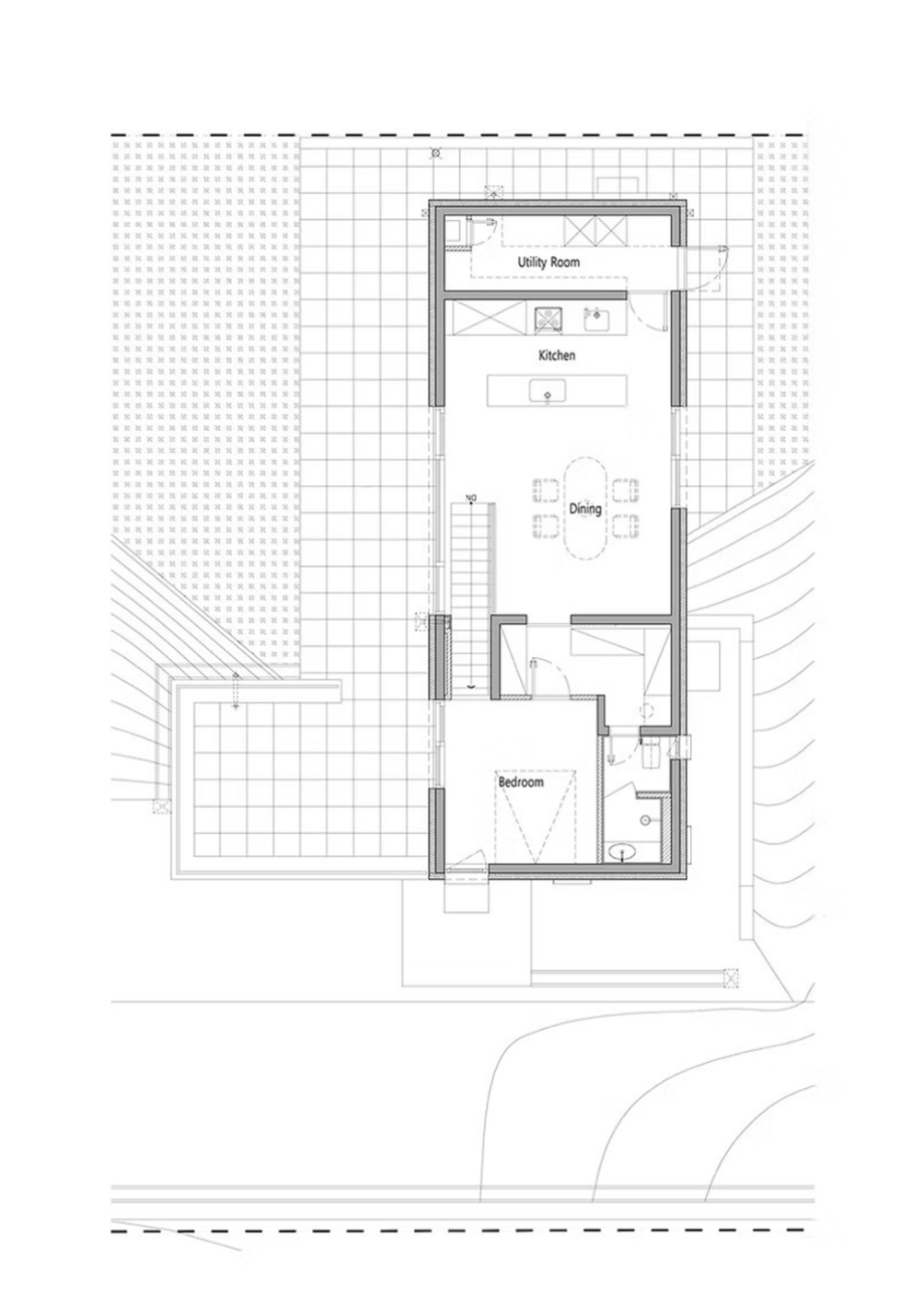 부부의 주무대인 식당과 주방입니다. 북쪽의 도로에 닿아있고 남쪽의 언덕 위 마당으로 이어지는 공간입니다. 주방에서 바라보면 양쪽으로 큰 창이 나 있고, 식당 건너편에 안방이 보입니다. 식탁과 창문 사이에 1층으로 내려가는 계단이 있습니다. 계단과 안방 사이의 유리블럭을 통해 서로의 인기척을 느낄 수 있습니다. 경사 지붕의 끝에는 부드럽고 균일한 빛이 들어오는 북향창이 나 있습니다. 이 모든 장면을 한 눈에 담을 수 있는 아일랜드 주방이 단연 공간의 주인입니다. 주방의 뒤편에는 제법 큰 다용도실이 자리했습니다. 다용도실을 통해 2층 현관으로 나갈 수 있습니다. 2층 현관 앞에는 짐 부리기 좋도록 잠깐 주차할 수 있는 작은 공터를 만들었습니다. 2층 집이지만 2층에도 차를 댈 수 있습니다. 경사지에서만 누릴 수 있는 특혜입니다.