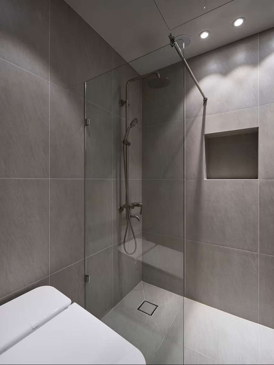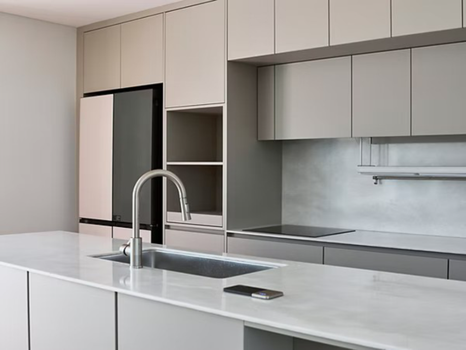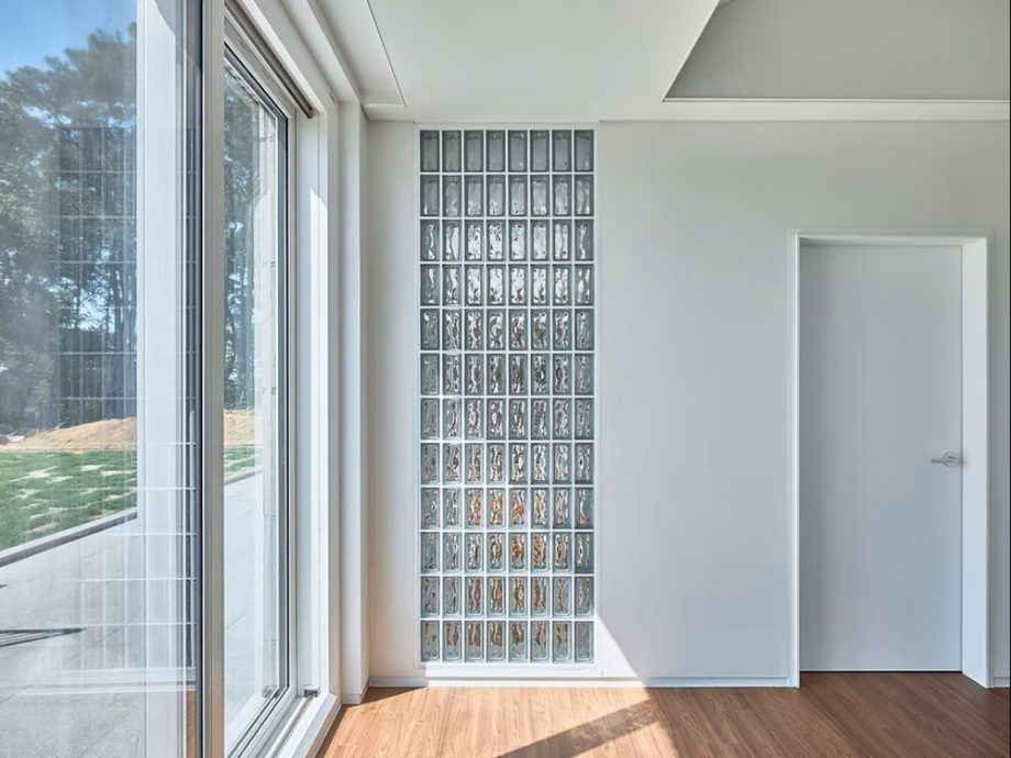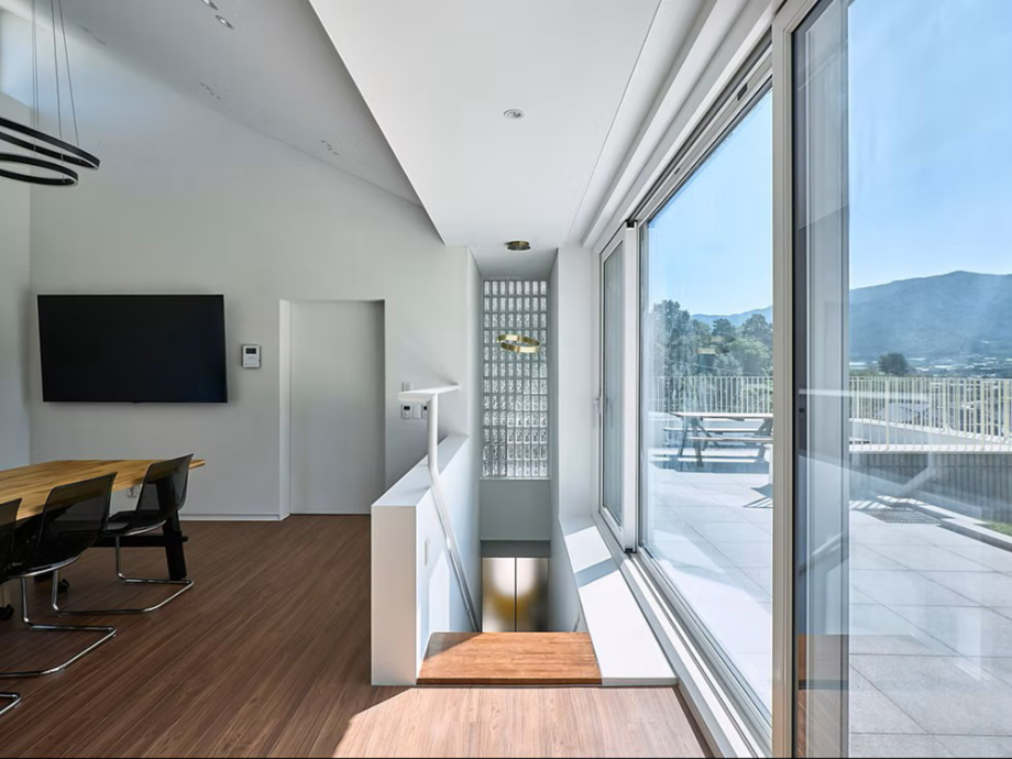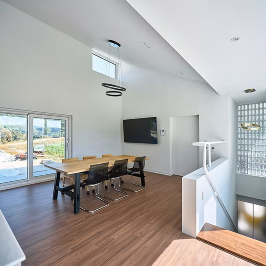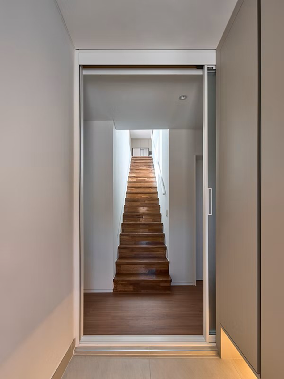 부부의 주무대인 식당과 주방입니다. 북쪽의 도로에 닿아있고 남쪽의 언덕 위 마당으로 이어지는 공간입니다. 주방에서 바라보면 양쪽으로 큰 창이 나 있고, 식당 건너편에 안방이 보입니다. 식탁과 창문 사이에 1층으로 내려가는 계단이 있습니다. 계단과 안방 사이의 유리블럭을 통해 서로의 인기척을 느낄 수 있습니다. 경사 지붕의 끝에는 부드럽고 균일한 빛이 들어오는 북향창이 나 있습니다. 이 모든 장면을 한 눈에 담을 수 있는 아일랜드 주방이 단연 공간의 주인입니다. 주방의 뒤편에는 제법 큰 다용도실이 자리했습니다. 다용도실을 통해 2층 현관으로 나갈 수 있습니다. 2층 현관 앞에는 짐 부리기 좋도록 잠깐 주차할 수 있는 작은 공터를 만들었습니다. 2층 집이지만 2층에도 차를 댈 수 있습니다. 경사지에서만 누릴 수 있는 특혜입니다.