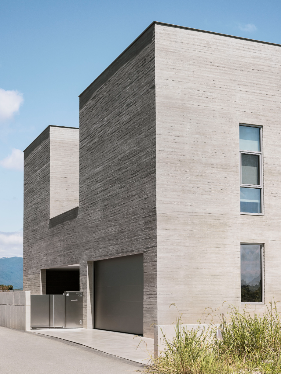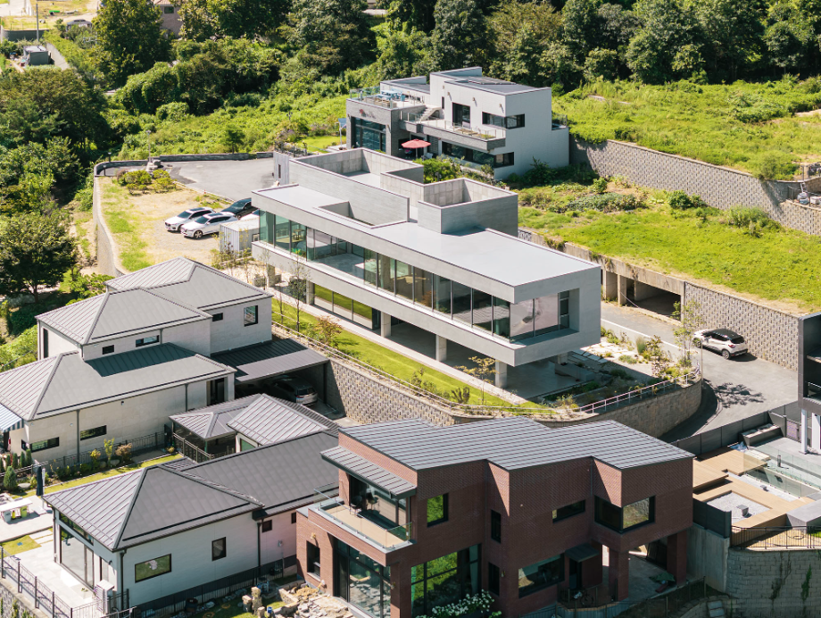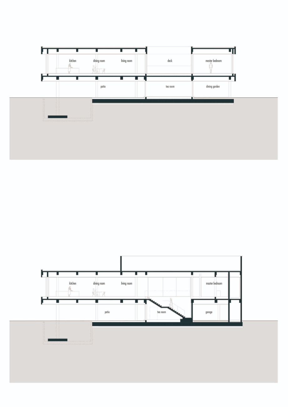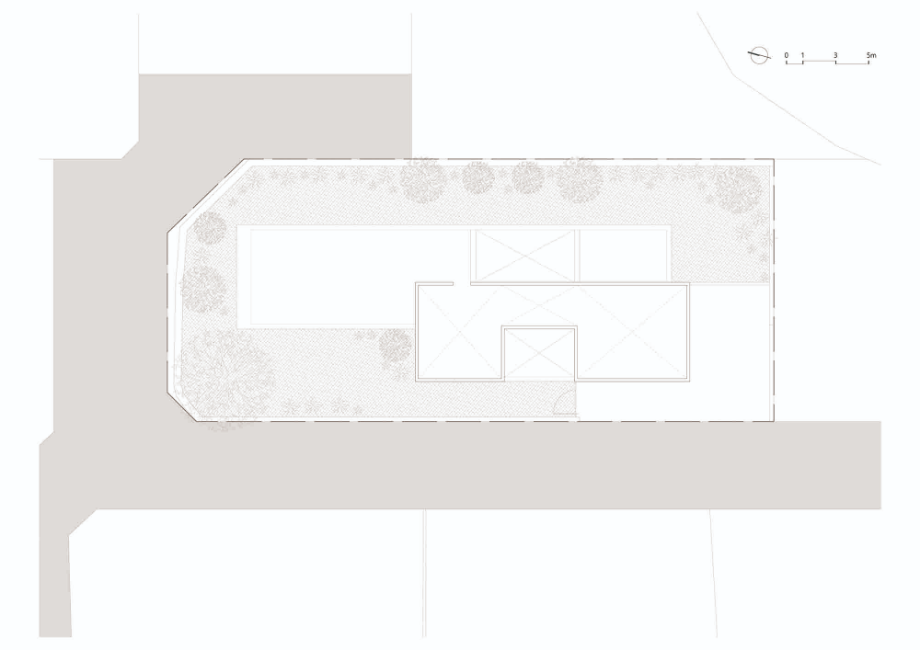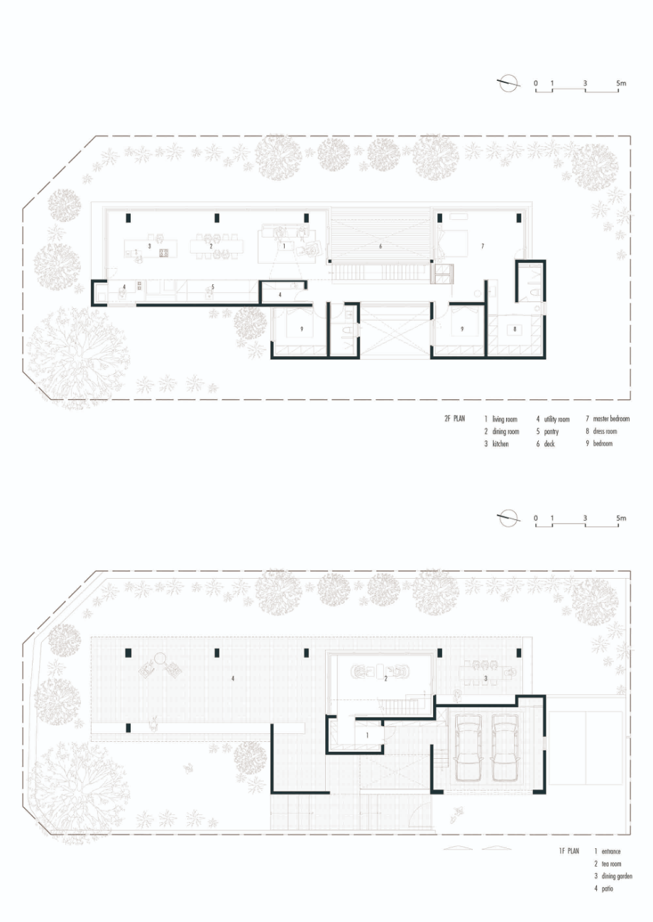 강을 따라 펼쳐진 긴 매스를 한 개층 들어 올려 2층에 주요 생활 공간들을 계획했다. 메인 공간들을 강이 잘 보이는 동쪽으로 배치하고, 서브 공간들을 서쪽 도로변으로 배치함으로써 동쪽은 개방적 입면을, 서쪽은 비교적 폐쇄적 입면을 가지는 모습이 되었다. 매스를 들어올림으로써 비워진 1층은 너른한 정원과 현관 및 다실, 차고로 구성되어있다.