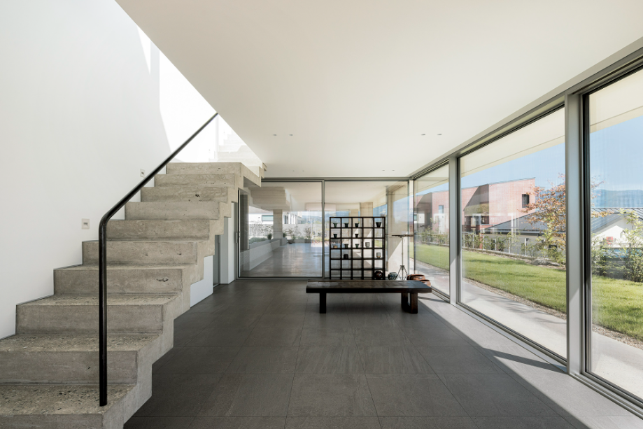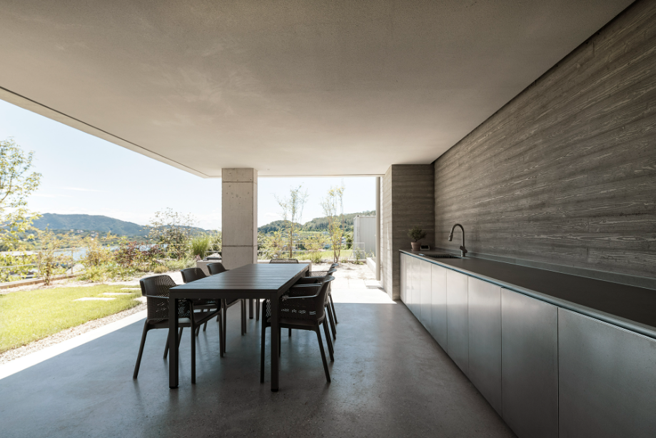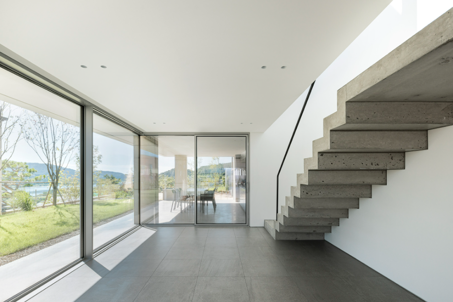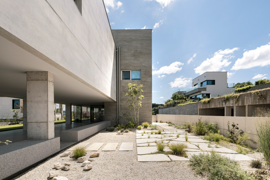 다실 왼편으로 펼쳐지는 파티오(patio)는 너른한 그늘 마당으로 1층이지만 누각에 올라 강을 내려다보는 기분을 주는 공간이다. 오른편으로는 간단한 야외 주방과 다이닝 테이블을 계획하였다. 2층으로 올라가는 실내 계단은 노출콘크리트로 마감하고 천장과 바닥 재료도 외부 재료의 톤과 연결시켜 반외부공간처럼 느껴지도록 했다.