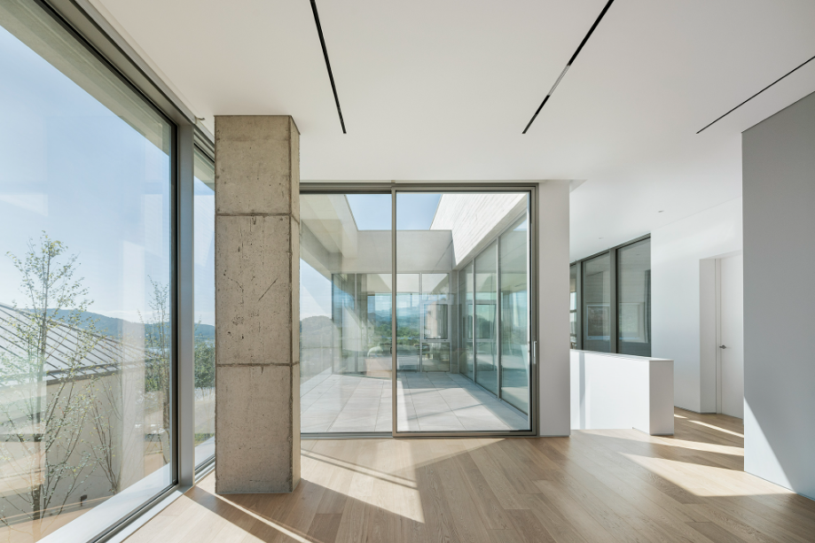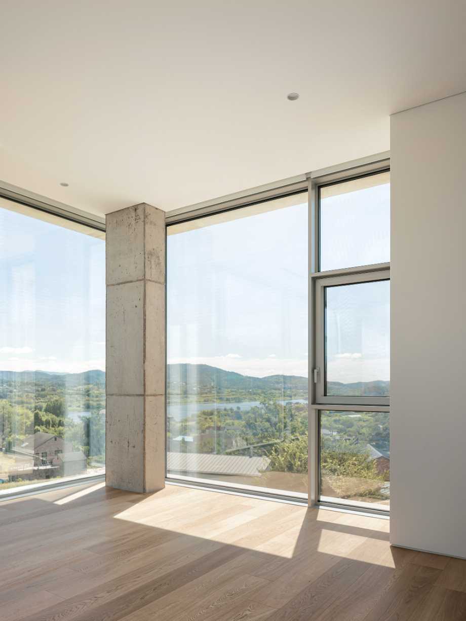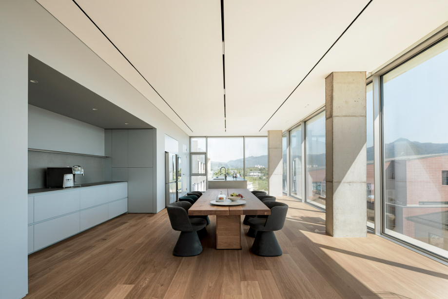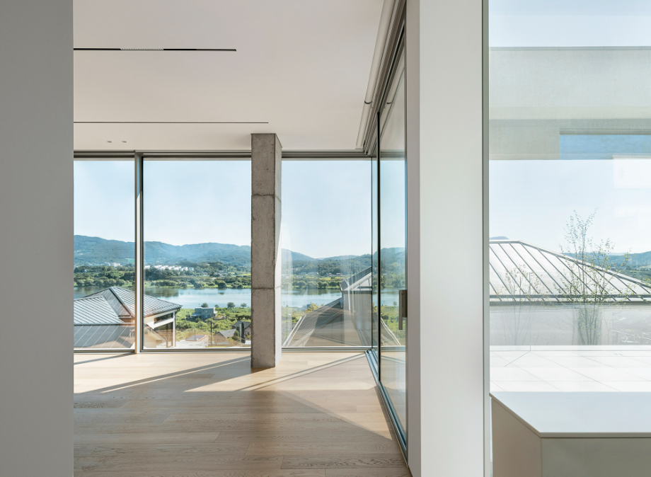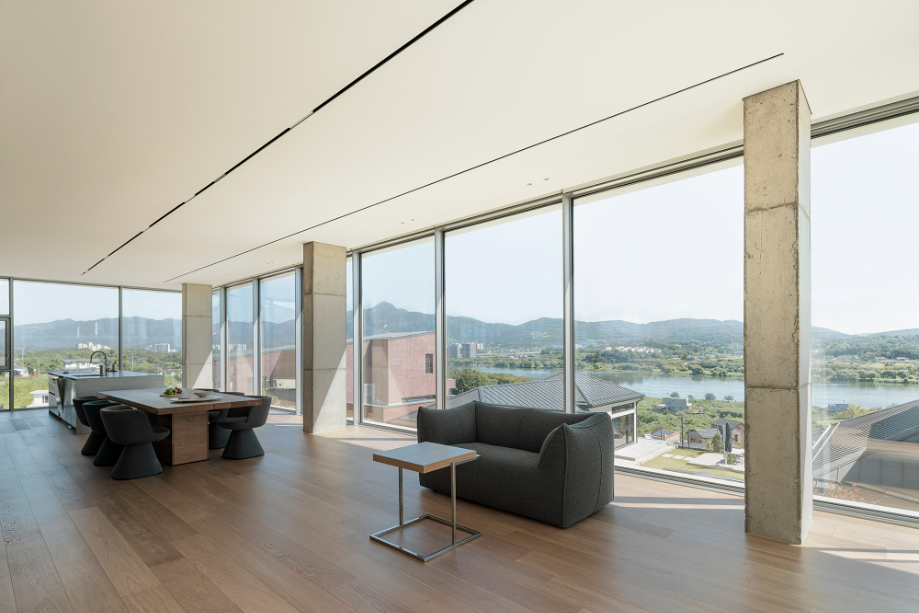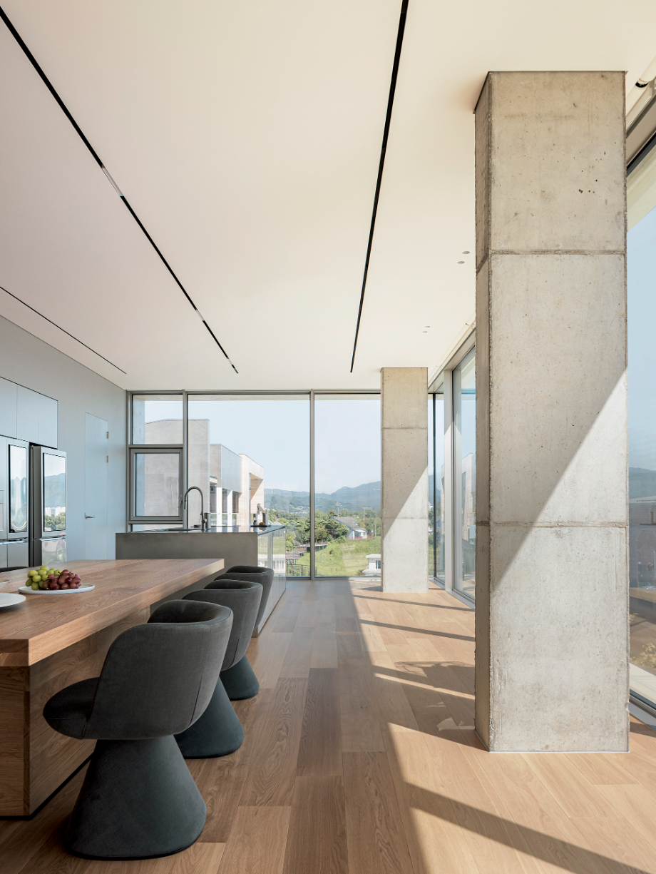 원목마루와 친환경페인트로 마감하고 다용도실, 팬트리, 화장실 쪽의 벽은 실버 가전 제품과 비슷한 톤의 페인트로 마감했다. 1층에서부터 올라오는 노출콘크리트 기둥은 남한강 풍경을 담은 통창과 어우러져 외부공간 같은 개방감을 주고 있다.
