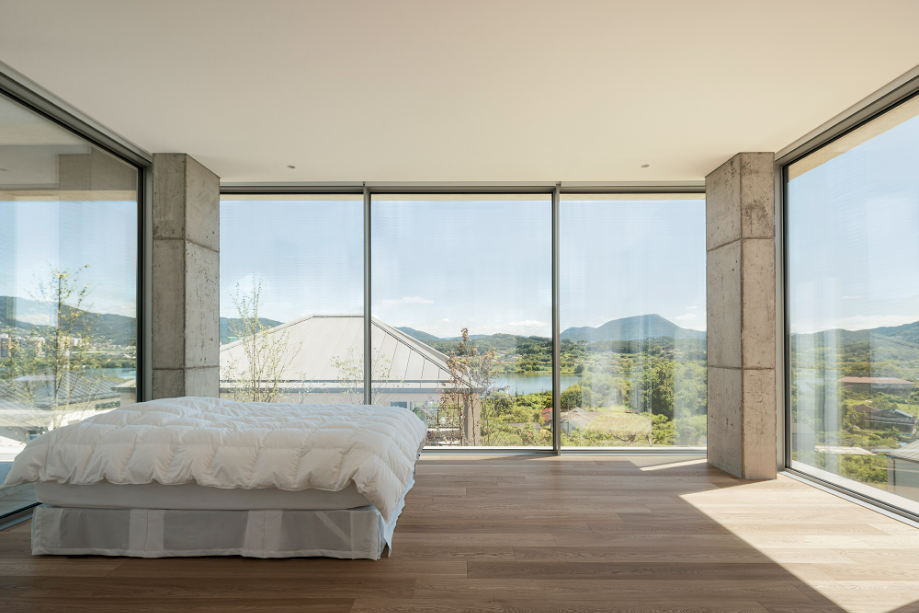 다실은 1층에 있는 유일한 내부 공간으로써. 현관으로 들어와 2층 공간으로 올라가는 길에 만나는 관문이자 사랑방이다. 사적 공간을 거치지 않고 손님 맞이가 가능한 다실은 삼면이 통창으로 개방되어 정원으로 둘러싸여 있다. 내부 공간이지만, 사방이 탁 트인 정자에 앉아 있는 듯 한 개방감을 느낄 수 있다. 강을 향해 앉았을 때, 다실 양옆으로 펼쳐지는 반외부공간은 다실 영역이 확장되는 듯한 느낌을 준다.