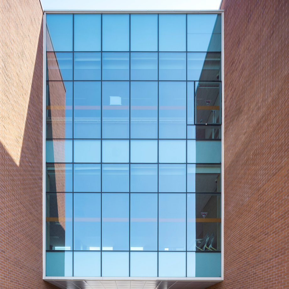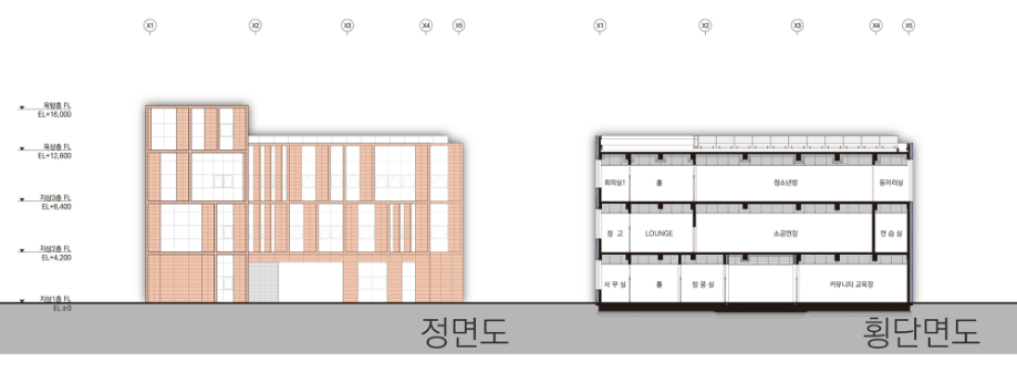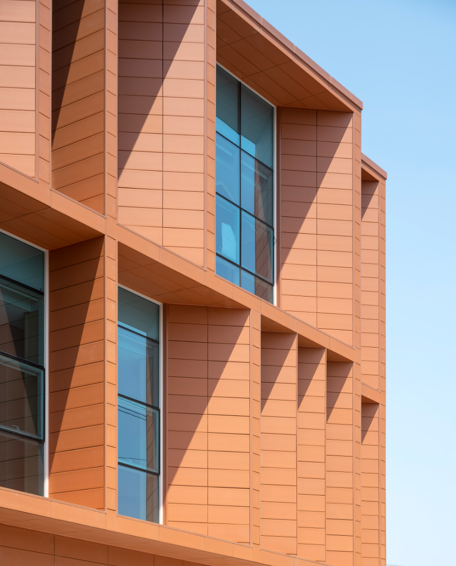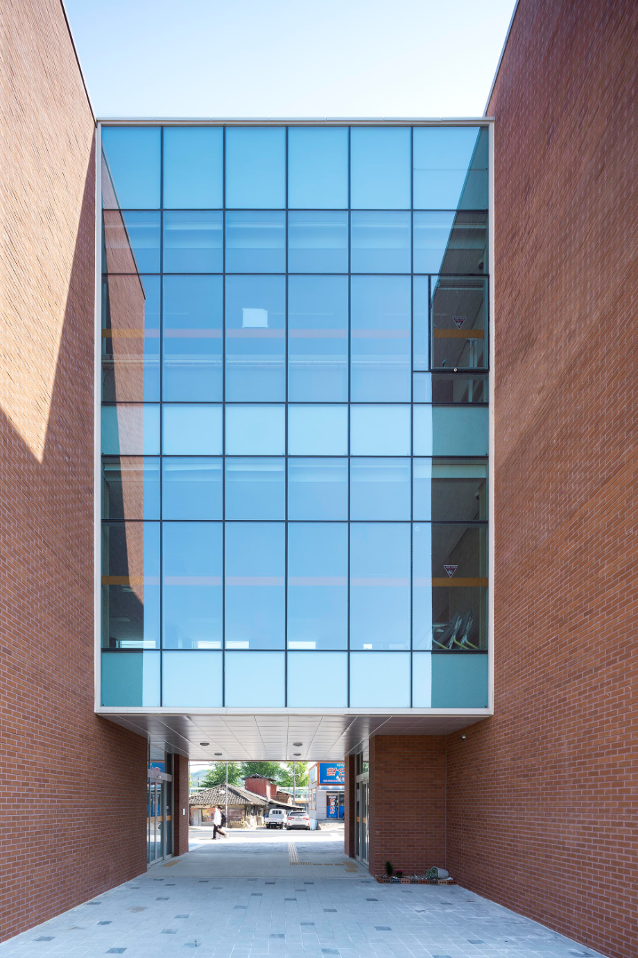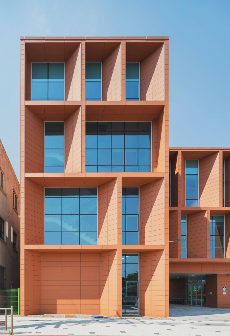 파사드는 벽돌과 테라코타, 두 물질의 대화를 통해 전의의 역사적 시간과 오늘의 활력을 연결하는 표면으로 구성되었다. 짙은 붉음이 담긴 벽돌은 마을의 기억을 품고, 밝은 오렌지 톤의 테라코타는 청소년의 생동감과 미래를 상징한다. 두 재료의 조율은 과거와 현재, 무게와 가벼움이 공존하는 균형의 언어로 작동한다.
