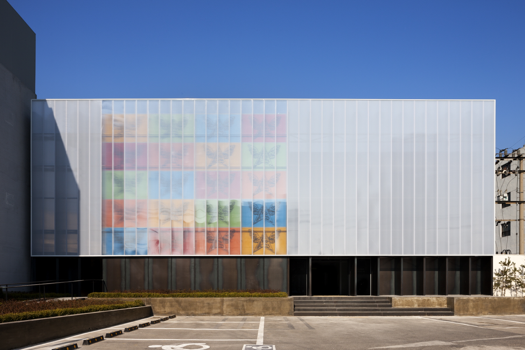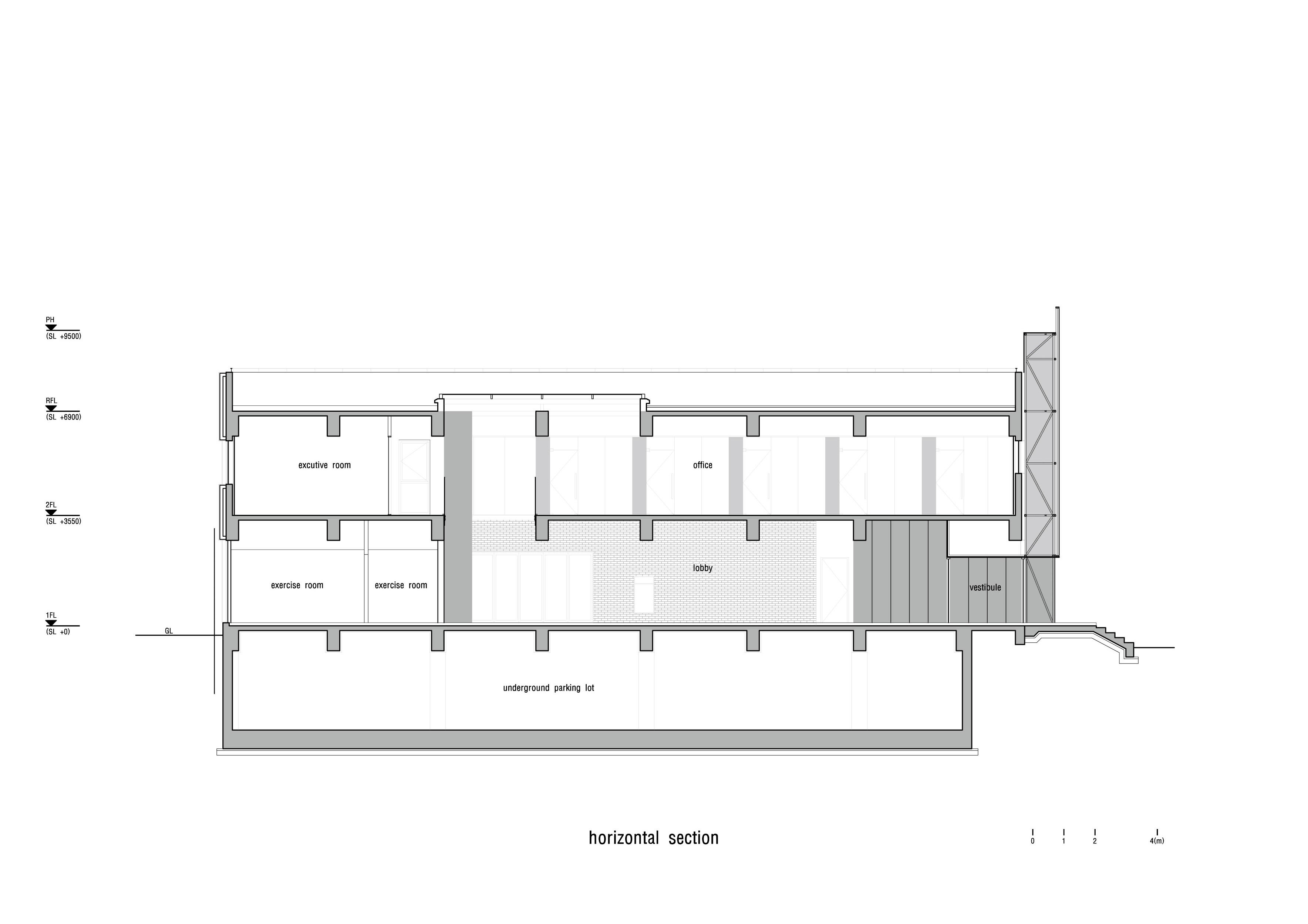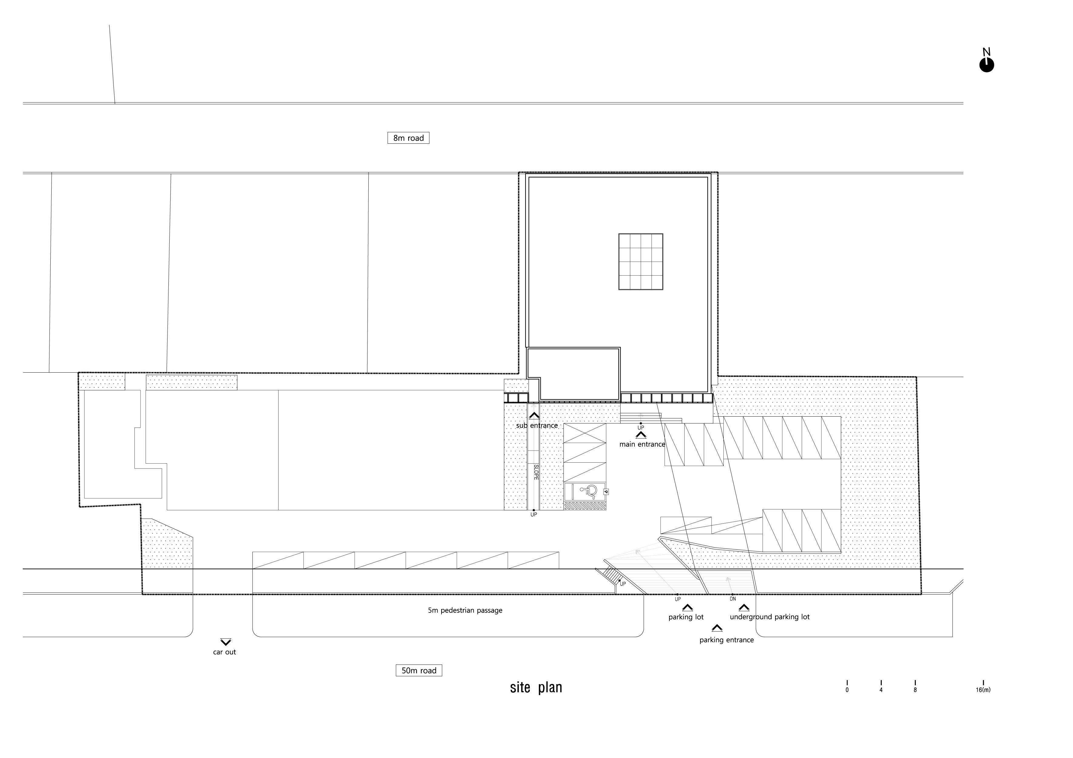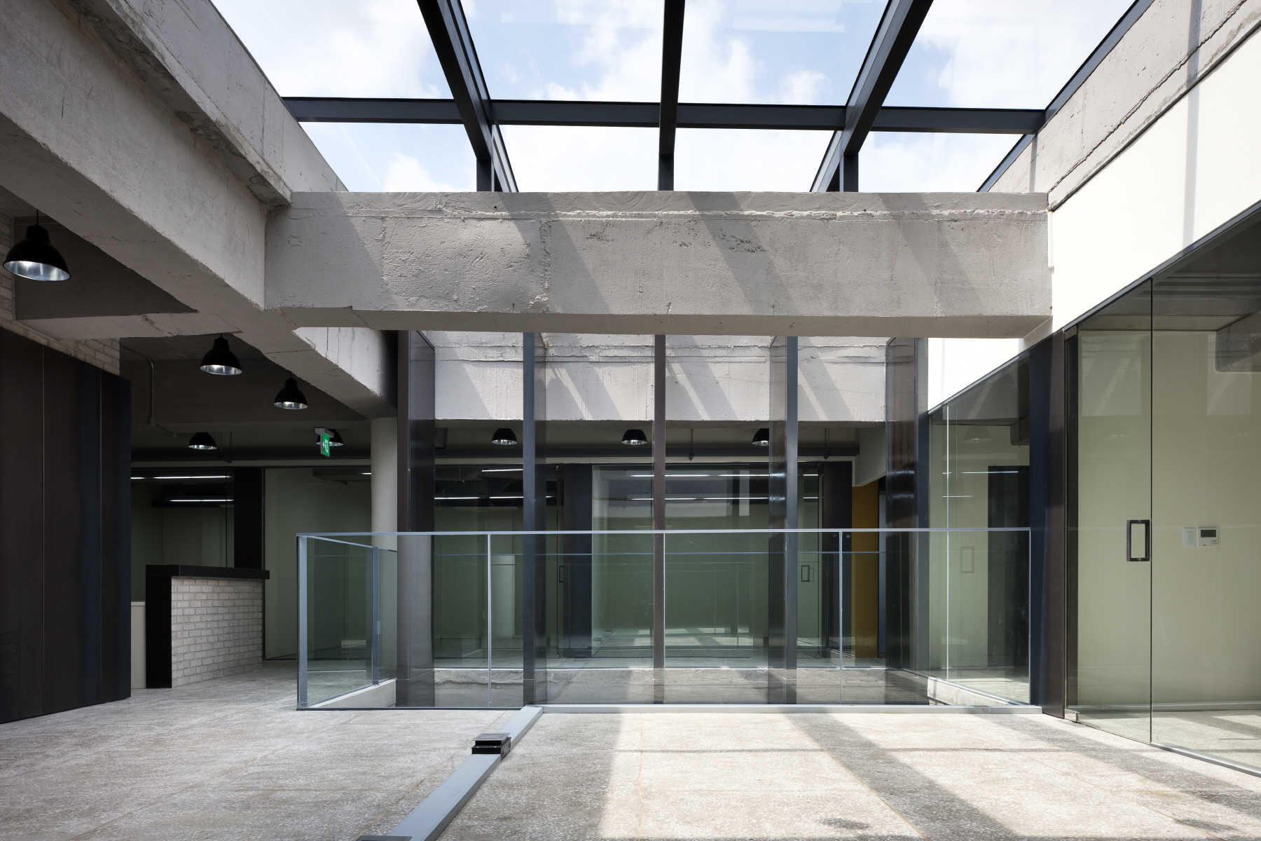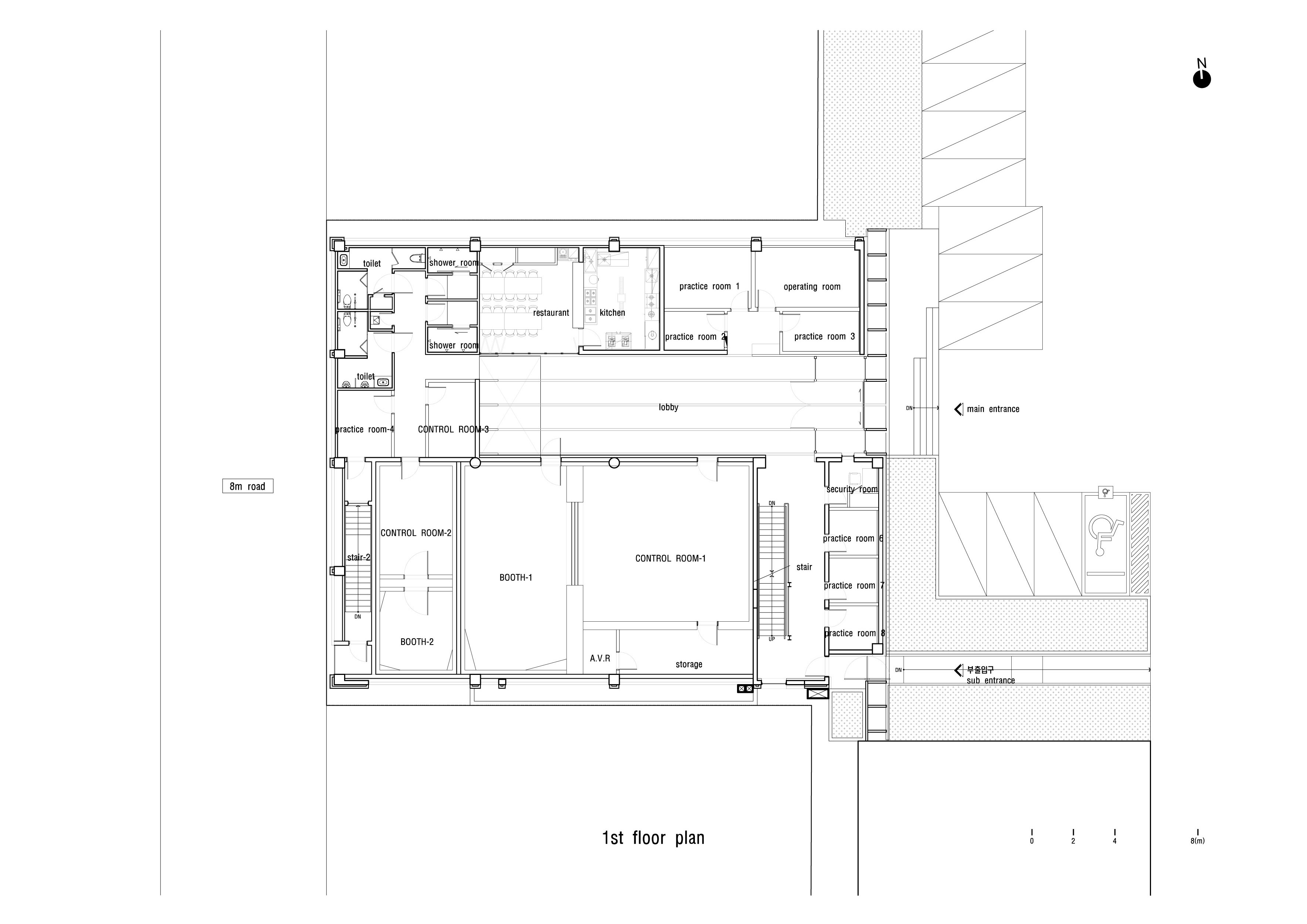 1층으로 들어서면 넓고 긴 라운지가 제일 먼저 보인다. 출입구의 천정고는 낮으며 라운지 바닥에는 철판을 접어 만든 레이스선이 그려져 있다. 건물의 출입구는 스타가 되기 위해 치열하게 노력하는 연습생을 위한 출발선인 것이다. 레이스의 끝에는 천장까지 열려진 중정을 통해 따뜻한 햇살이 비춘다. 원래 카리프트(Car Lift)와 물탱크 실이었던 자리에는 계단실이 들어갔다. 콘크리트 부스러기가 떨어질 정도로 거칠고 오래된 벽이지만, 그래서 오히려 정겹다.