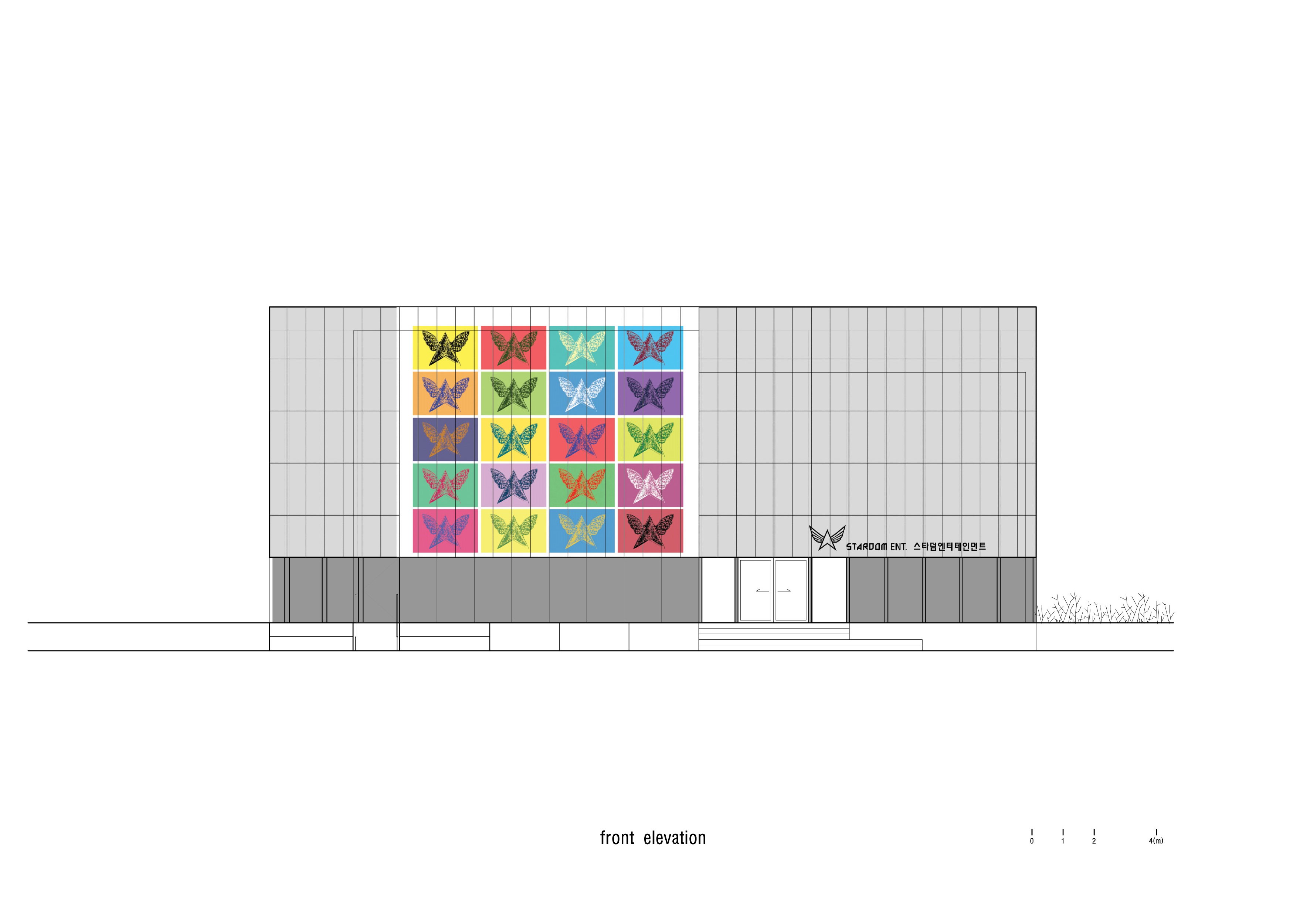 기존 외부마감은 타일과 드라이비트가 섞여 있었다. 여러 차례의 덧대기로 누더기처럼 보이지만 한편으론 독산동 우시장의 세월의 흔적이다. 오랫동안 풍파에 쓸려 여기저기 구멍이 나있고 부서진 곳도 많았지만 간단한 손질 후에 페인트도장으로만 마감을 했다. 전면에 반투명한 폴리카보네이트 패널을 덧대고, 그 안에 스타덤의 창립자인 조PD의 은퇴앨범 자켓 사진을 그래피티(Graffiti)한 것이 건물에 입힌 유일한 사치이다. 반투명의 외피 안에 그래피티 이미지는 힙합음악으로 대표되는 스타덤의 브랜드이미지이며, 독산동의 새로운 변화를 상징한다. ■